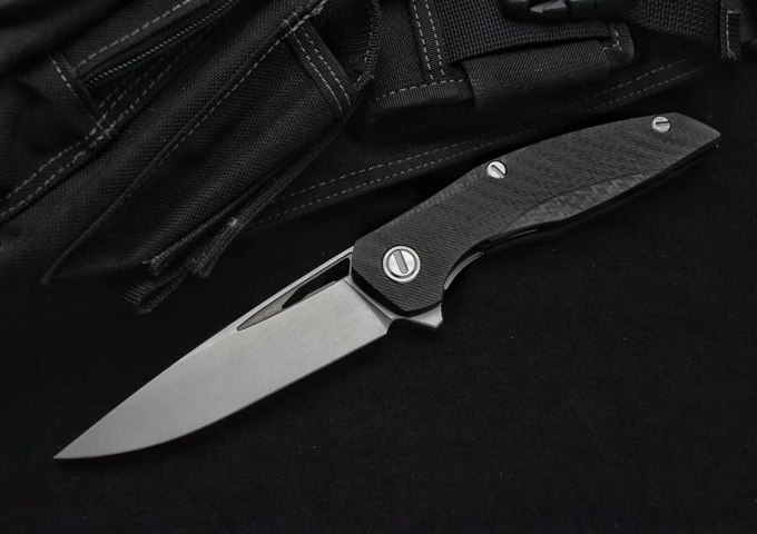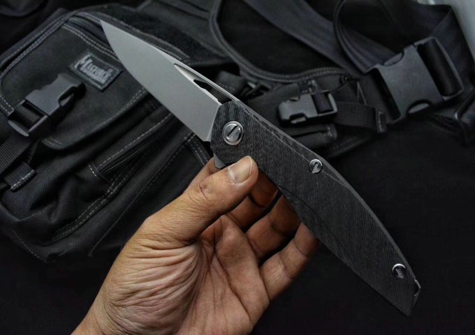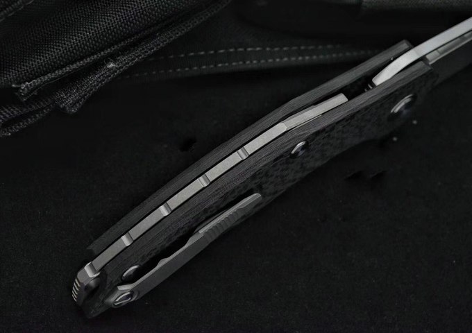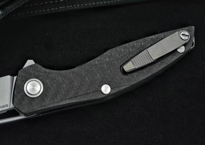 熊头迪版F111折刀 打开全长:24.8厘米 刀片长:9.8厘米 闭合长度:15.2厘米 刀片厚度:4毫米 刀片宽度:3.1厘米 刃材:粉末钢S35VN 手柄材质:碳纤维,钢内衬片 硬度:59-60HRC 刀片表面处理:喷砂石洗 主轴系统:KVT滚珠轴承(陶瓷珠) 净重量:约154g