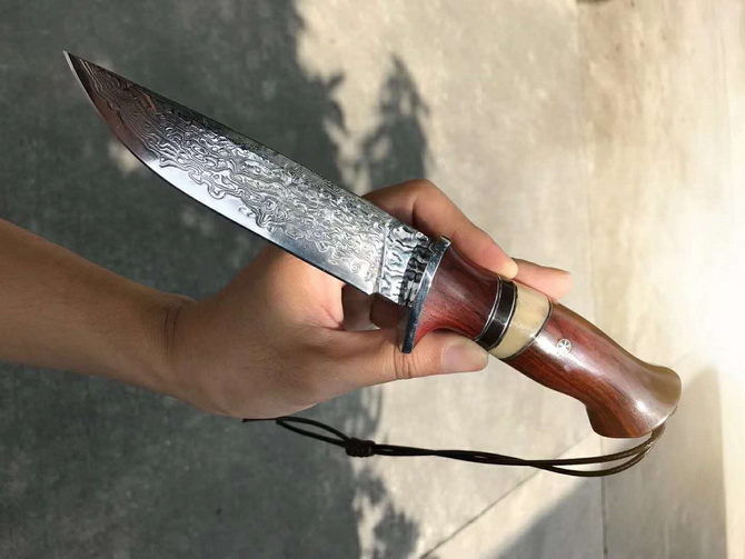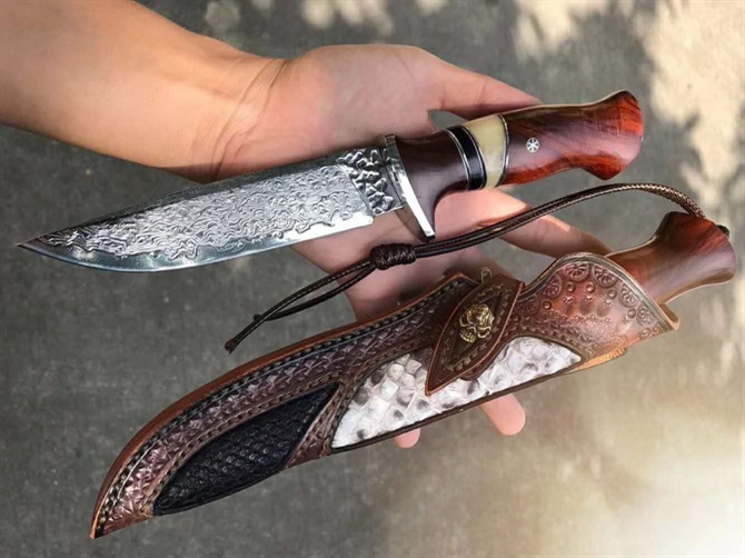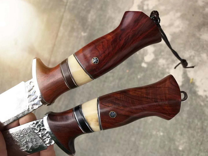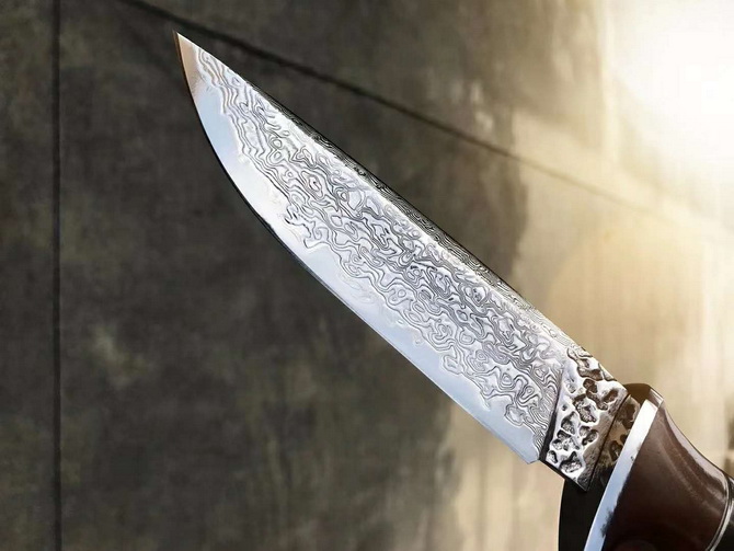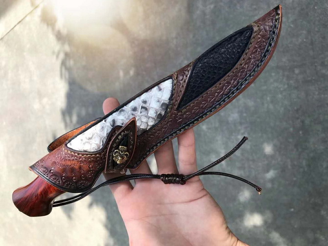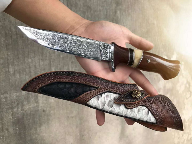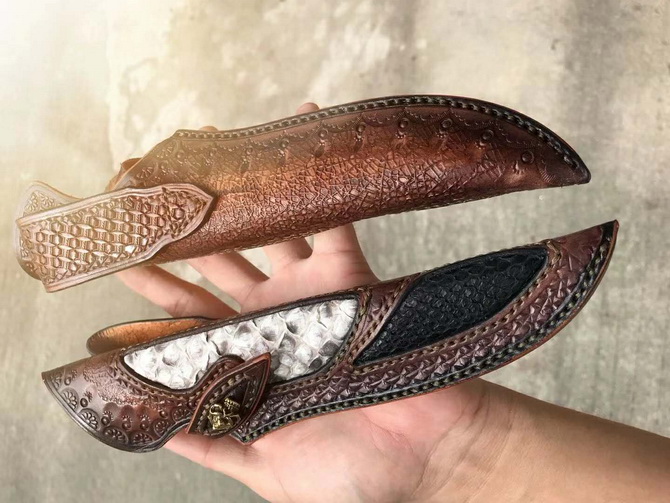 大马士革北欧至尚直刀 总长:26cm 刃长:13cm 刃厚:4mm 刃宽:3cm 钢材:台湾公司提供日本夹层VG10大马士革钢芯锻造 硬度:60-61HRC 热处理:真空深冷热处理 开刃方式:手工二次开刃 柄材:进口黄檀木+驼骨+黑檀木 皮套:阿根廷进口植鞣皮、手工制作缝线雕花+镶嵌蛇皮 包装:手工盒子包装