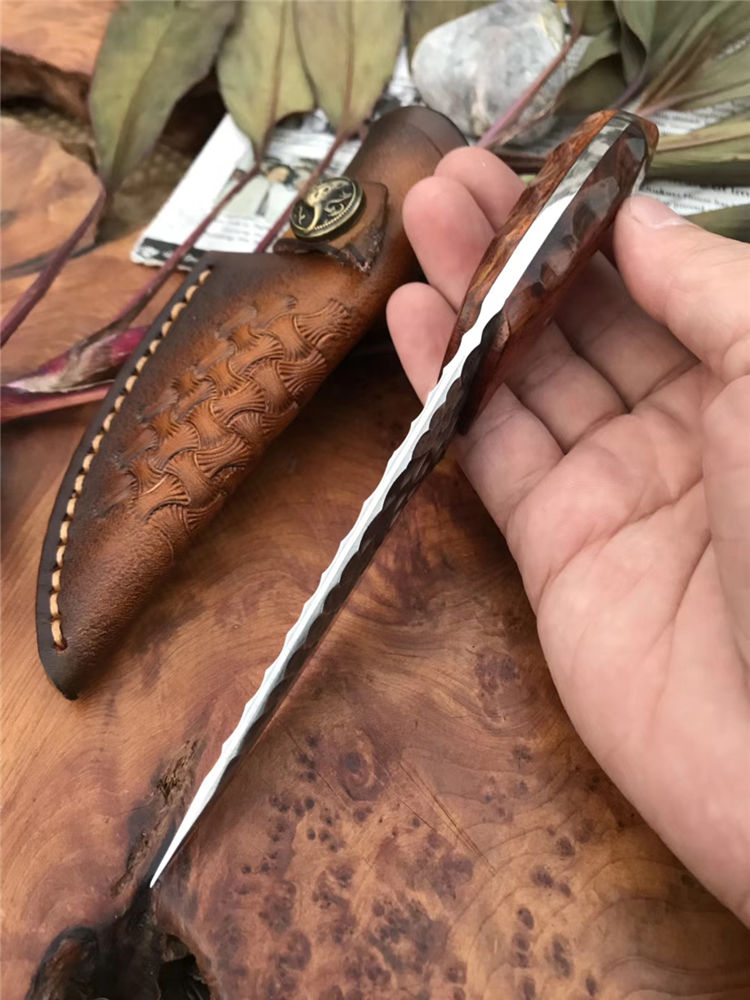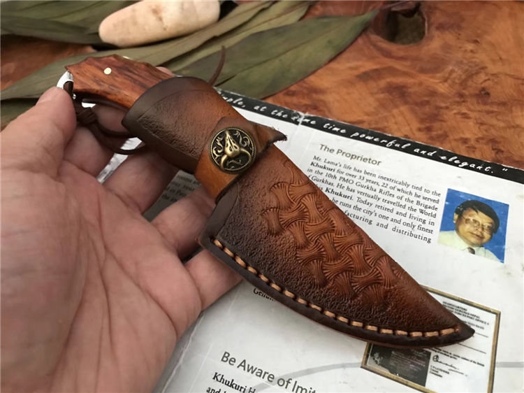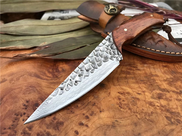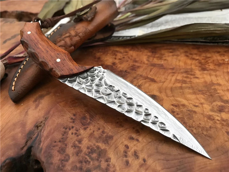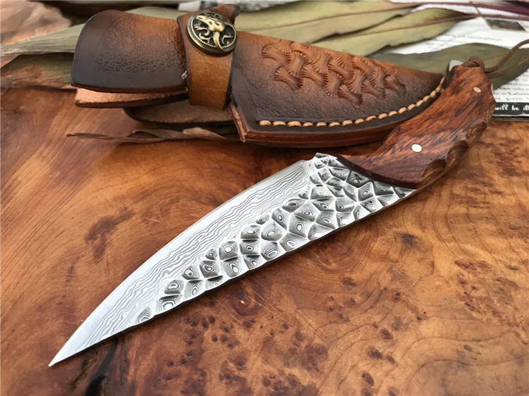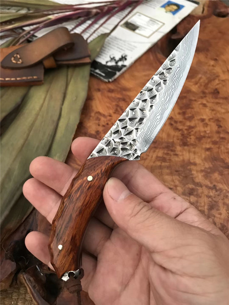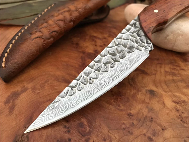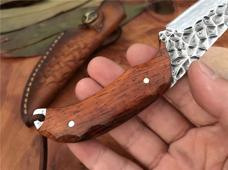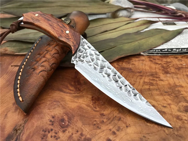 资深刀匠制作,采用进口大马士革钢VG10刃材一体龙骨结构设计,非常安全牢固,高端品质看图做工细节非常精致、边角修磨完美无暇、深度真空热处理、韧性强,高硬度刃口,刀面弹坑精致雕刻,有着不一样质感享受,手柄采用进口黄檀木,防滑纹,手感非常好,意大利进口手工缝制皮套。