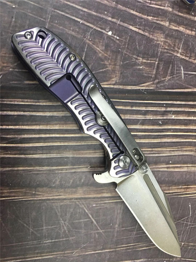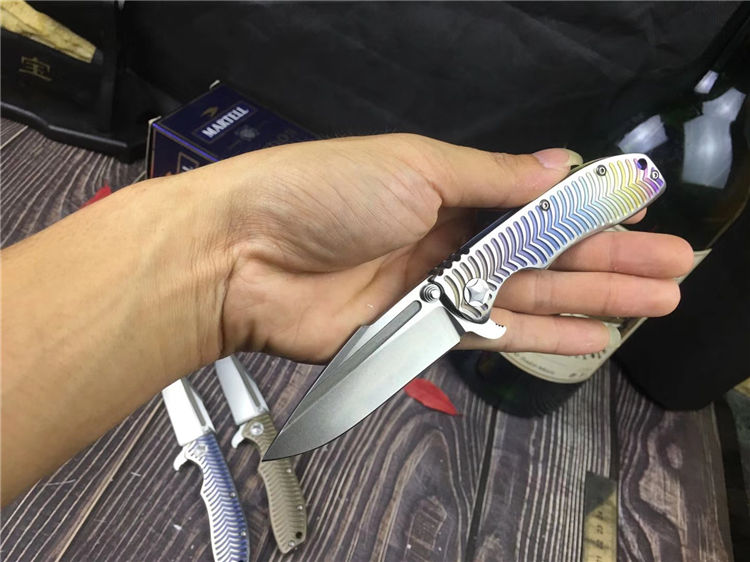 鲸鲨钛合金折刀 全长:19cm 刃长:8.5cm 柄长:10.5cm 刃宽:2.8cm 刃厚:3.3mm 刃材:进口N350钢 硬度:58-60HRC 表面:真空镀钛处理 柄材:正反面钛合金柄 锁型:线锁