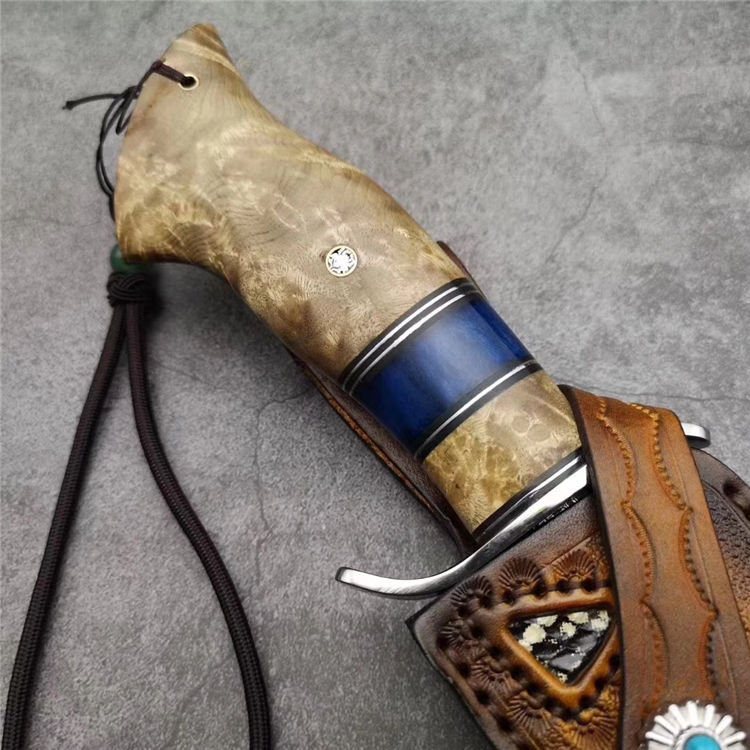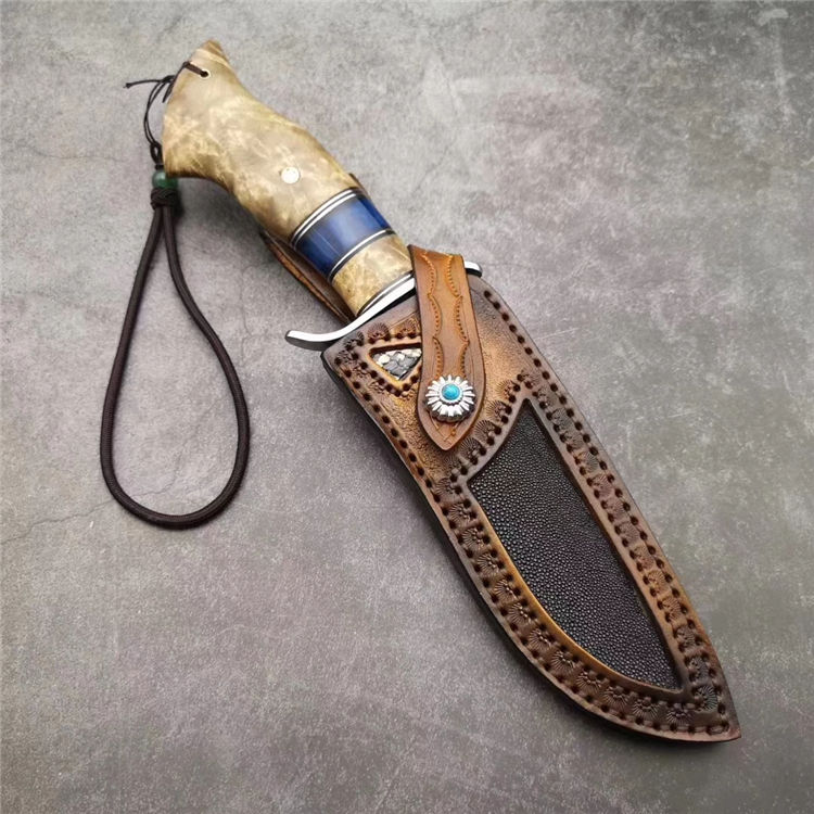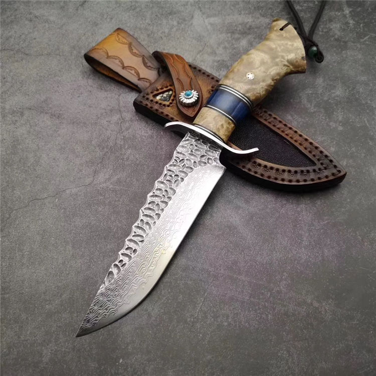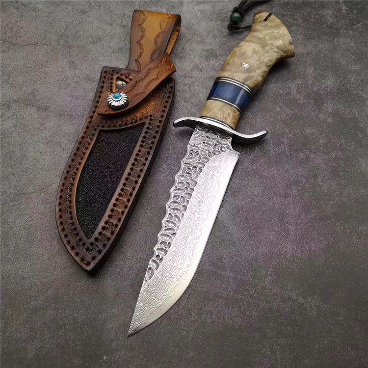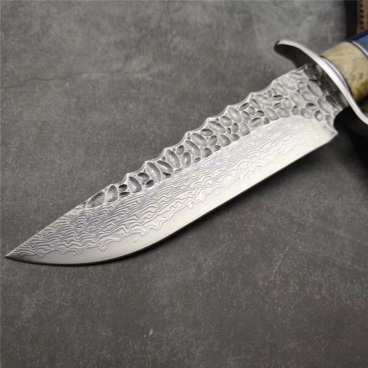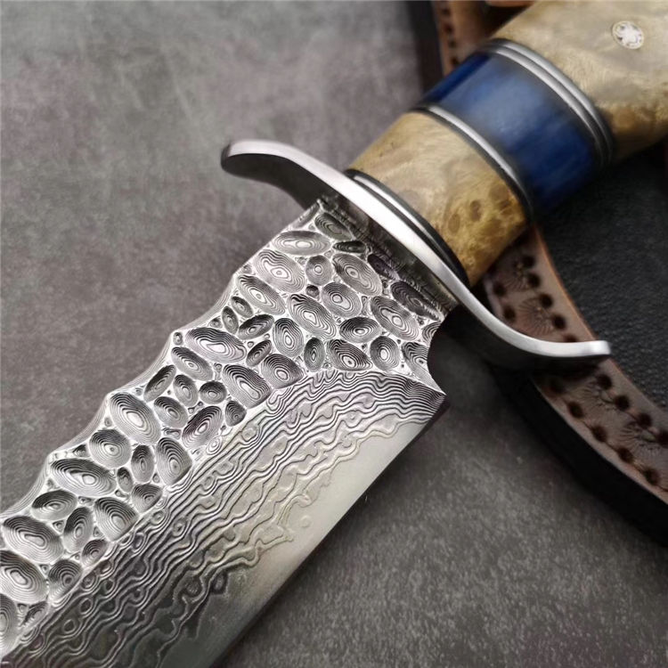 大马士革博弈直刀 总长:28.5cm 刃长:15cm 刃厚:3.5mm 刃宽:3.5cm 钢材:日本夹层大马士革钢(钢芯层67层VG10钢) 表面:抛光效果雕刻陨石坑工艺 热处理:真空热处理 硬度:58-60HRC 柄材:稳定化白影木和牛骨隔片 包装:手工盒子包装 皮套:镶嵌珍珠鱼皮手工缝线植鞣牛皮鞘 白影木加牛骨隔片/纯手工制作/每一把是独一无二,S型护手安全帅气,具有很好的收藏价值,送礼佳品