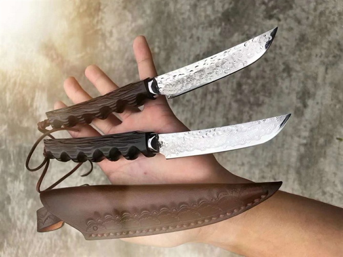 大马士革毛毛虫武士刀 总长:21.5cm 刃长:9cm 刃宽:1.8cm 刃厚:2.5mm 钢材:VG10锻造大马士革钢 硬度:59-60HRC,真空热处理 表面效果:抛光保留锻造锤纹效果 柄材:进口黑檀乌木,纯手工雕刻 皮套:意大利纯手工雕刻手工缝线植鞣皮