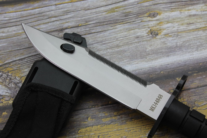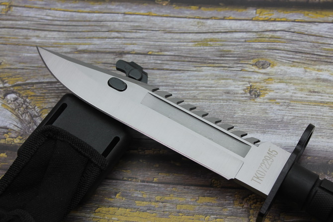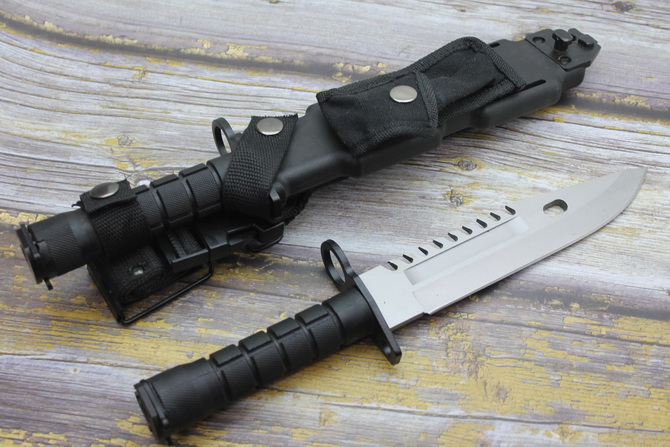 高仿黑色柄D80和M9军刀 类型:中型直刀 品牌:d80和M9 全长:32cm 刃长:19.8cm 刃厚:5.9mm 刃材:4CR13 硬度:56HRC 重量:刀410g+鞘400g 表面:钢本色 柄材:ABS 刀鞘:ABS 其它:锋利
