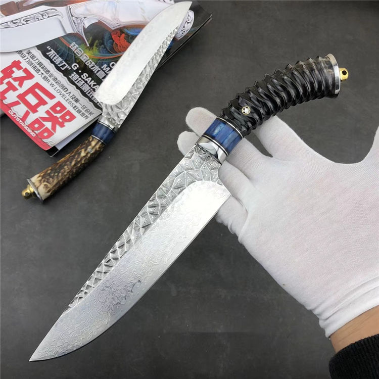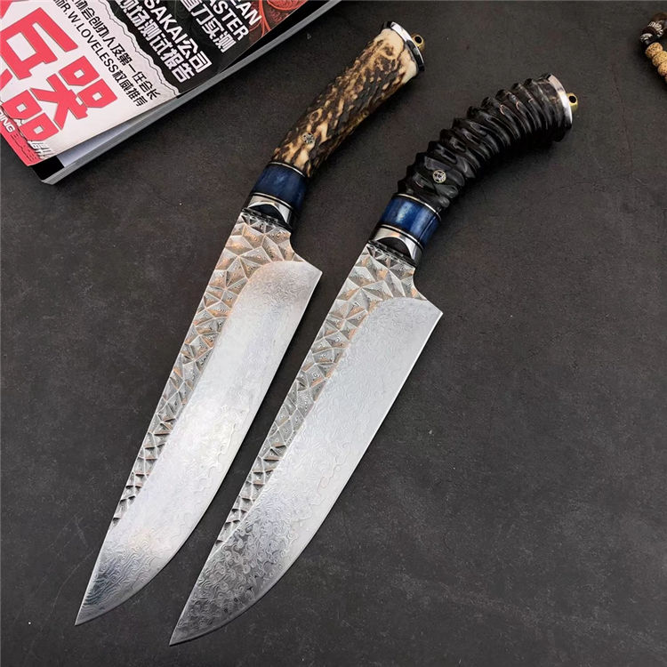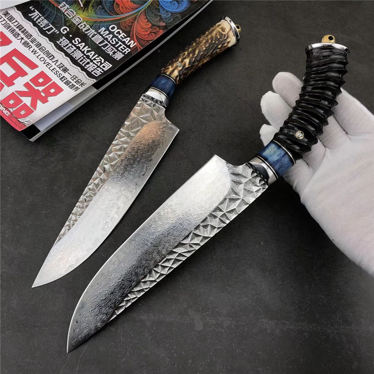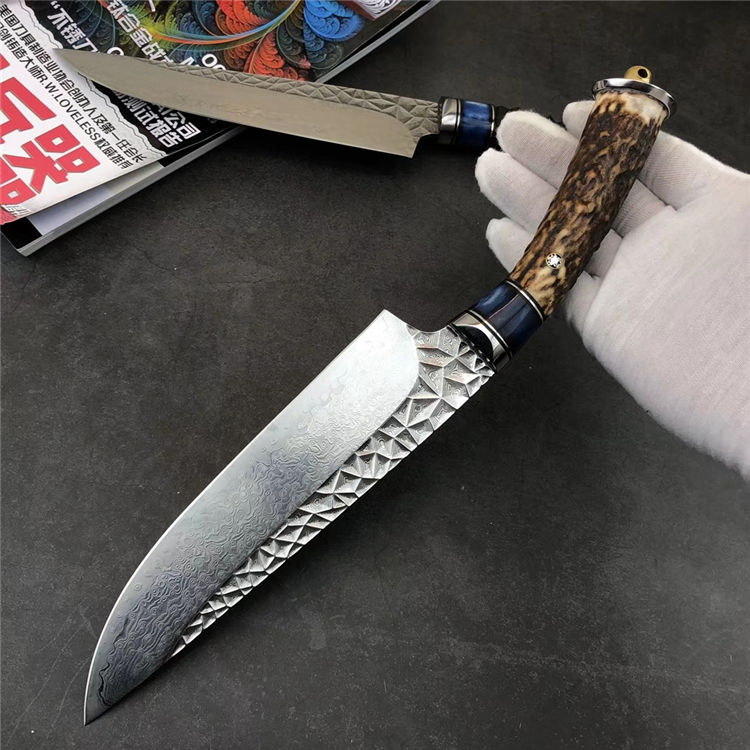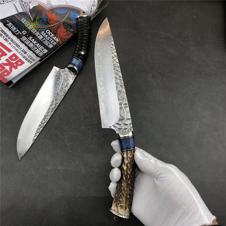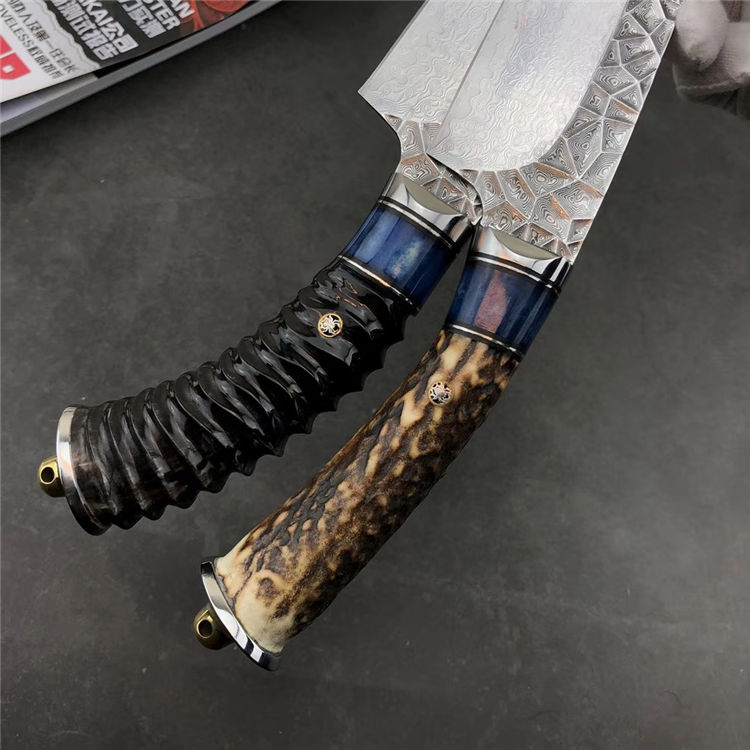 大马士革砖石高端手工厨刀 总长:31cm 刃长:18cm 刃厚:2.5mm 刃宽:4.5cm 钢材:日本夹层大马士革钢(钢芯层67层VG10钢) 表面:抛光效果雕刻砖石纹工艺 热处理:真空热处理 硬度:58-60HRC 柄材:野生鹿角,野生黑羊角+蓝牛骨+G10片 包装:手工盒子包装 老客大马厨刀,鹿角柄款与野生黑羊角柄,纯手工制作,每一把是独一无二,野生真鹿角与羊角柄,具有很好的收藏价值,送礼佳品