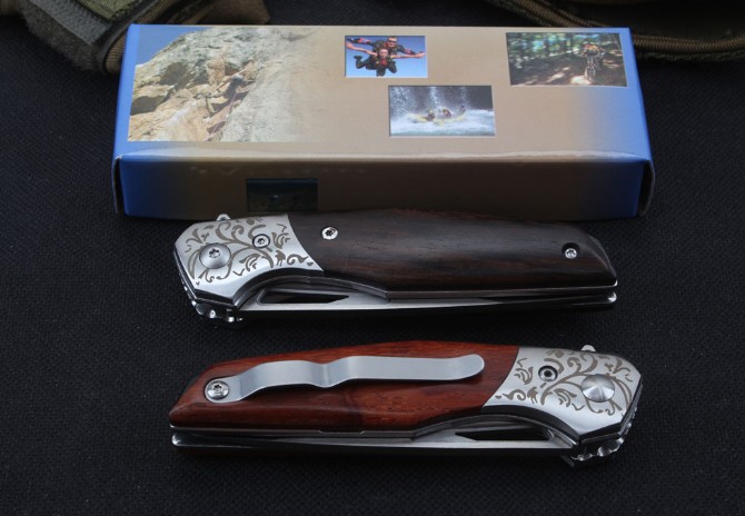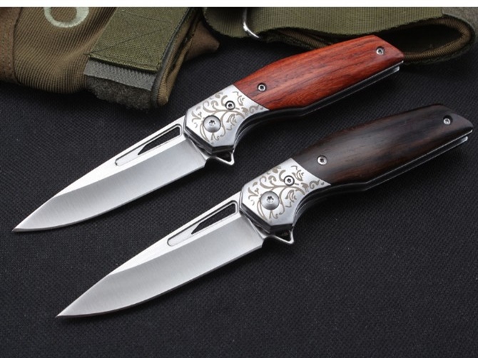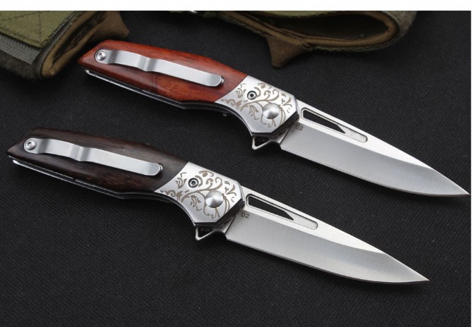 D2钢啄木鸟折刀 品名:D2钢 全长:17.5cm 刃长:7.8cm 柄长:9.7cm 刃宽:2.2cm 刃厚:3.2mm 刃材:D2 重量:140g(含包装) 硬度:57-58HRC 表面:精细沙光 柄材:三D钢头花纹天然酸枝木和黑酸枝两款 锁型:侧锁轴承快开 其他:彩盒