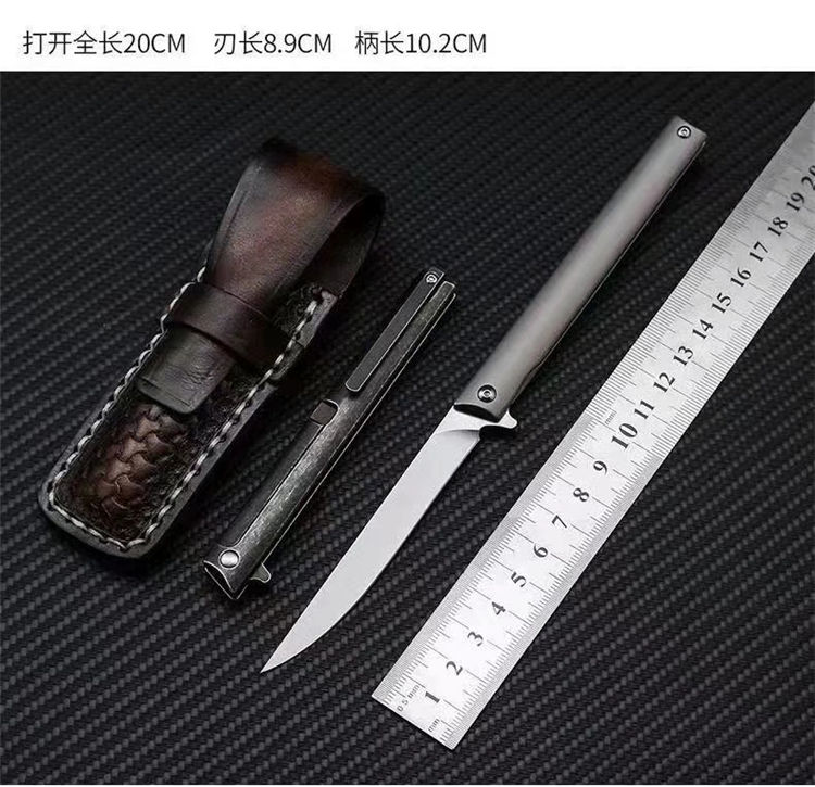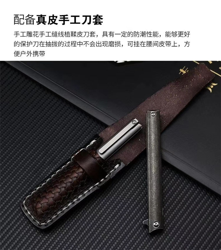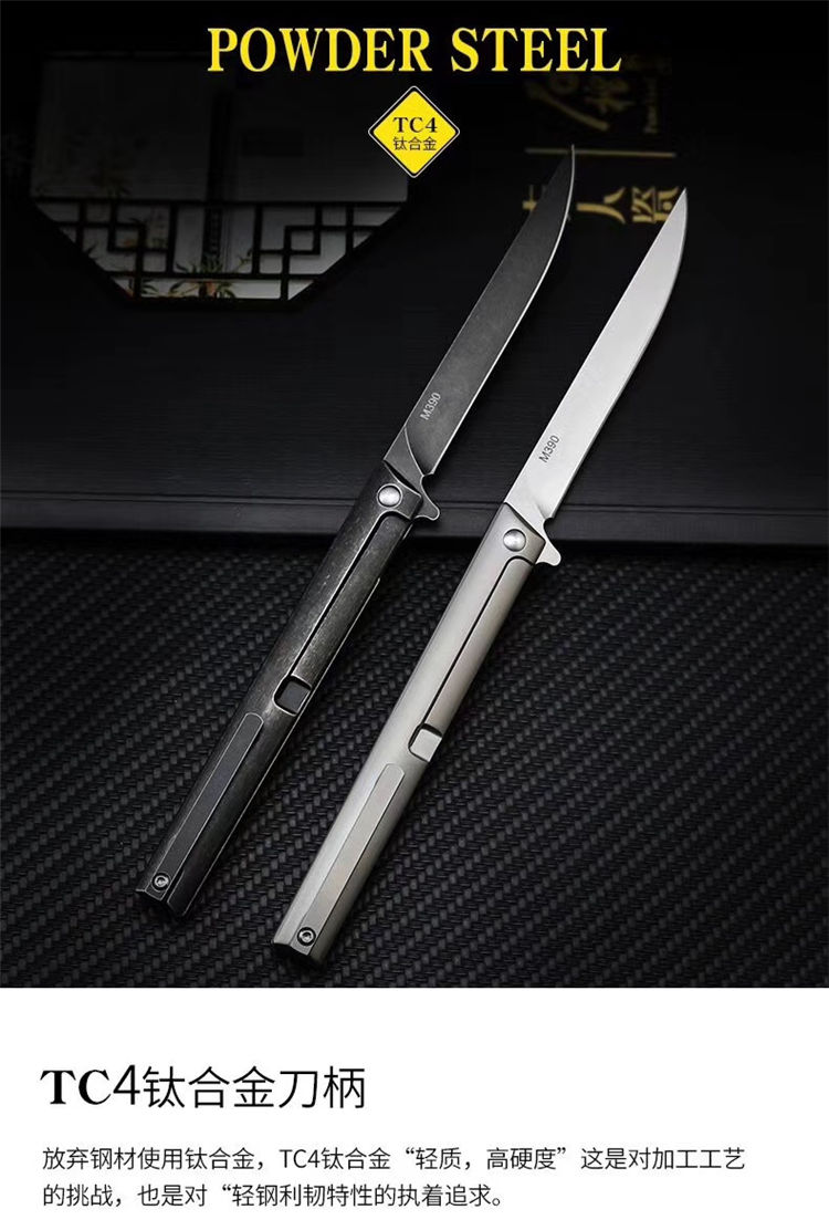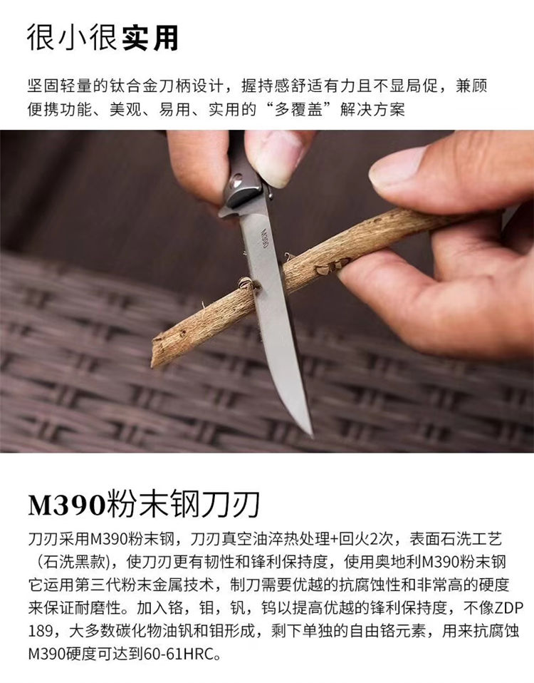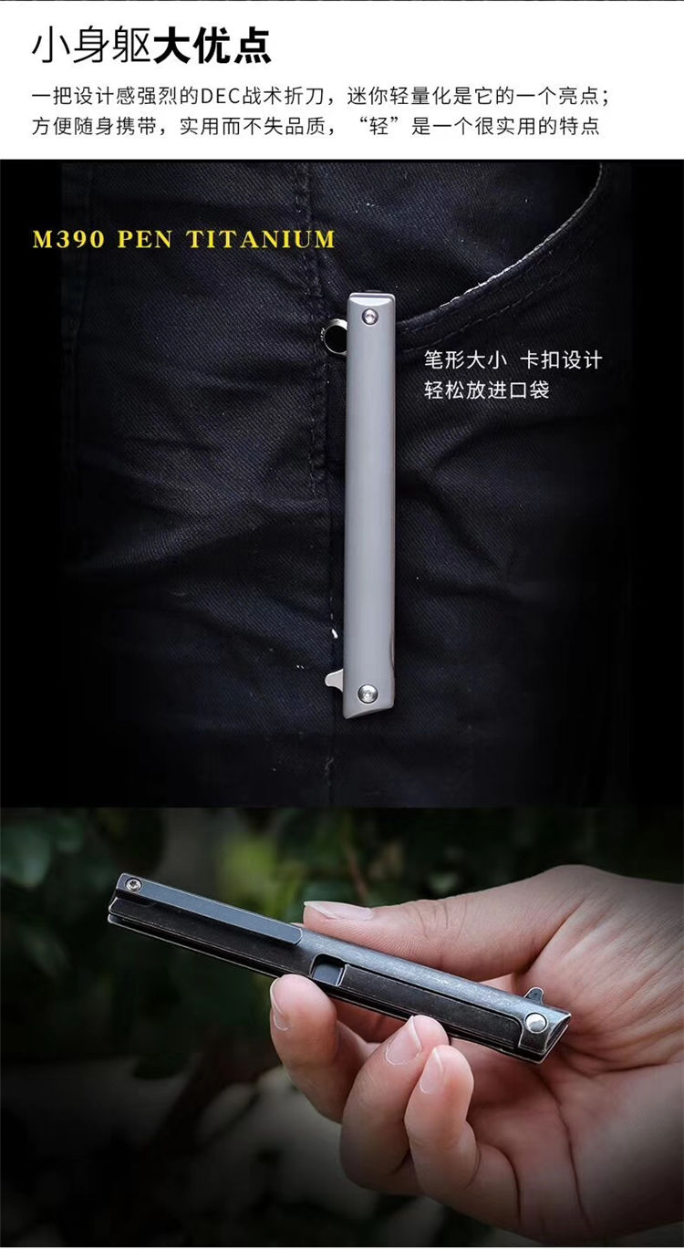 M390神笔钛柄折刀 全长:200mm 刃长:89mm 柄长:102mm 刃宽:11mm 刃厚:2mm 刃材:奥地利M390粉末神钢 重量:66(含皮套) 硬度:60-61HRC(真空油淬热处理+回火2次) 刃面:锻光-黑钛柄 面:灰钛-黑钛 柄材:正反面TC4钛合金 刀夹:超弹力钛夹 刀套:手工雕花手工缝线植鞣皮 螺丝:所有螺丝420不锈钢硬度HRC45,全CNC精雕加工,内置轴承滚珠系统 附件:礼品盒