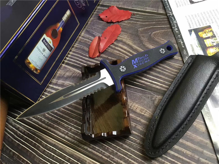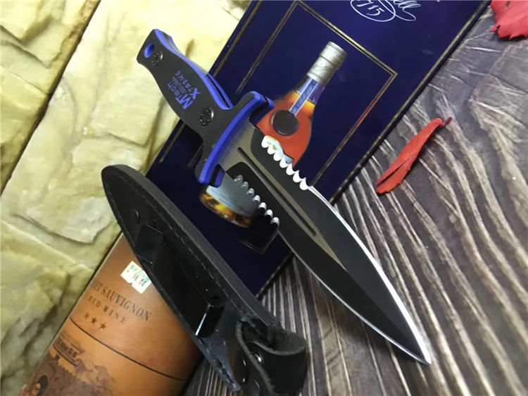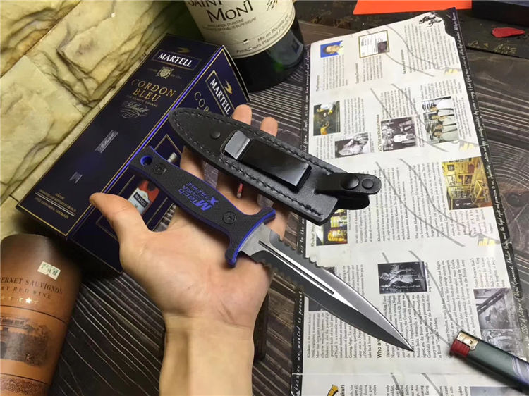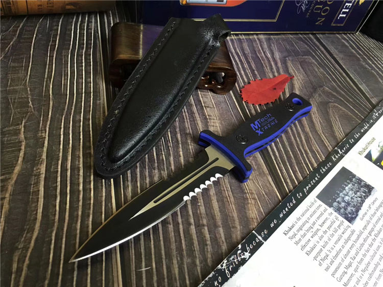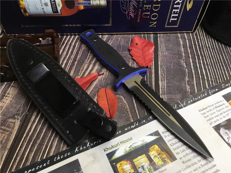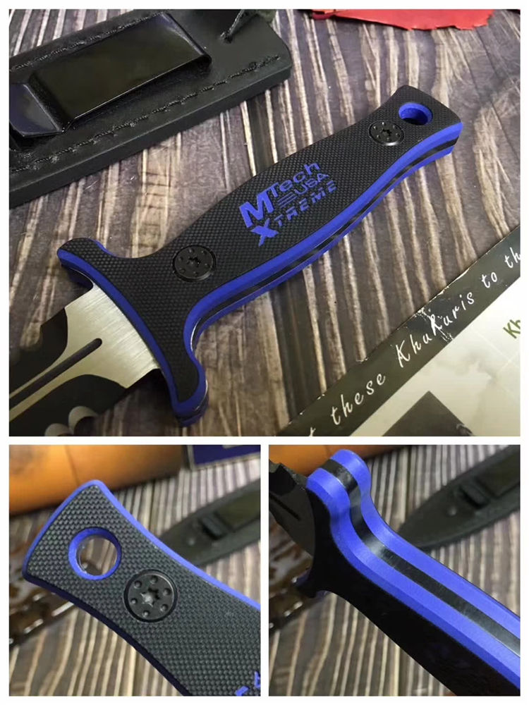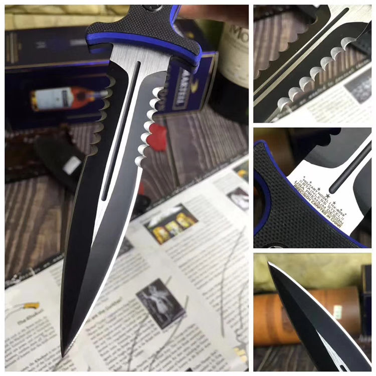 MT双锋半齿直刀 类型: 直刀 全长: 26.6cm 刃长: 13cm 刃宽: 3cm(最宽处) 柄长: 11.5cm 刃厚: 0.45cm 刃材: 440 硬度: 56RHC 表面: 发黑 柄材: 双色G10,经电脑锣精加工防滑格纹 重量: 240克(含套) 其他:皮套