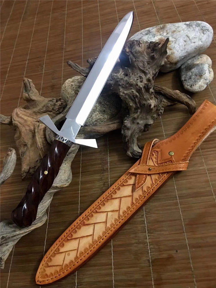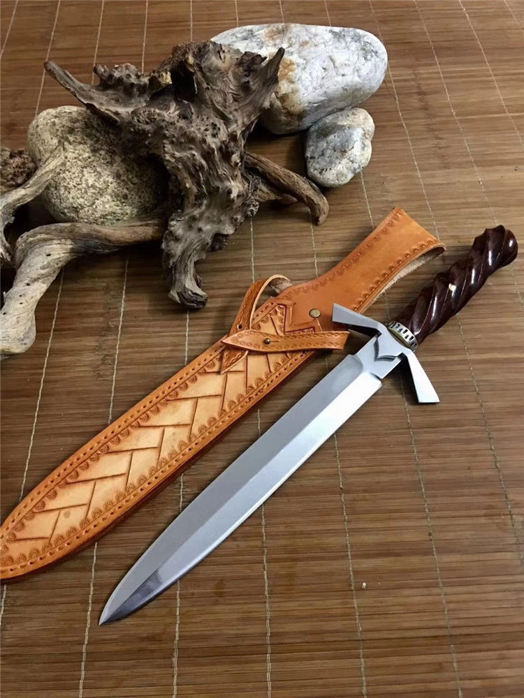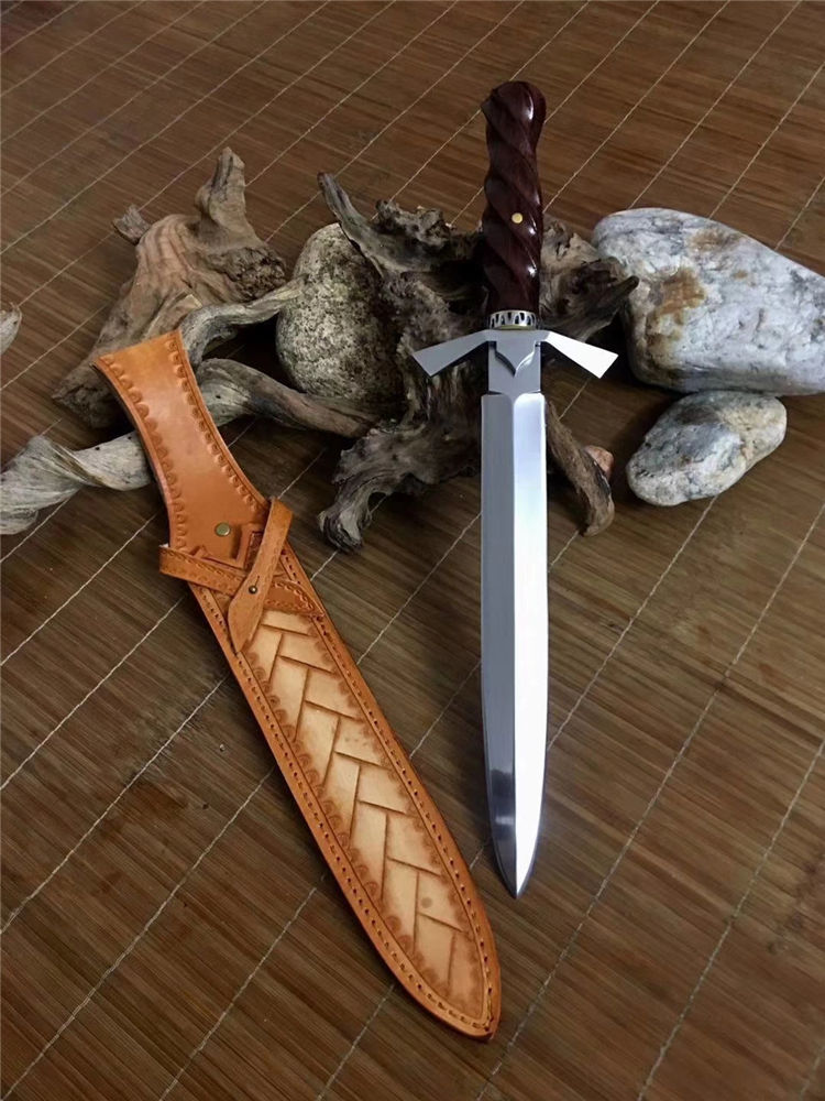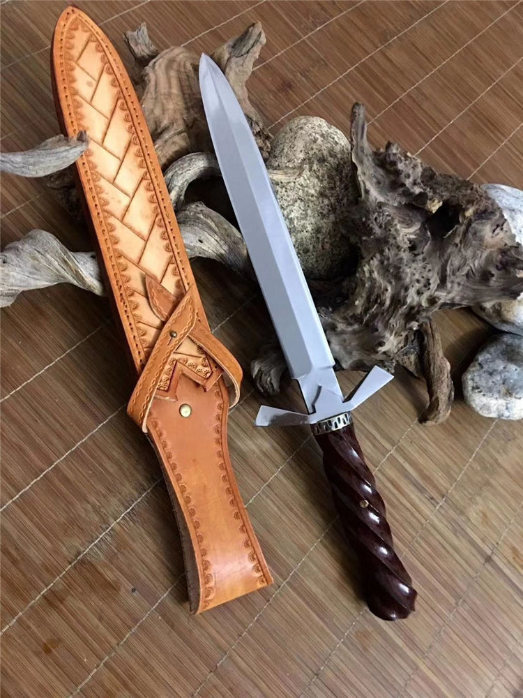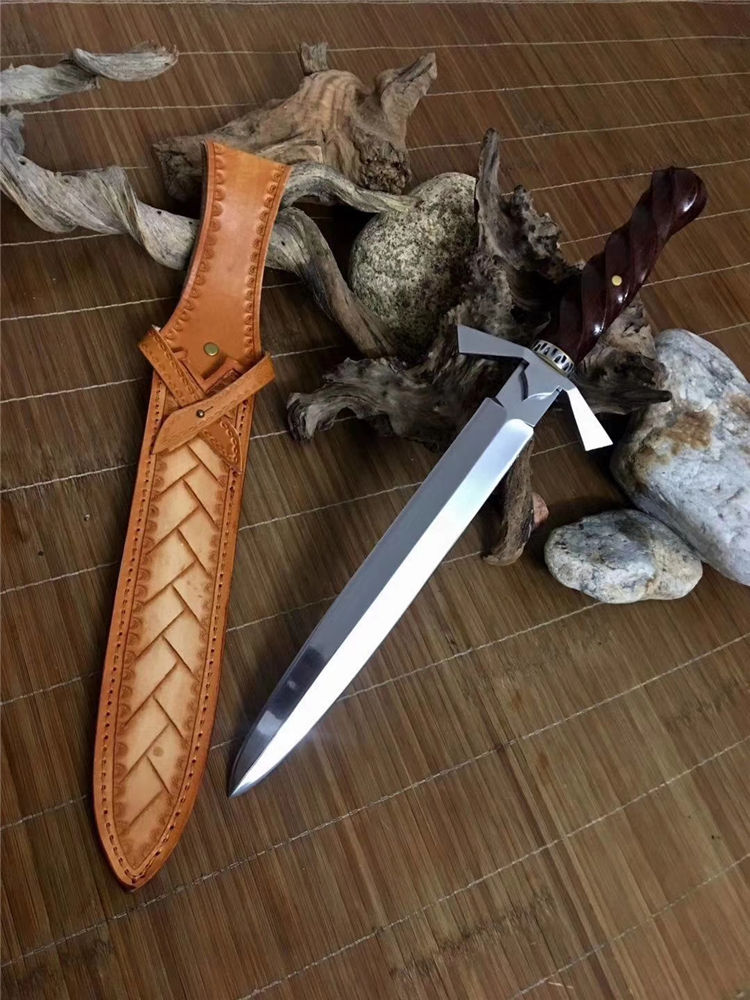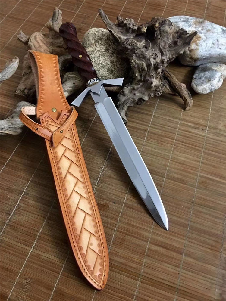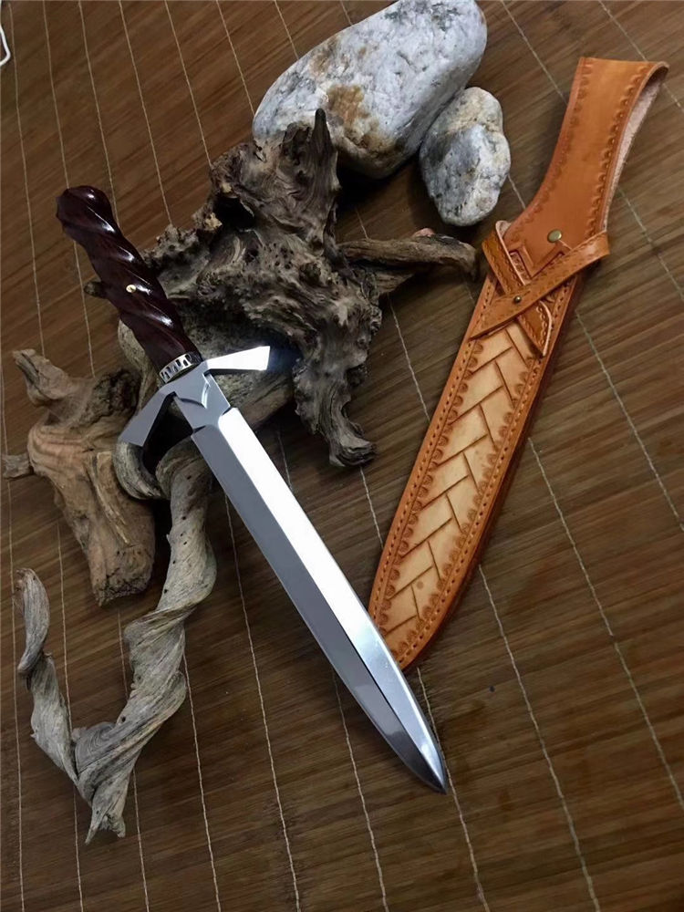 潘师傅唯美手工双刃剑 总长:41cm 刃长:26cm 厚度:0.5 纯手工打造,手工头层牛皮套进口俄罗斯高速钢东南亚黄花梨木柄