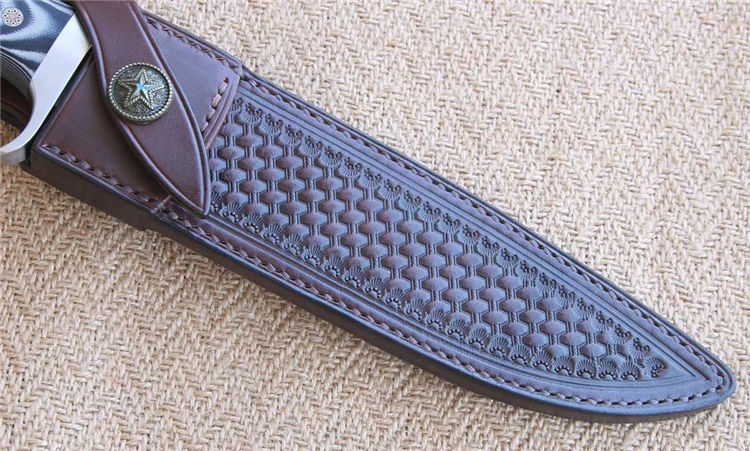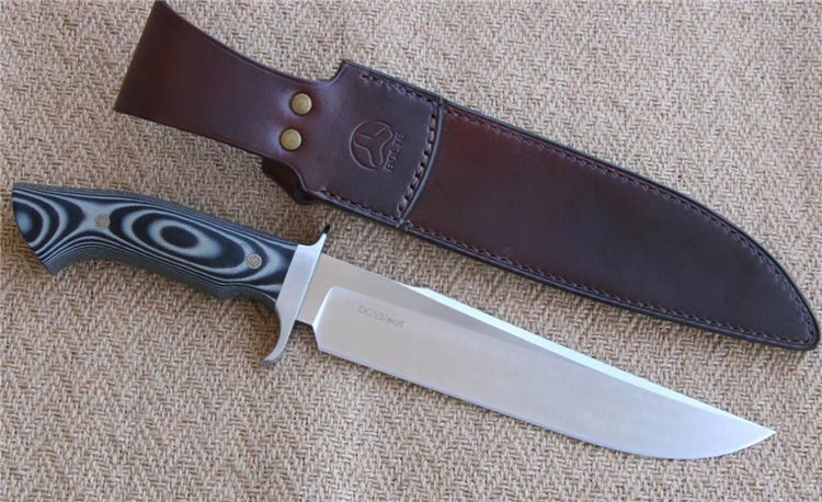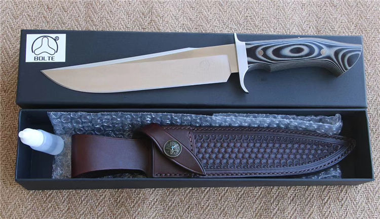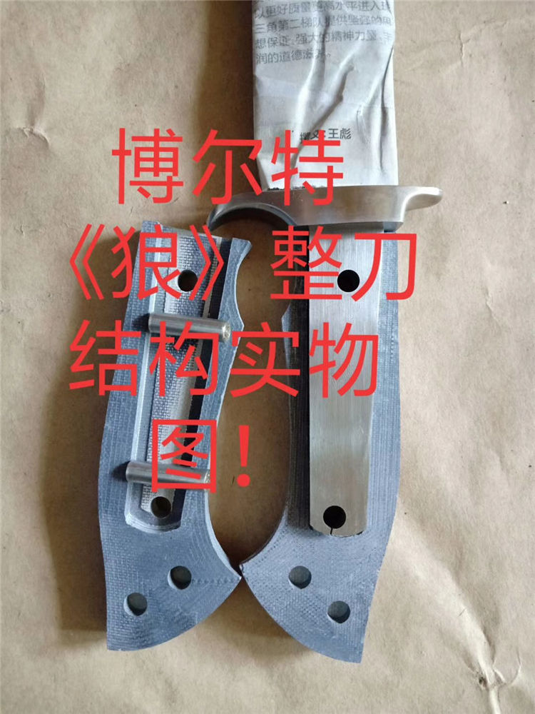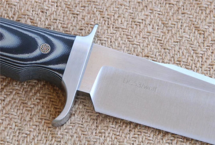 博尔特黑沙漠柄狼直刀 全长:325mm 刃长:200mm 柄长:125mm 刃厚:0.6mm 刃材:DC53(线切割开料) 刀最宽处:41mm 表面:V磨多面刃,平面幼拉丝处理,刃线立体感超强 类型:以锋利度,韧性保持度最出色 开刃方式:二次开刃 硬度:61+-1HRC 热处理方式:真空淬油热处理 净重:410g(不包含包装和鞘) 柄材:黑沙漠色G10柄和马赛克钉 刀鞘:头层牛皮手工鞘 包装:黑色硬纸盒+护刀油