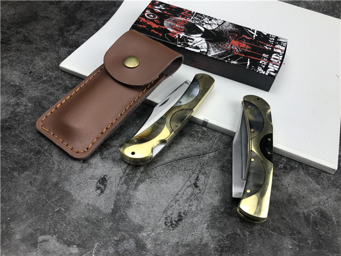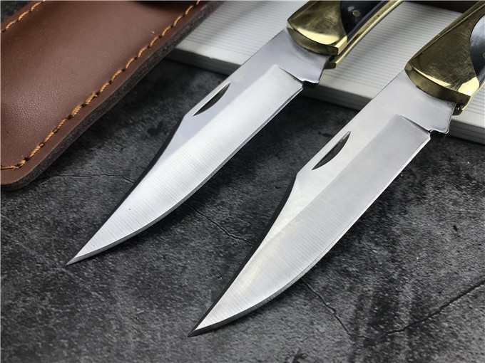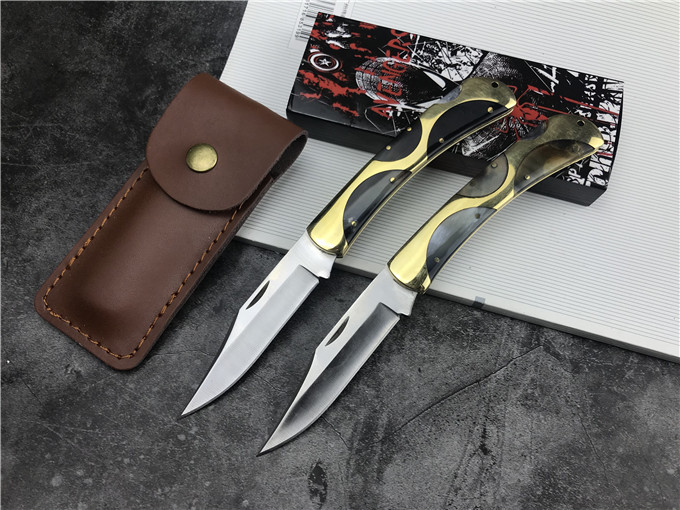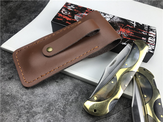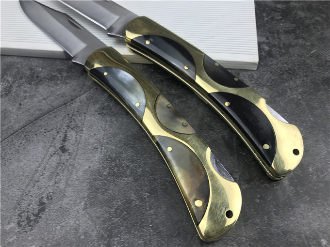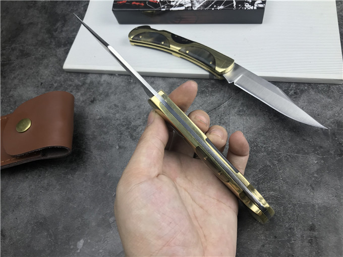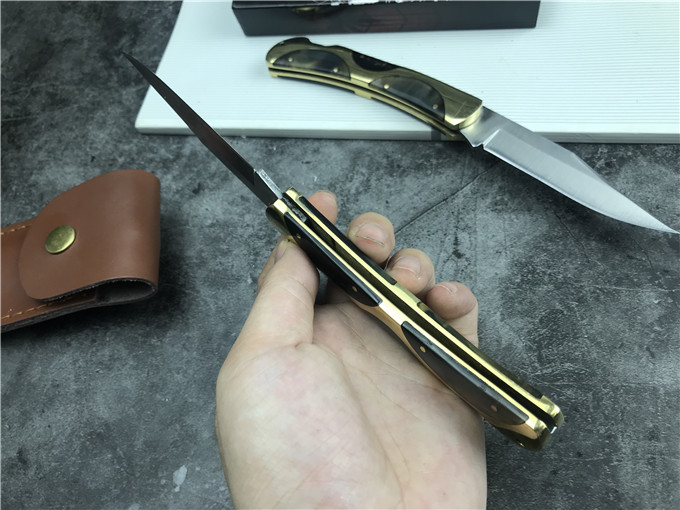巴克双铜头折刀 全长:21.3cm 刃长:9cm 柄长:12.3cm 刃宽:2cm 刃厚:3.2mm 刃材:5CR17 重量:367g(含包装) 硬度:57HRC 表面:砂光 柄材:双铜头+水牛角 锁闭:背锁