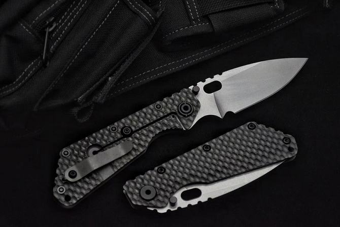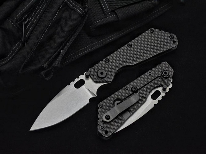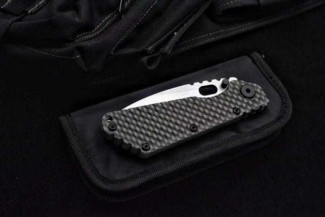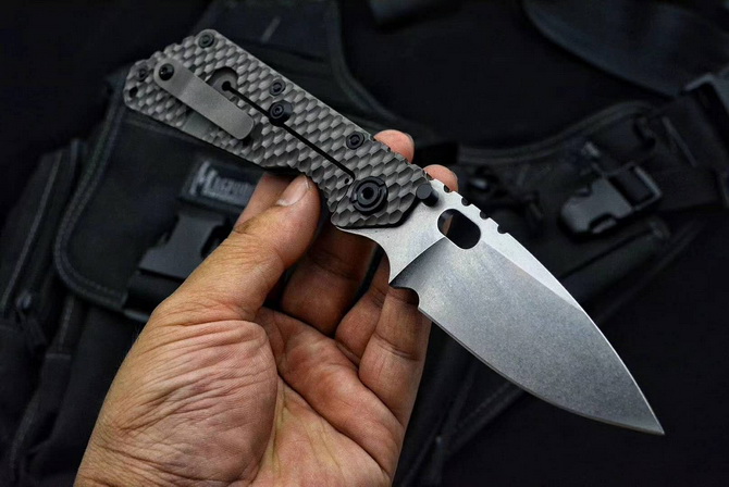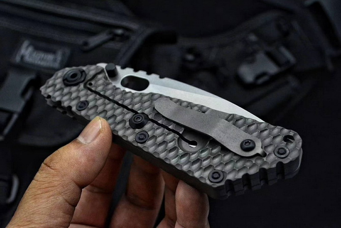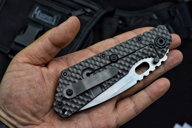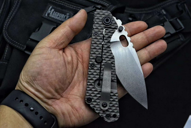 挺进者SMF钛合金弹坑折刀 打开全长:23cm 闭合长度:12.8cm 刃长:6.8cm 刀片宽:3厘米 刃厚:4.3毫米 净重:187克 刃材是高硬度D2钢,热处理硬度约60HRC,刀片表面石洗处理,柄材是钛合金,表面蜂窝纹喷砂处理,主轴是铜垫片