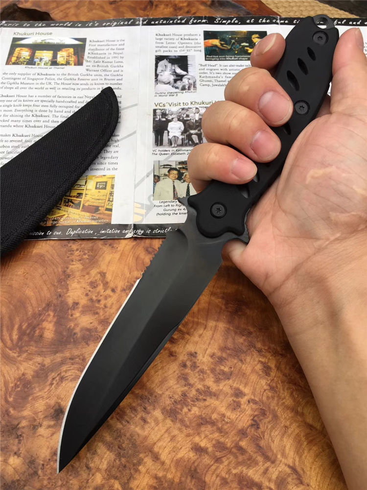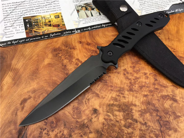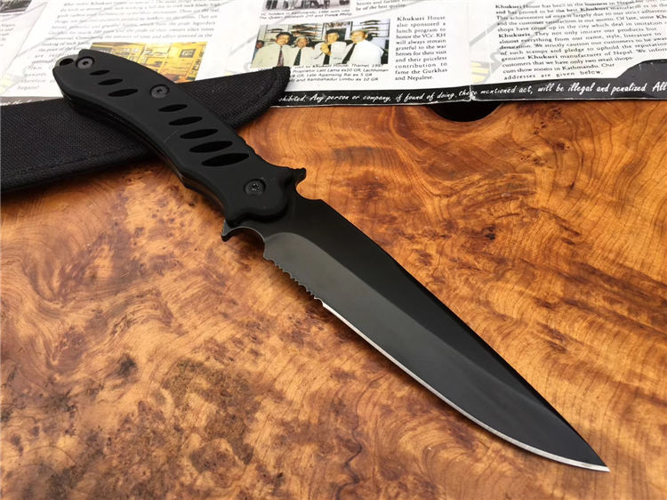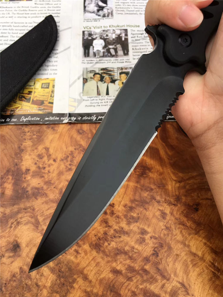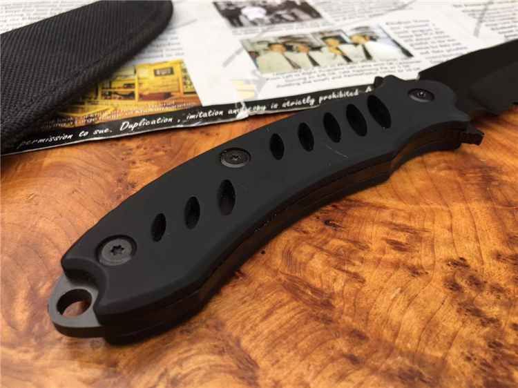 狐狸探路者直刀 品牌:狐狸 全长:26cm 刃长:12.5cm 柄长:13cm 刃厚:0.3cm 钢材:440 硬度:58HRC 刀鞘:尼龙 全铝镂空手柄采用橡塑工艺打造,有效增加防滑与握感,刀身带有锋利锯齿,新款户外小帮手