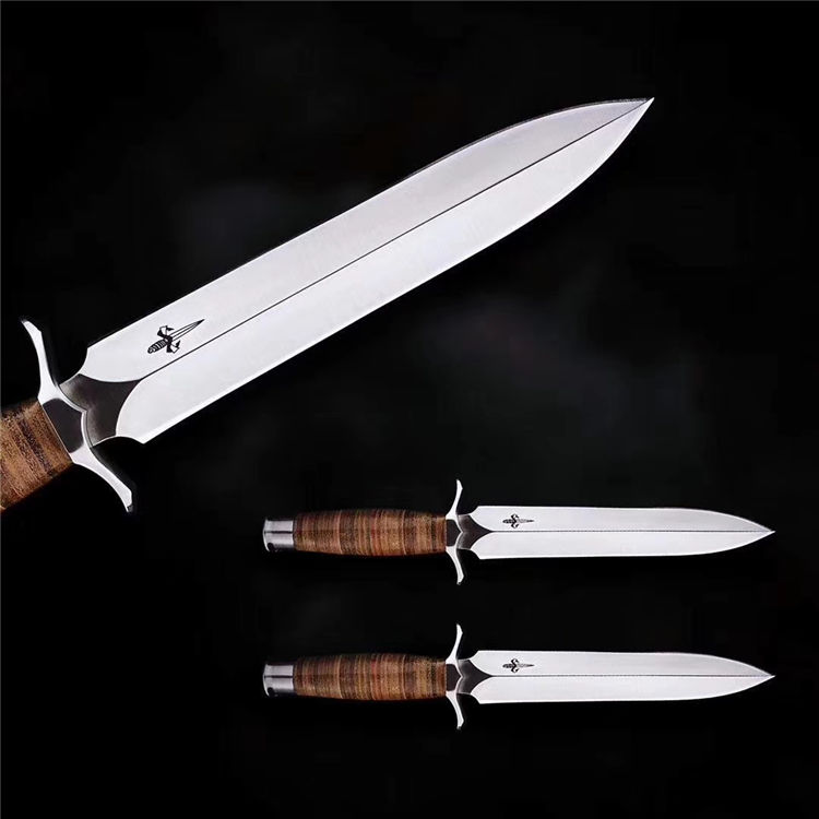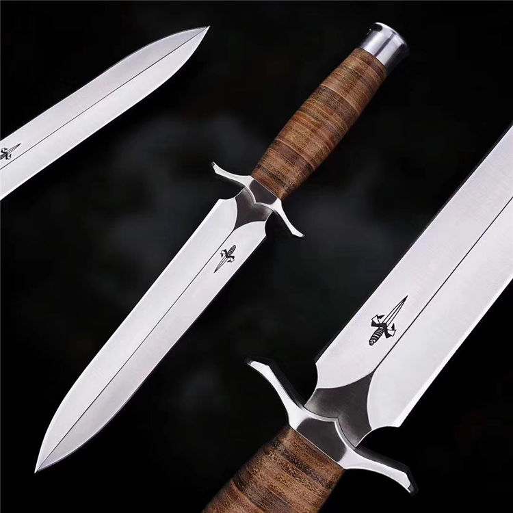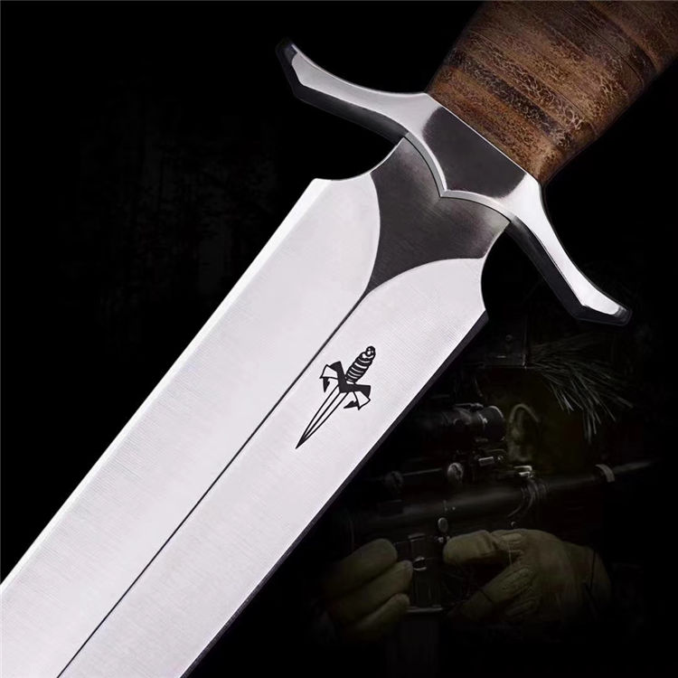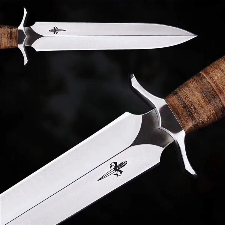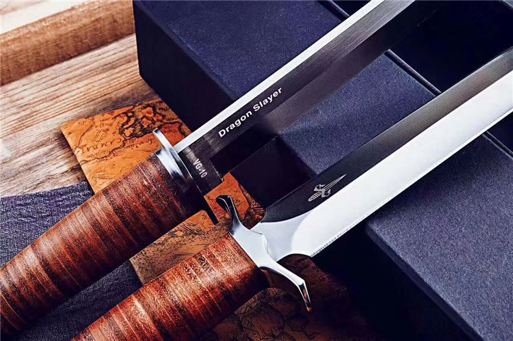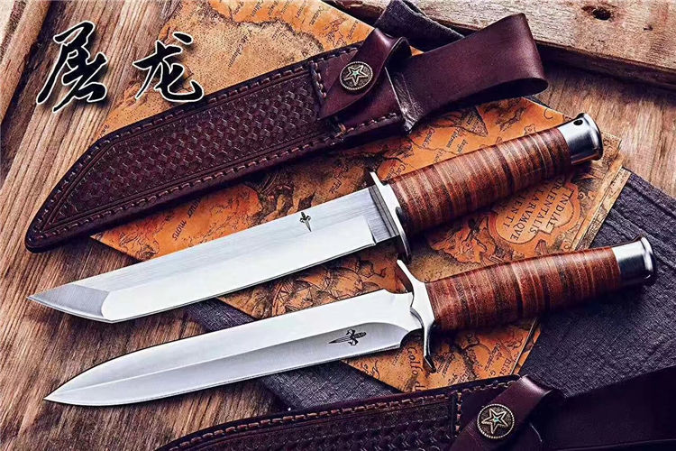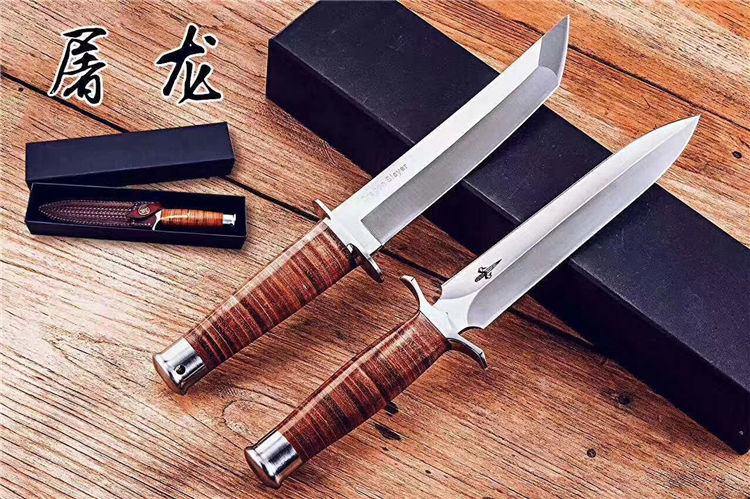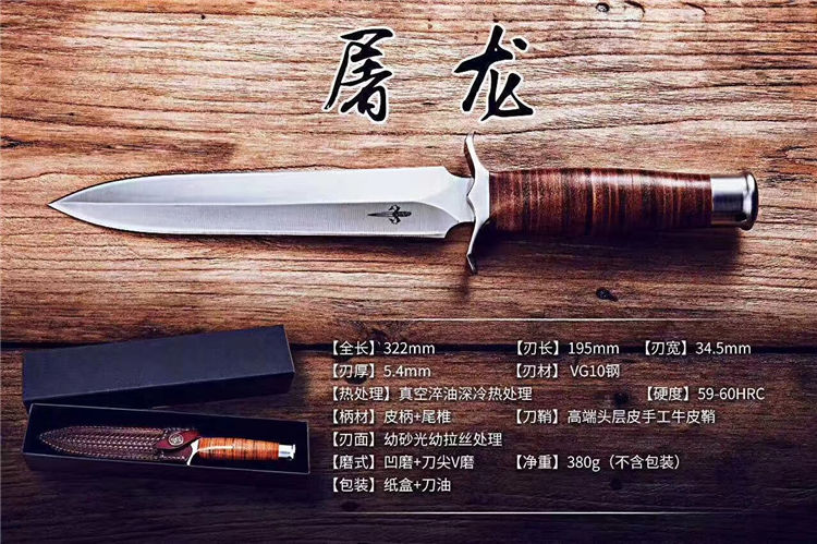 屠龙直刀 全长:322mm 刃长:195mm 刃宽:34.5mm 刃厚:5.4mm 刃材:VG10钢 热处理:真空淬油深冷热处理 硬度:59-60HRC 净重:380g(不含包装) 柄材:皮柄+尾椎 刀鞘:高端头层皮手工牛皮鞘 刃面:幼砂光幼拉丝处理 磨式:凹磨+刀尖V磨 包装:纸盒+刀油