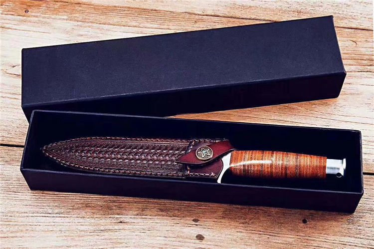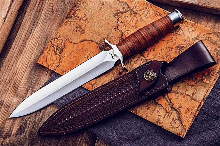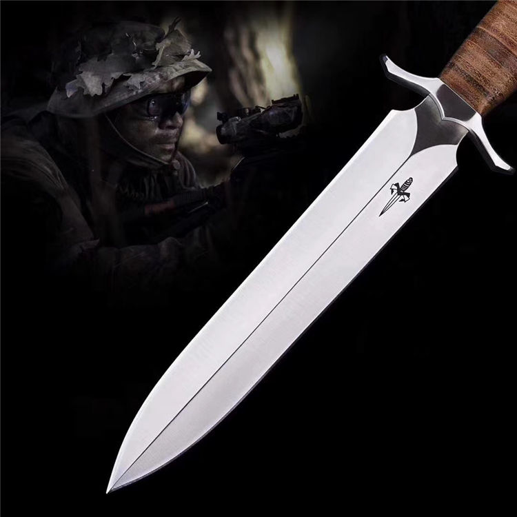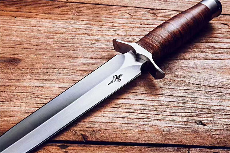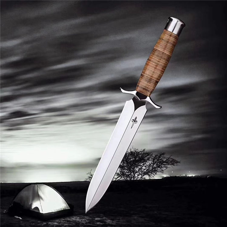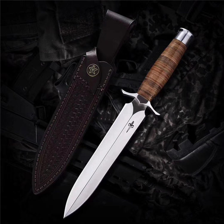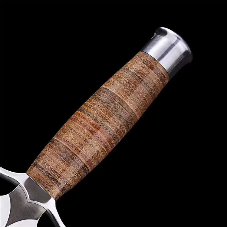 屠龙直刀 全长:322mm 刃长:195mm 刃宽:34.5mm 刃厚:5.4mm 刃材:VG10钢 热处理:真空淬油深冷热处理 硬度:59-60HRC 净重:380g(不含包装) 柄材:皮柄+尾椎 刀鞘:高端头层皮手工牛皮鞘 刃面:幼砂光幼拉丝处理 磨式:凹磨+刀尖V磨 包装:纸盒+刀油