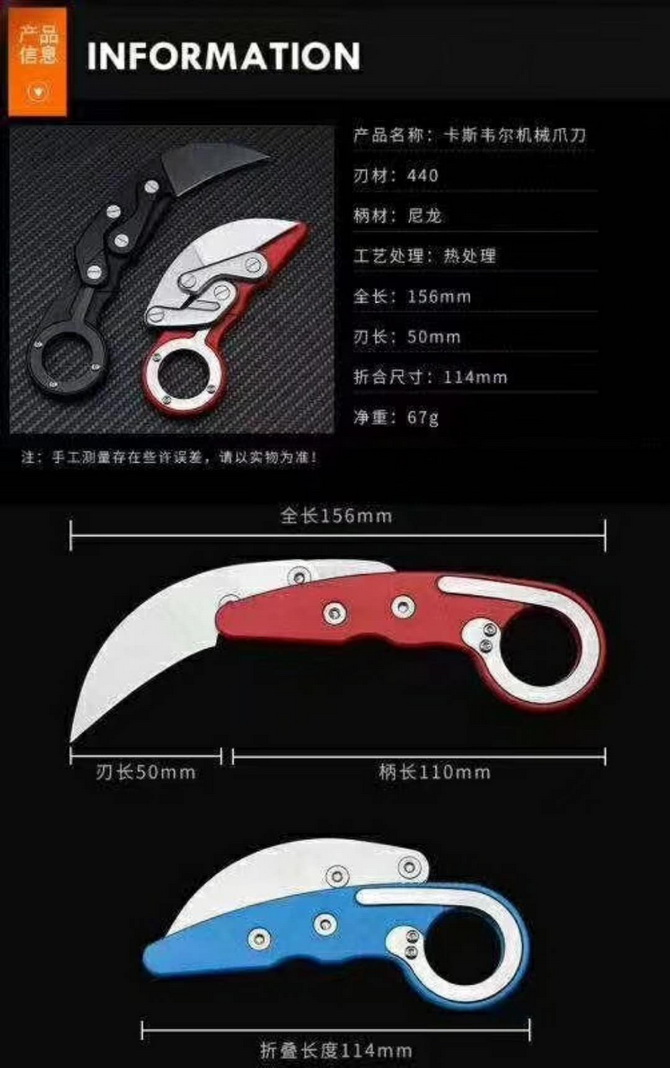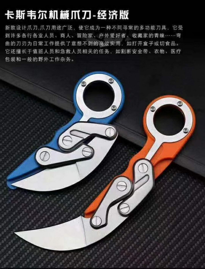 经济版卡斯韦尔机械爪刀 全长:156mm 刃长:50mm 刃厚:3mm 刃材:440 柄材:尼龙+玻纤 重量:67 刃口:锋利
