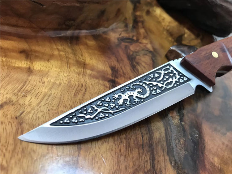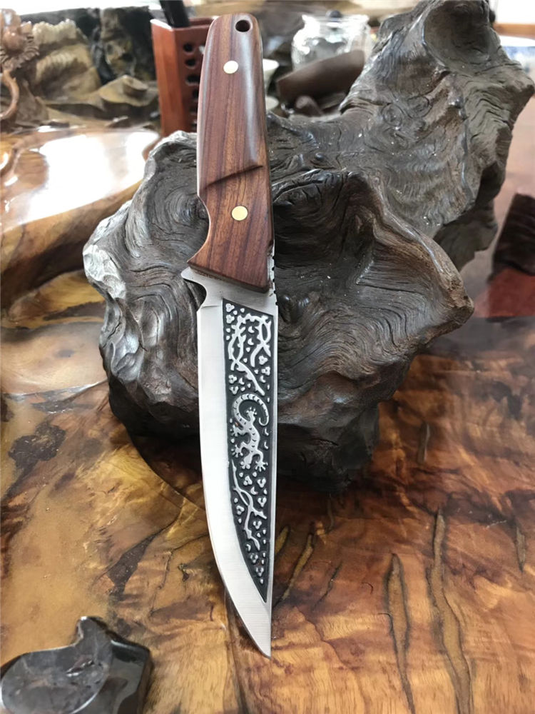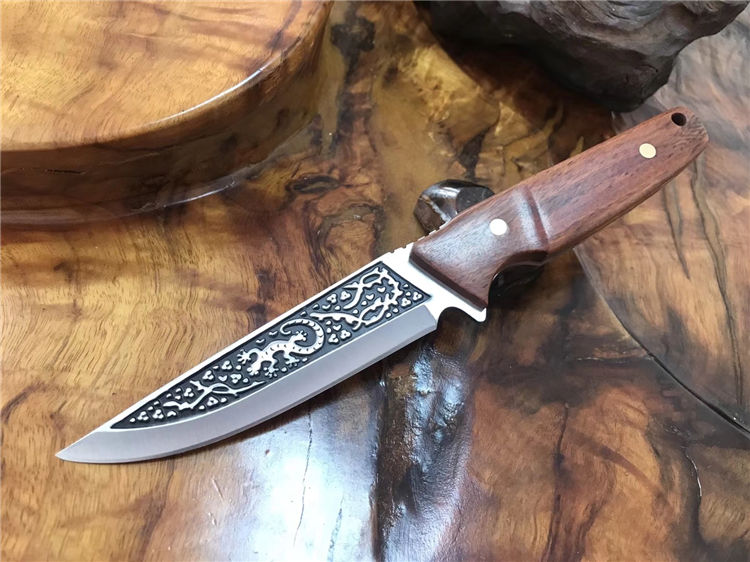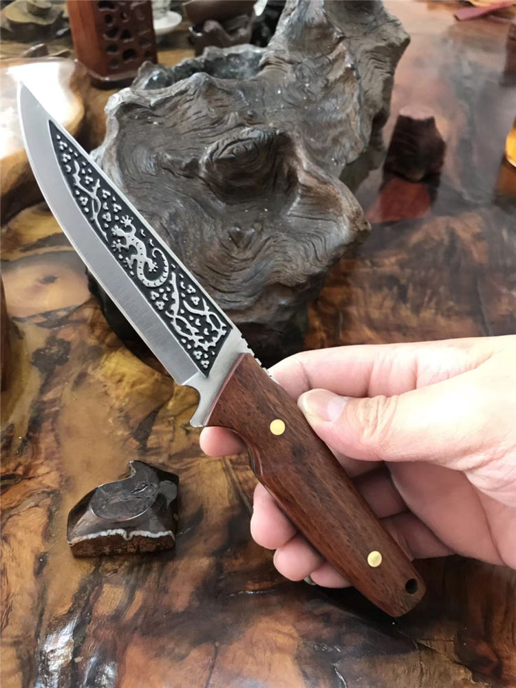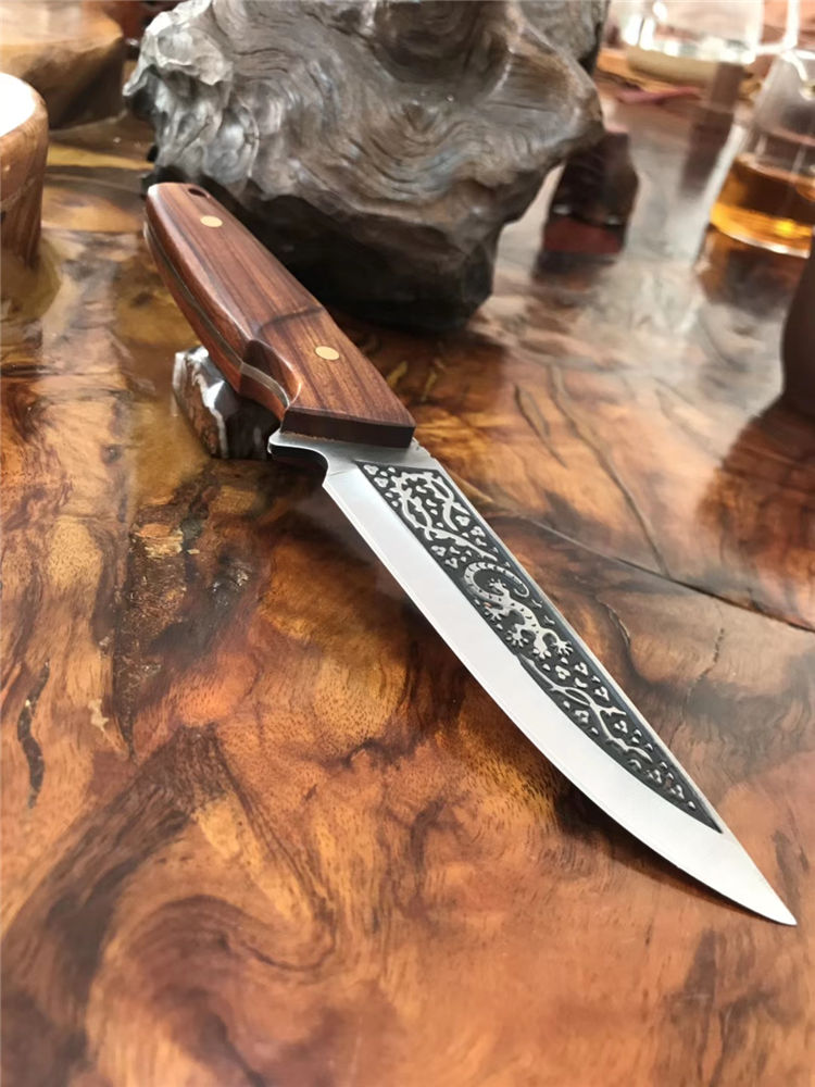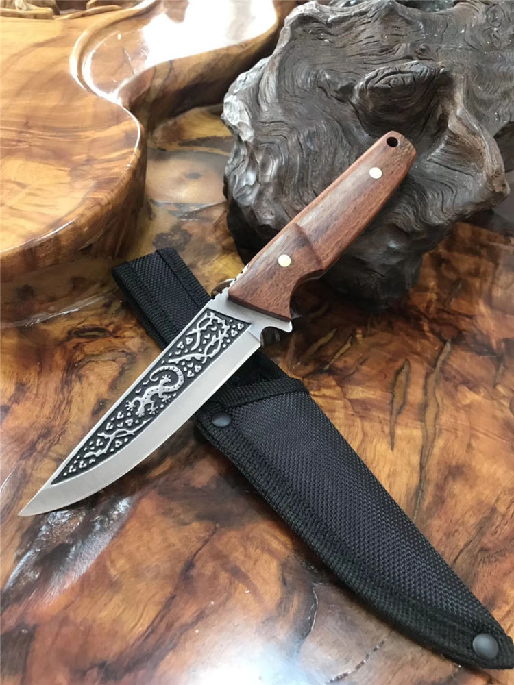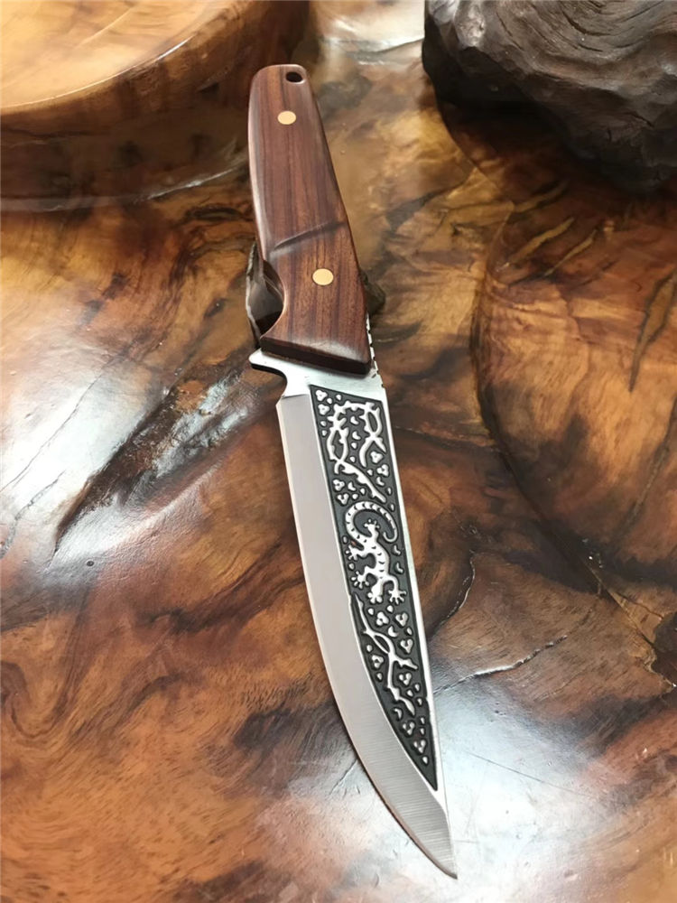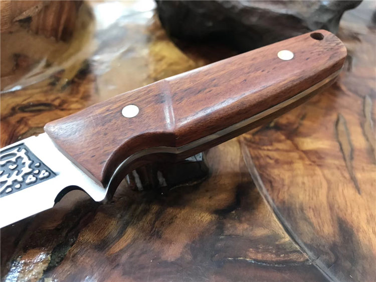 巴克1557水果刀 总长:25cm 柄长:12cm 刃长:13cm 刃厚:3mm 刃材:3cr14mov 刃面处理:沙光,雕花 柄材:黄檀木 硬度:58