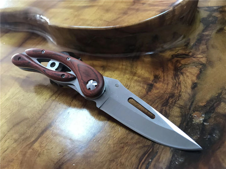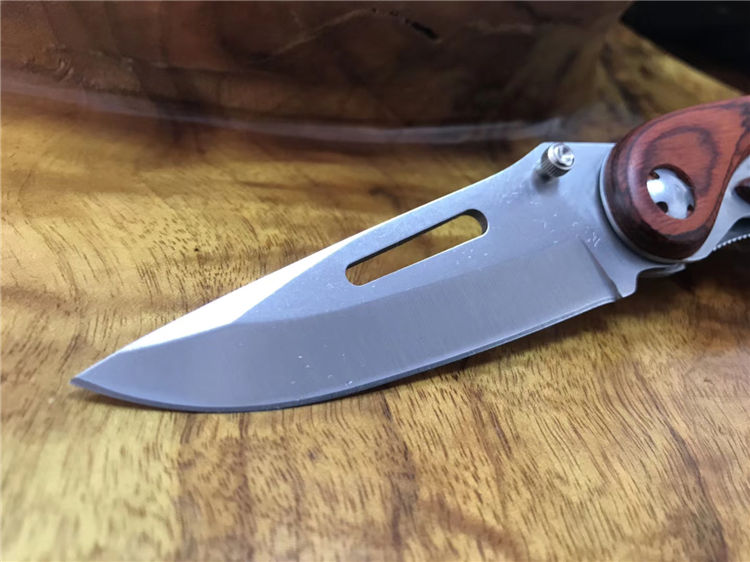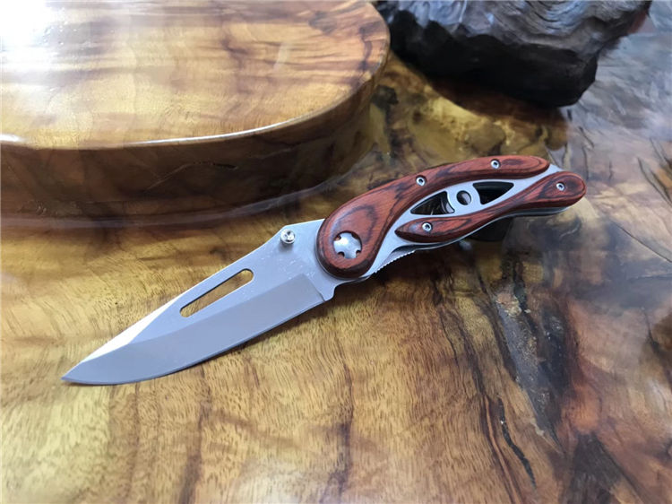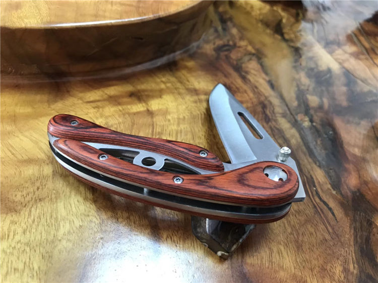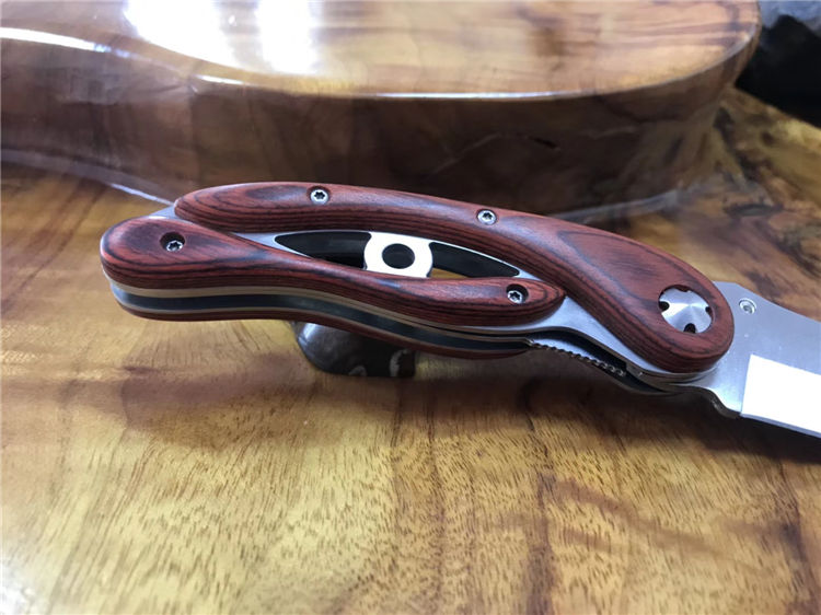 彩木镂空折刀 全长:226mm 刃长:99mm 柄长:128mm 刃宽:32mm 刃厚:4.0mm 刃材:5Cr15Mov 重量:257g(含包装) 硬度:57HRC 表面:沙光 柄材:钢柄+酸枝木