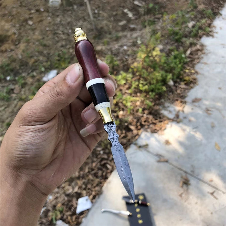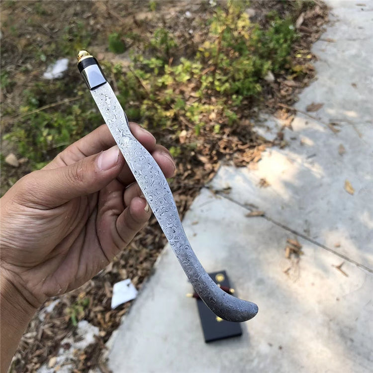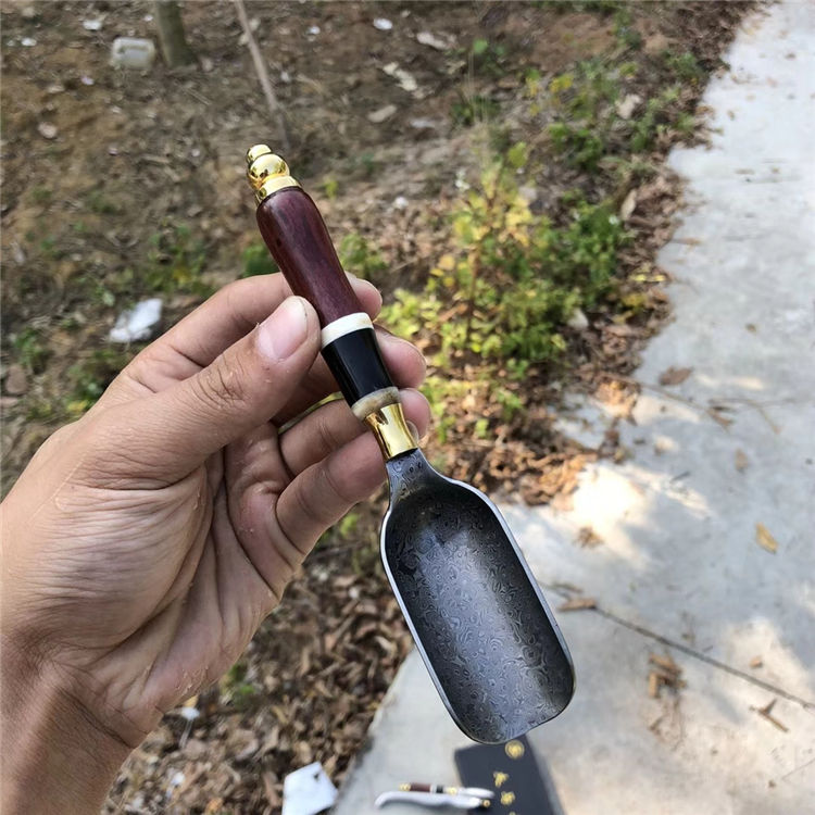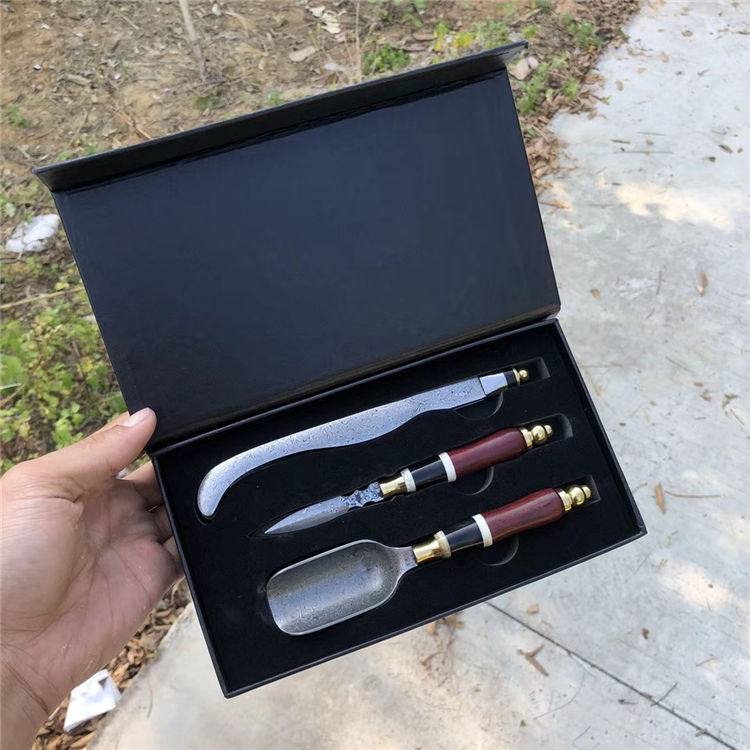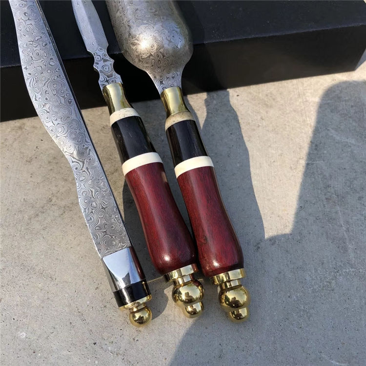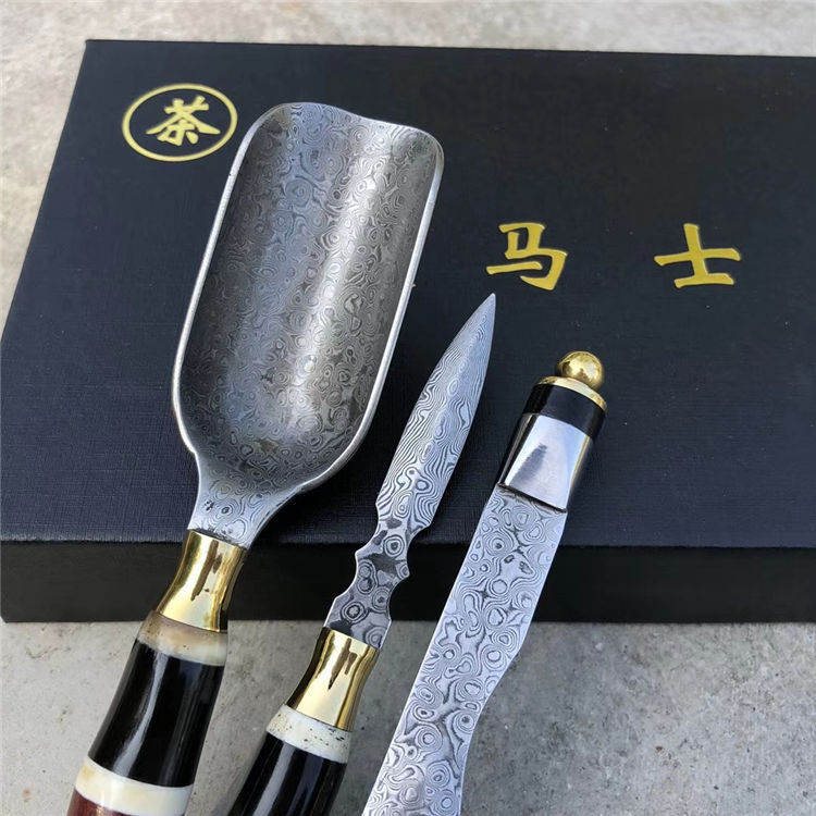 聚客大马士革三件套装茶刀 茶针总长:16cm 刃长6.5cm 刃厚2.5mm 茶勺总长:17cm 勺钢长8cm 厚度:2mm 茶夹总长:18cm 厚度:2mm 钢材:大马士革钢 硬度:59HRC 表面:大马士革原纹 包装配置:高级礼品硬盒