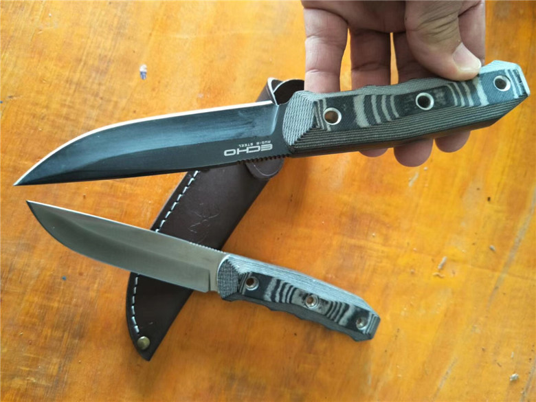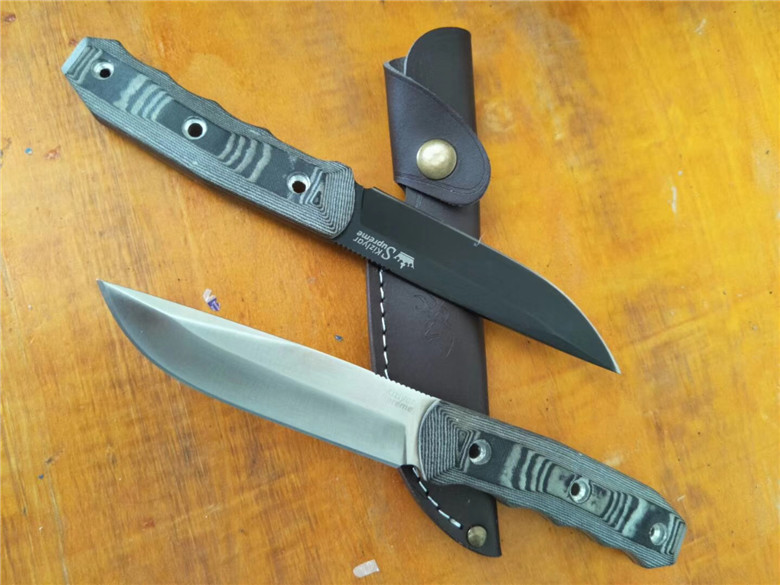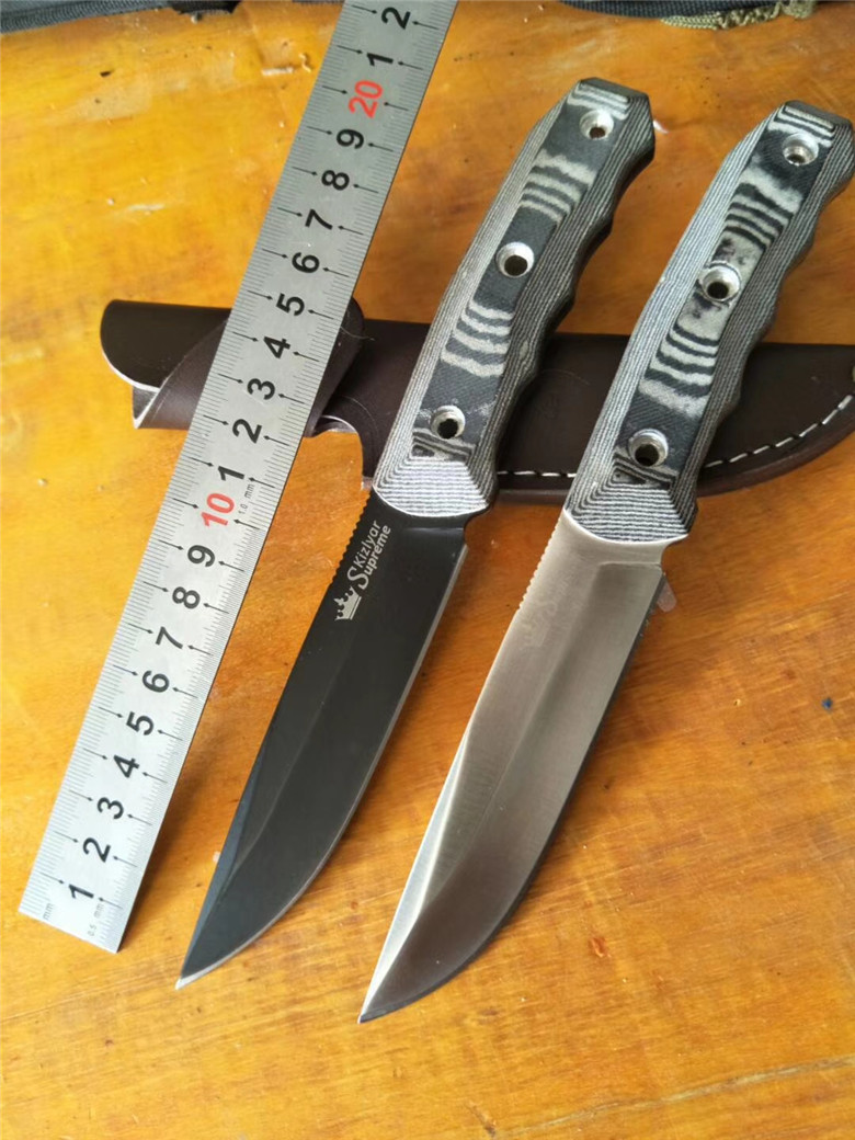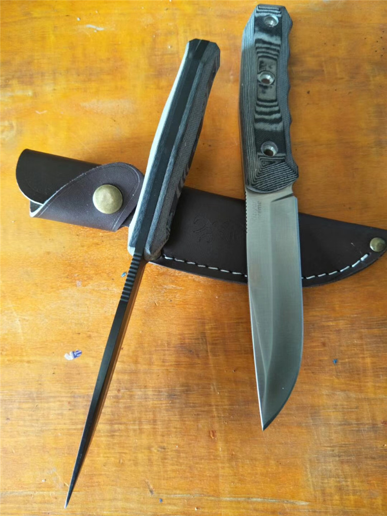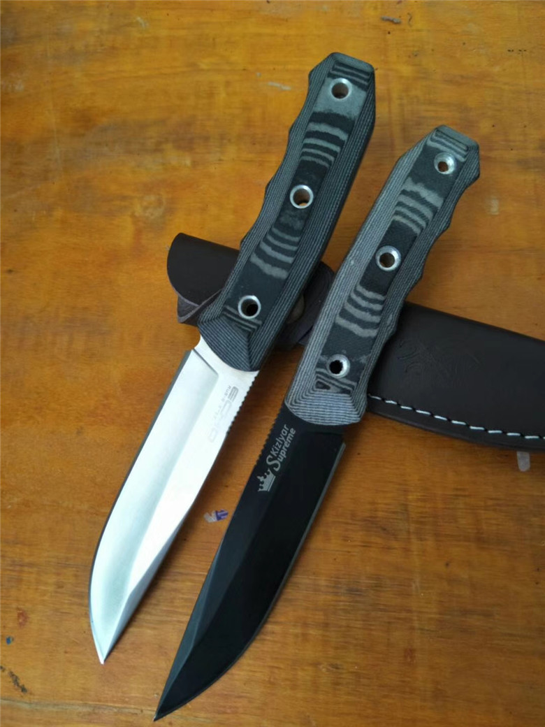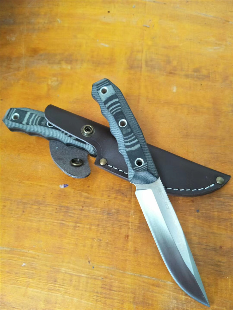 皇冠户外战斗刀 总长:23.3cm 刃长:11.5cm 刃厚:5MM 刃宽:2.5cm 钢材:440 硬度:57HRC 热处理:真空深冷热处理 表面处理:砂光效果 柄材:米克塔 皮套:仿皮