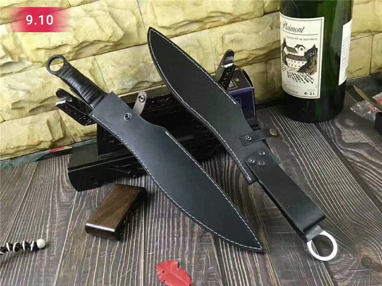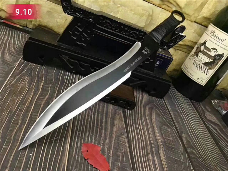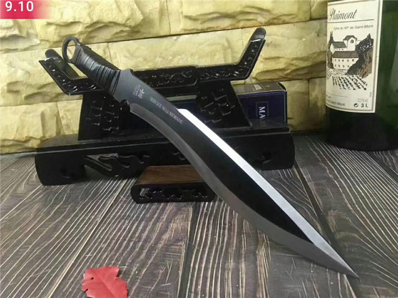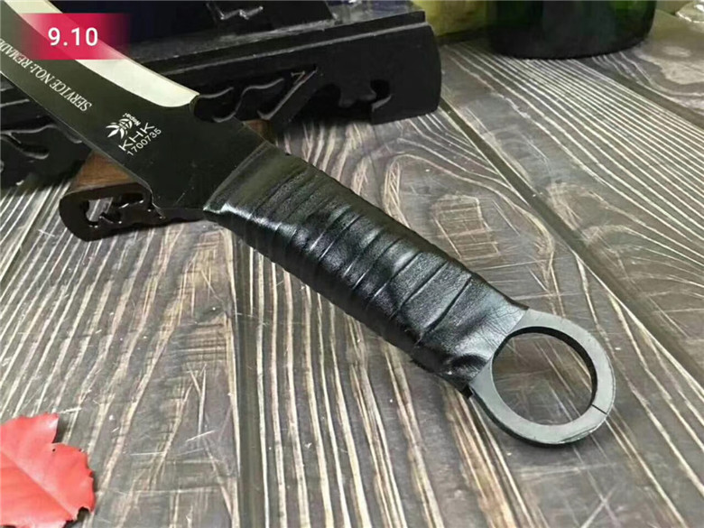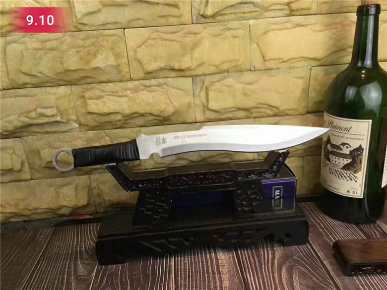 KHK激战战刀 全长:50cm 刃长:35cm 最宽处:4.8cm 厚:0.4cm 重约:0.6kg 刃材:高锰材质 硬度:60