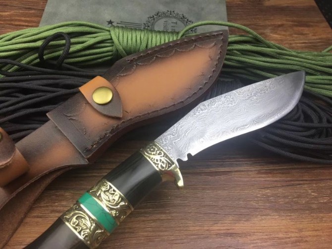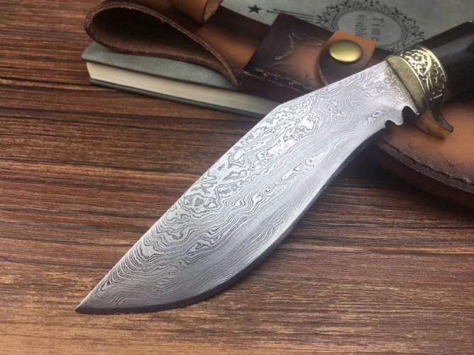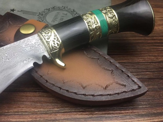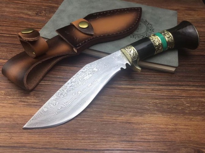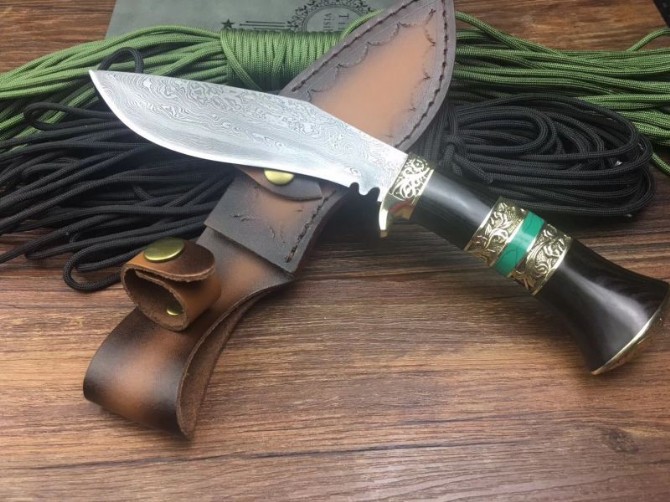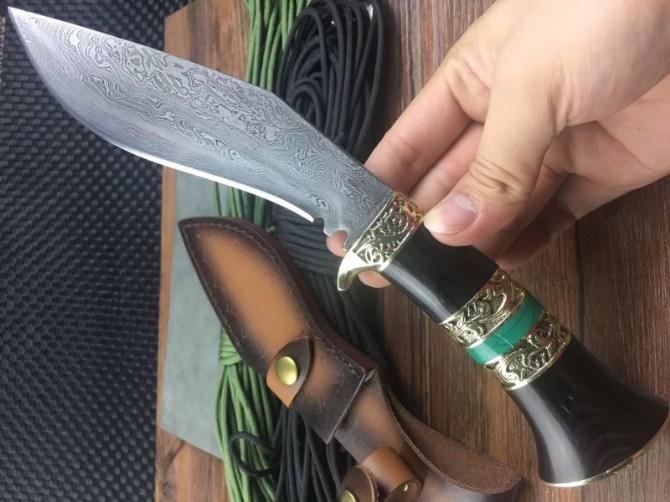 新廓尔喀大马士革小天狗刀 全长:27cm 刃长:15cm 刃宽:3.5cm 柄长:12cm 刃厚:0.5CM 刃材:大马士革花纹钢 硬度:60 柄材:黑檀木+黄铜+松石 刀鞘:牛皮刀鞘 其他非常锋利