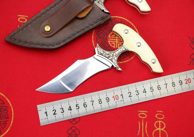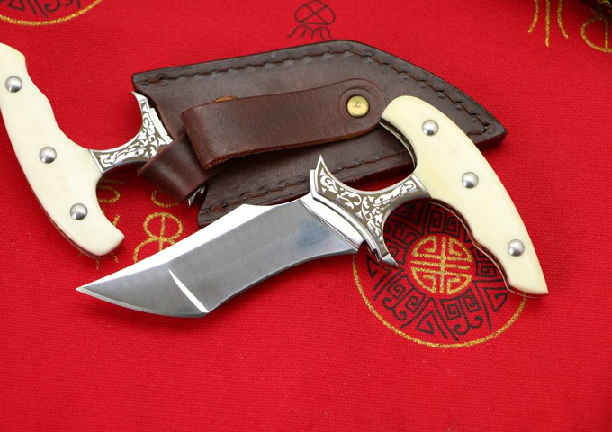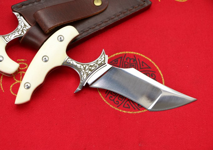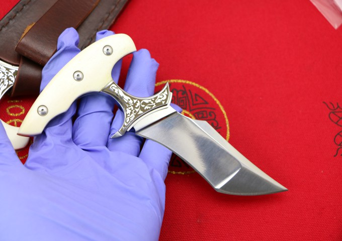 VG10钢落羽手刺 刺刀历经一年时间打造, 刀匠采用传统纯手工打磨. 资深老师傅打造?极致手工、高档华丽的外表,非常锋利, 只做限量版发售!数量不到200把! 全长:150MM 刃长:96MM 刃厚:4.0MM 热处理:专业真空油淬热处理 硬度:60-61HRC 刃材:VG10 重量:250克 刀刃表面处理:镜光 刀套:手工牛皮套+镶嵌蛇皮 刀柄真牛骨加黄铜 包装:黑色礼品盒