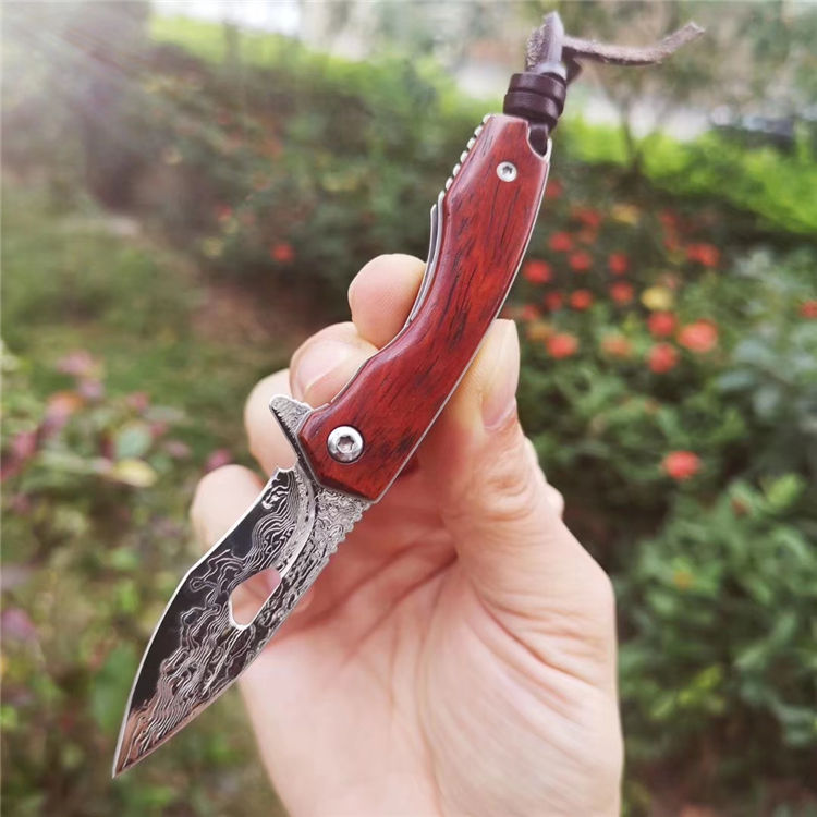 魅力四射,刀柄采用老挝微粒黄檀木,抛光细腻,握感舒适,尖尖的刀刃选用2.6mmVG10大马士革锻打祥云纹,锋利且坚固,陶瓷滚珠轴承快开系统,小巧实用,刀背龙骨精细挫花更上档次,细节打磨处理精细