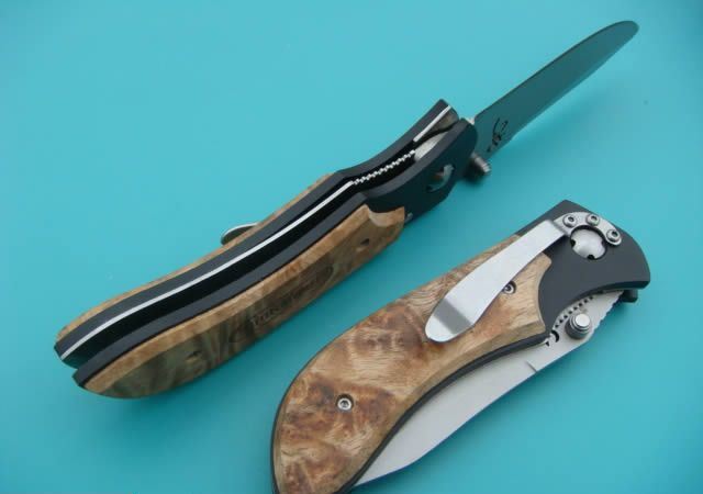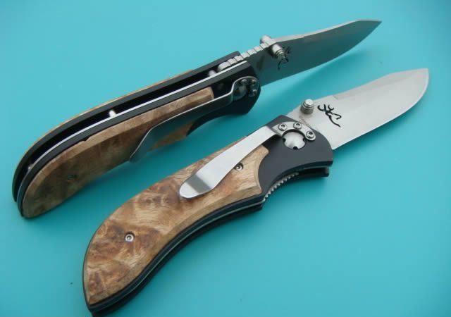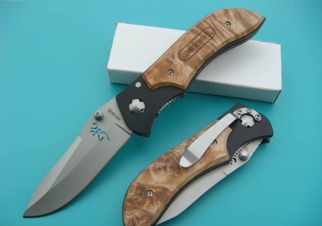 美国勃朗宁SPG风神影木折刀 全长: 20.5CM 刃长: 8CM 刃厚: 0.3CM 刃材: 440C 硬度: 58HRC 柄材: 天然影木 净重: 125g 表面处理:灰钛