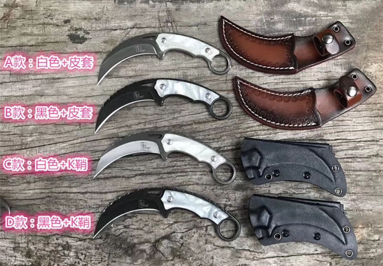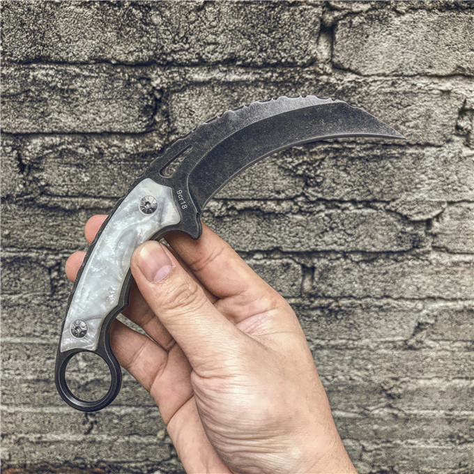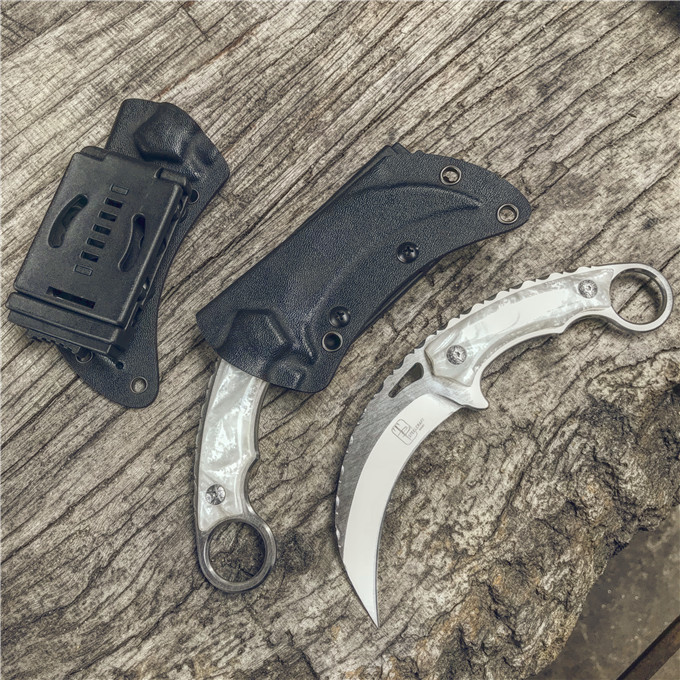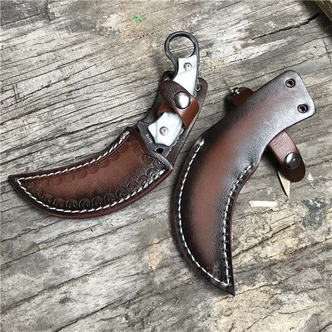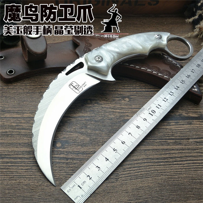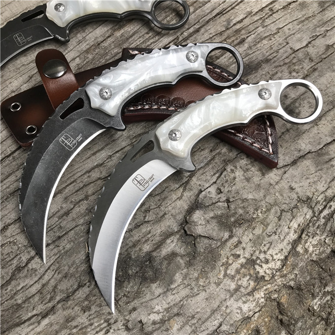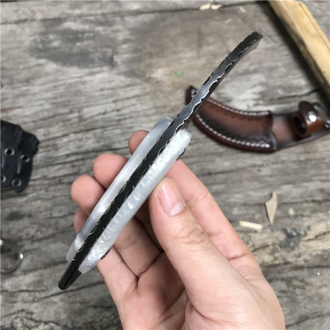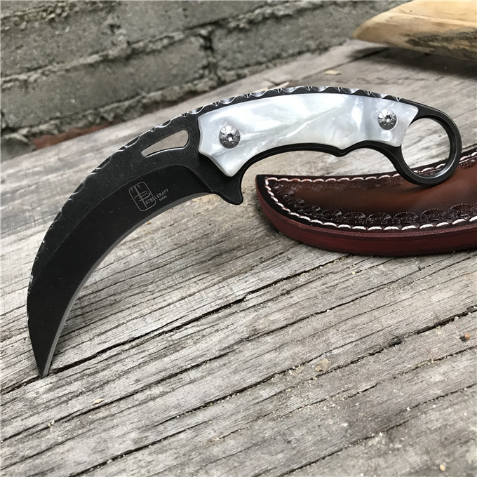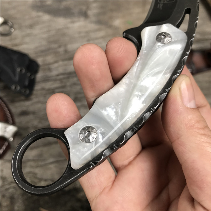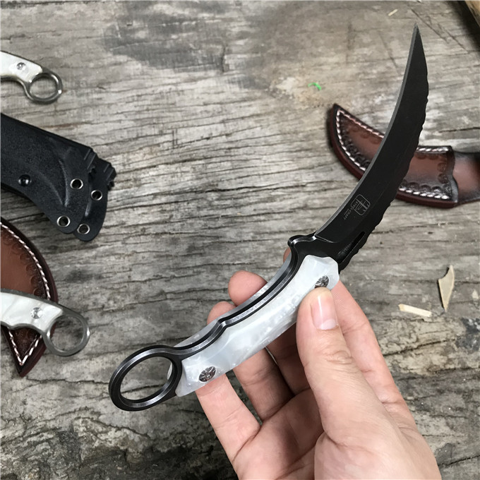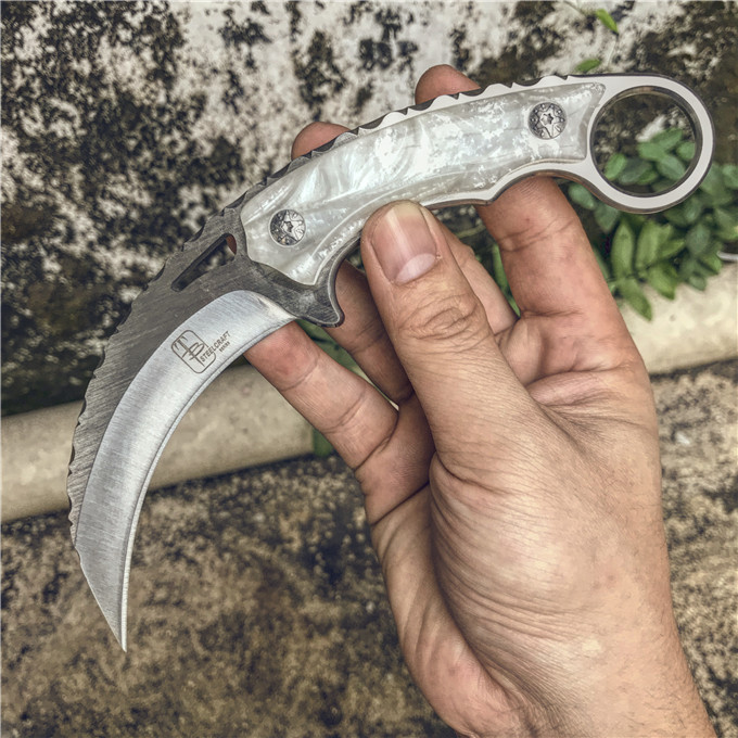 托德·贝格小号魔鸟防卫爪刀 柄材:亚力克 全长:19MM 刃长:9MM 刃厚:5.0MM 硬度:59-61HRC(真空油淬热处理+回火2次) 刃材:9cr18mov 重量:280克 刀刃表面处理:砂光+拉丝 刀套:优质牛皮套 包装:黑色礼品盒