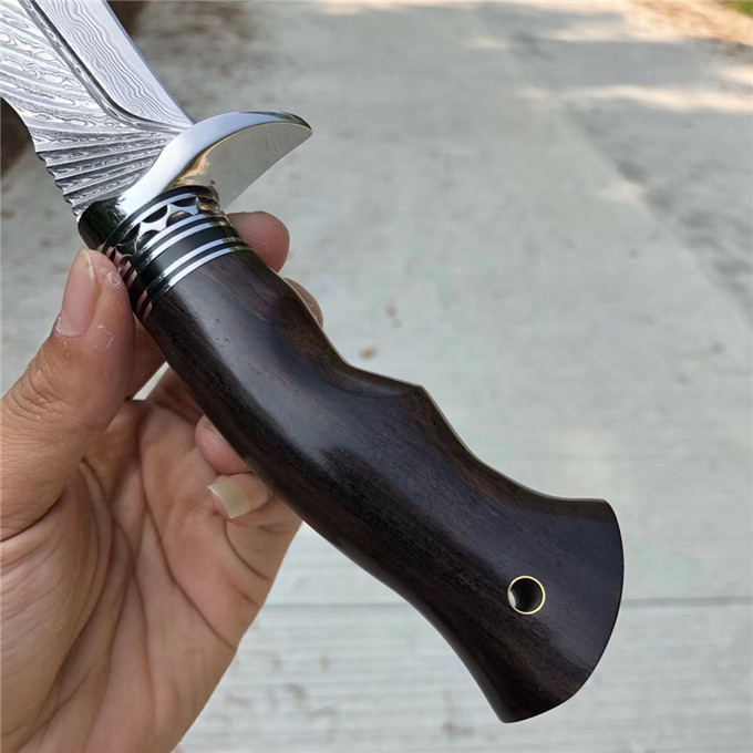 大马士革蝙蝠侠直刀 总长:25cm 刃长:12cm 手柄:12.5cm 刃厚:3.8MM 刃宽:3.1cm 刃材:大马士革钢(95层) 硬度:60HRC真空热处理,钢口非常不错 手柄材质/做工:钢头+手工隔片+非洲黑檀木 皮套:纯手工缝线雕花牛皮刀套 包装:高级硬盒礼品盒
