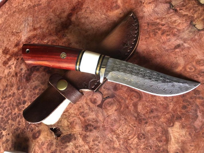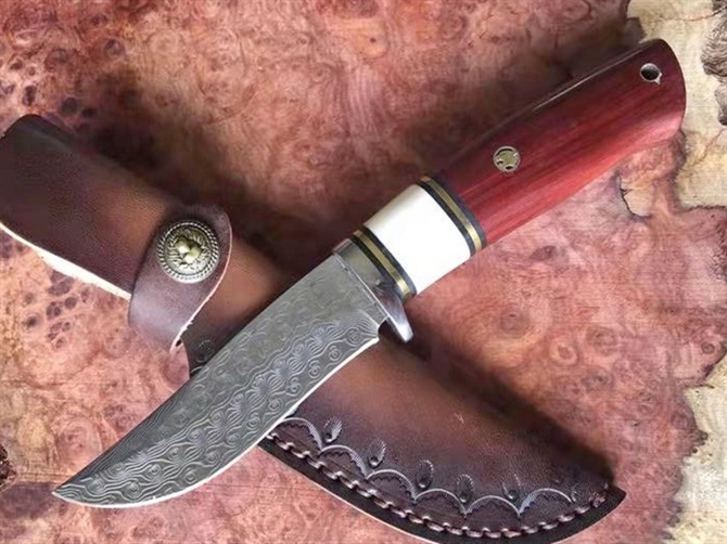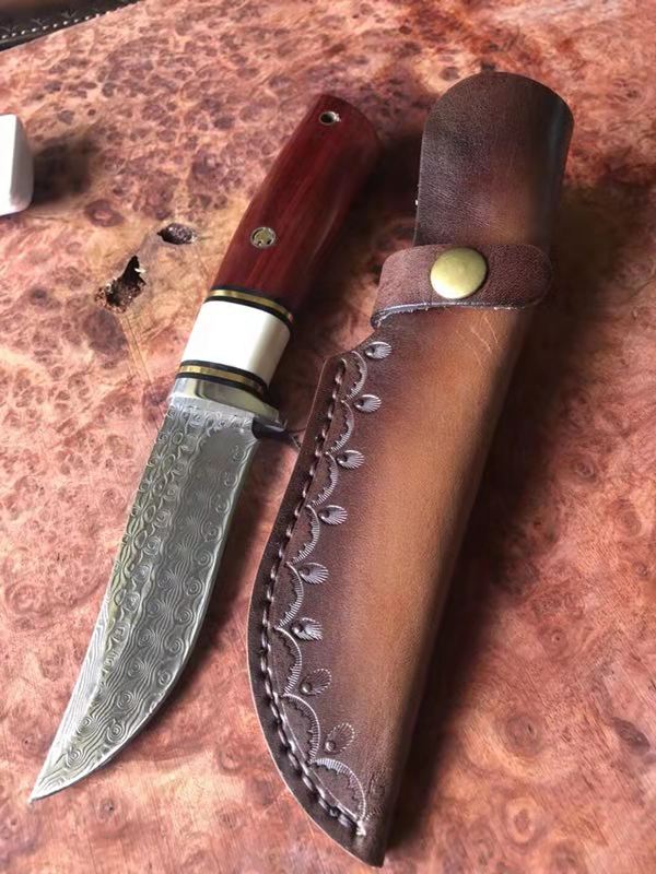 大马士革山神直刀 总长:230mm 刃长:105mm 柄长:125mm 净重:180克(不含包装) 刃材:日本进口67层大马士革钢 柄材:采用进口木材(黄檀木+牛骨+铜垫) 钢头:采用模具钢和铜片和G10垫 硬度:59-60HRC 处理方式:深冷真空热处理 包装:高档纸盒 钉米:采用龙头铜钉,立体感更好更完美 这是一款户外和收藏的好玩具小直刀 值得选择