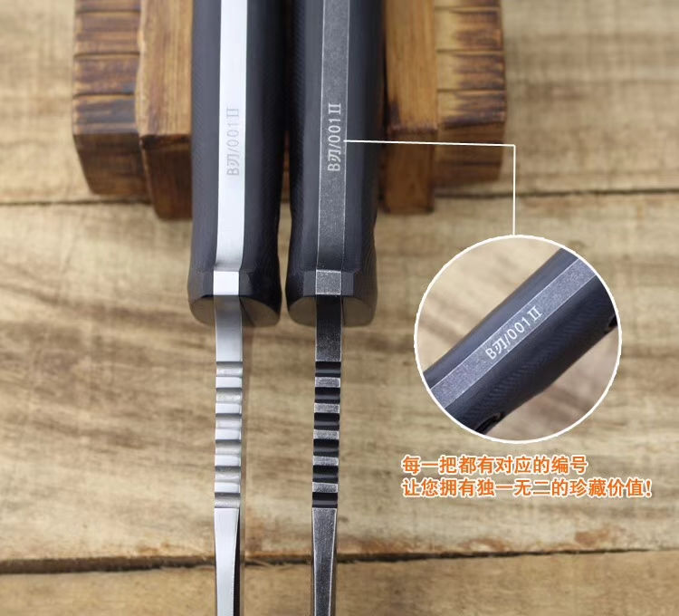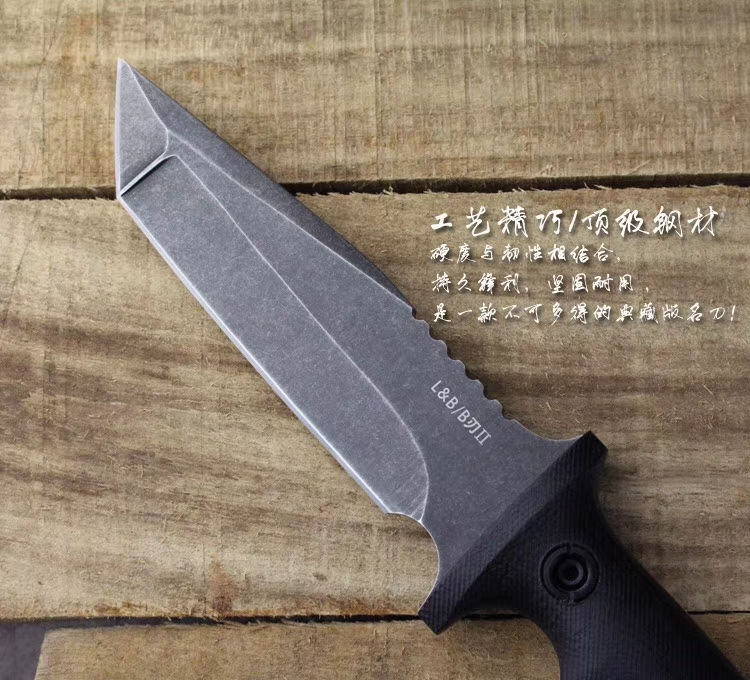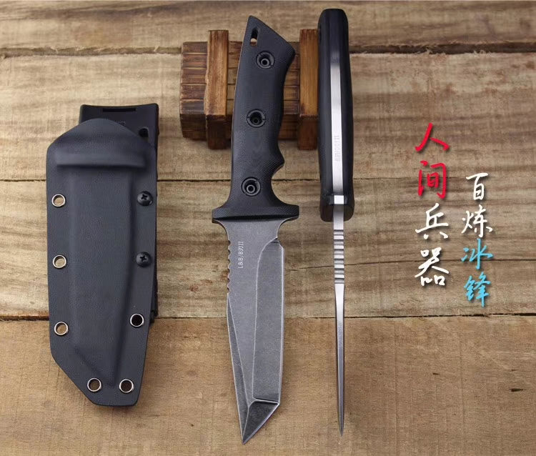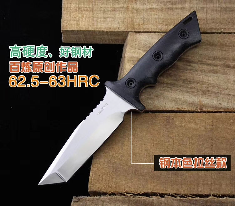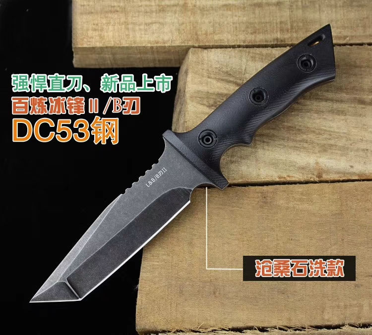 百炼冰锋二代DC53钢直刀 总长:26.5cm 刃长:13.3cm 刃厚:6mm 刃宽:3.5cm 钢材:进口DC53钢 硬度61-63HRC,真空深冷热处理 柄材:G10 刀套:进口战术K鞘 真材实料进口DC53钢,硬度达到62HRC