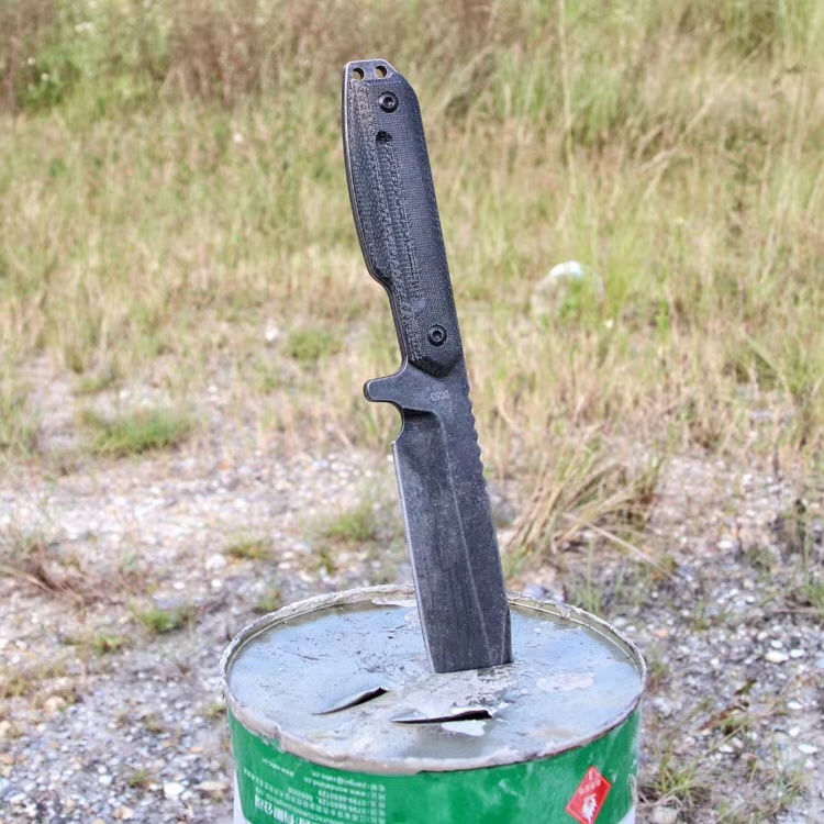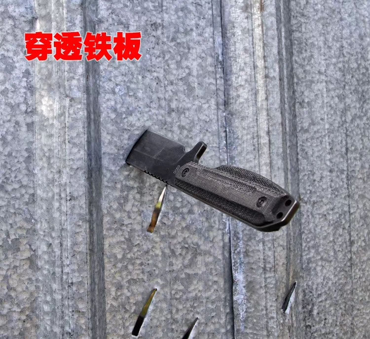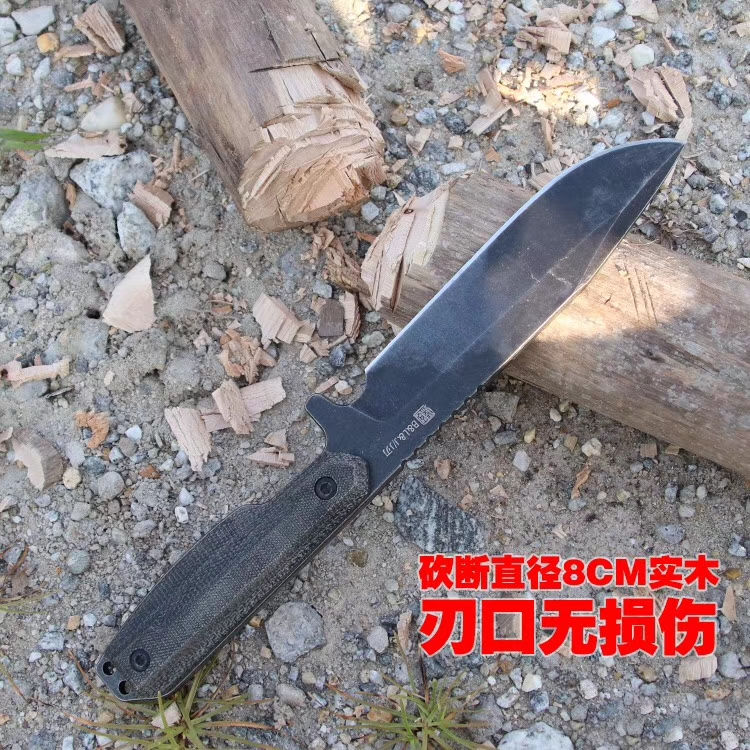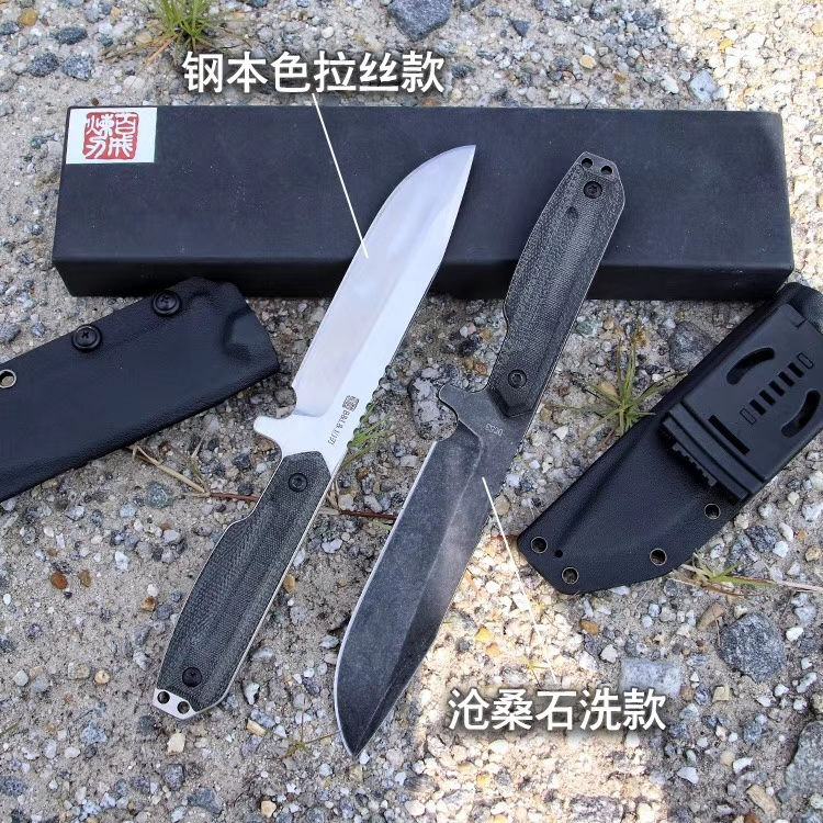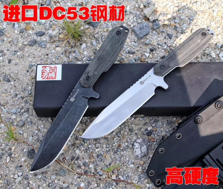 百炼机械战警DC53钢直刀 总长:28cm 刃长:15.5cm 刃厚:5mm 刃宽:3.6cm 钢材:进口DC53钢 硬度:61-63HRC,真空深冷热处理 柄材:亚麻材质、吸汗、速干、防滑 刀套:进口战术K鞘 亚麻手柄,真材实料进口DC53钢,硬度达到62-63HRC