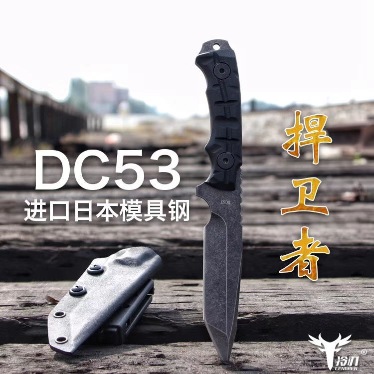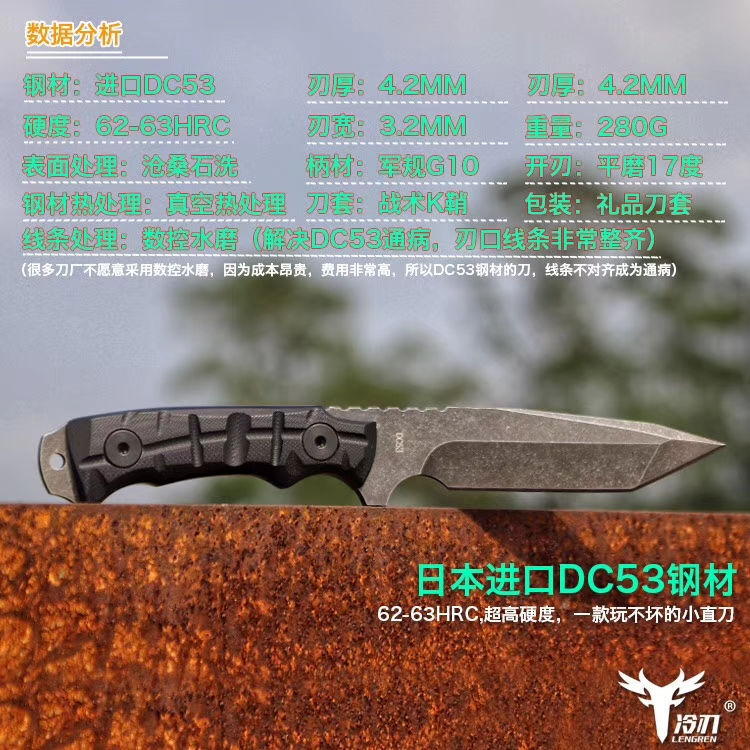 原创设计冷刃捍卫者,一款玩不坏的战术小直刀,限量100把,纯正进口日本DC53钢材,硬度62-63HRC,设计理念以锋利与硬度并存为主,真空深冷热处理,值得一提的是,采用先进的精准数控水磨,刃面两边的线条对称、对齐,解决了DC53线条不对称的通病,表面石洗处理,真空离子镀,再石洗,形成了一次非常坚固的表面涂层,17°角二次水冷开刃,刃口非常锋利,军规战术G10手柄,沟槽凹凸质感防滑,彰显战术风格,战术方头设计,具有极强的穿透力,搭配K鞘刀套,称作一款“玩不坏”的户外战术直刀