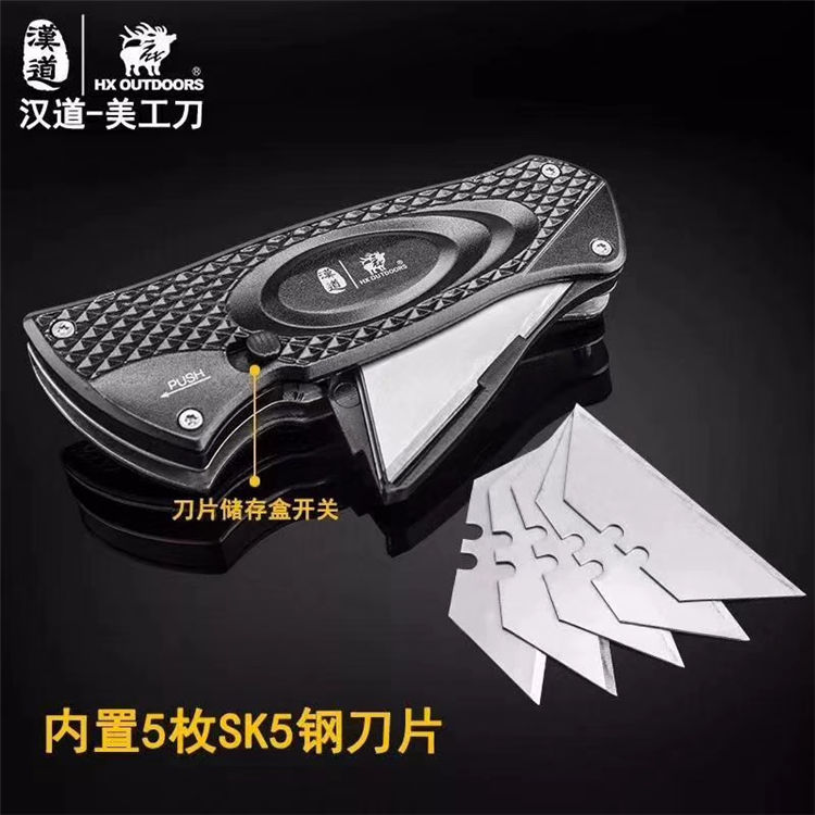 汉道美工刀 刀片用材SK5钢,手柄用材铝合金,手柄设置刀片储存盒,内置5枚刀片,刀、柄分离,可通过刀片拆卸开关拆装,刀片磨损可随时拆换,手柄设置简易背夹,随身便携