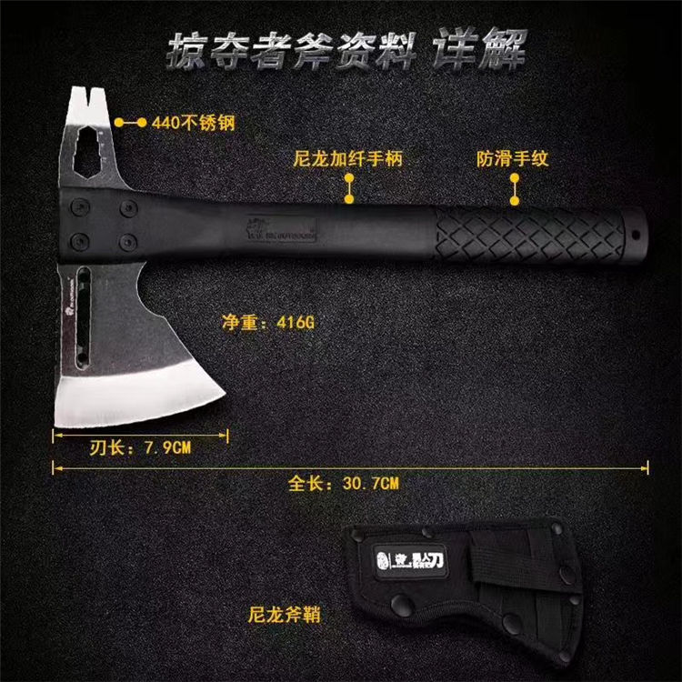 用材440不锈钢,设计斧刃、起钉器、六角螺母(8/10/12号),尼龙加纤手柄,柄尾设计防滑手纹,配备尼龙斧鞘,可佩挂携带,护刃安全