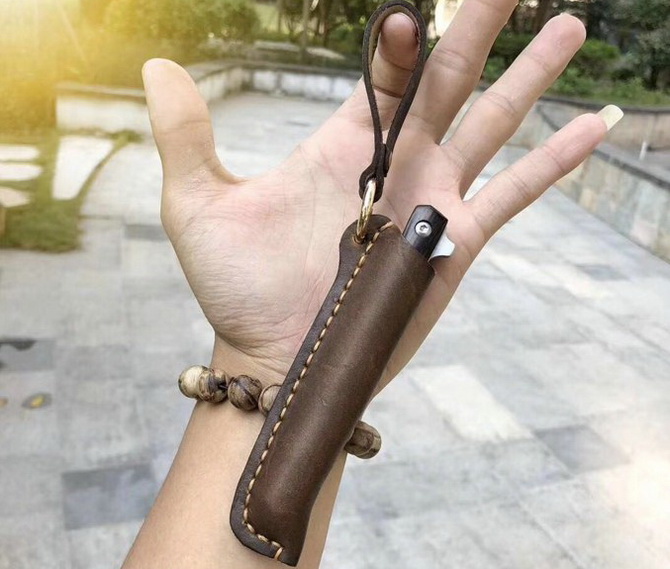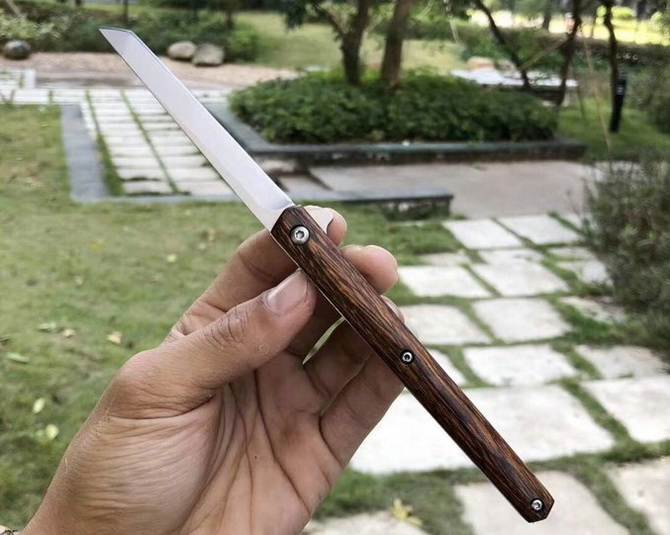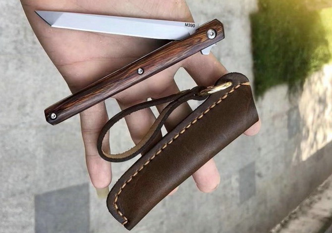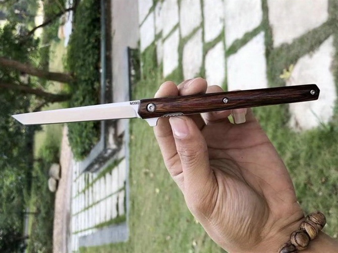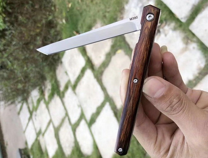 神钢M390粉末T头小神笔折刀 全长:205MM 刃长:90MM 刃宽:12MM 折合长:105MM 刃厚:2.9MM 硬度:60-61HRC 柄材:美国沙铁木 净重:48克左右 包装:简便式手工皮套+精美手工盒子