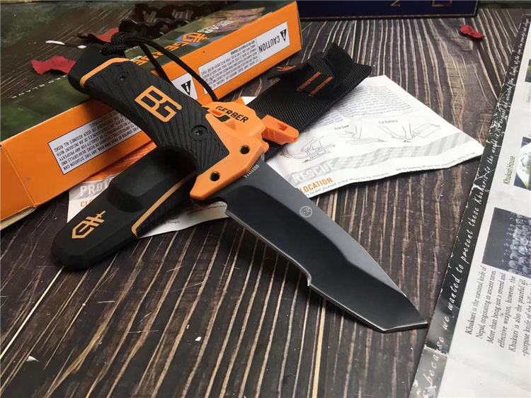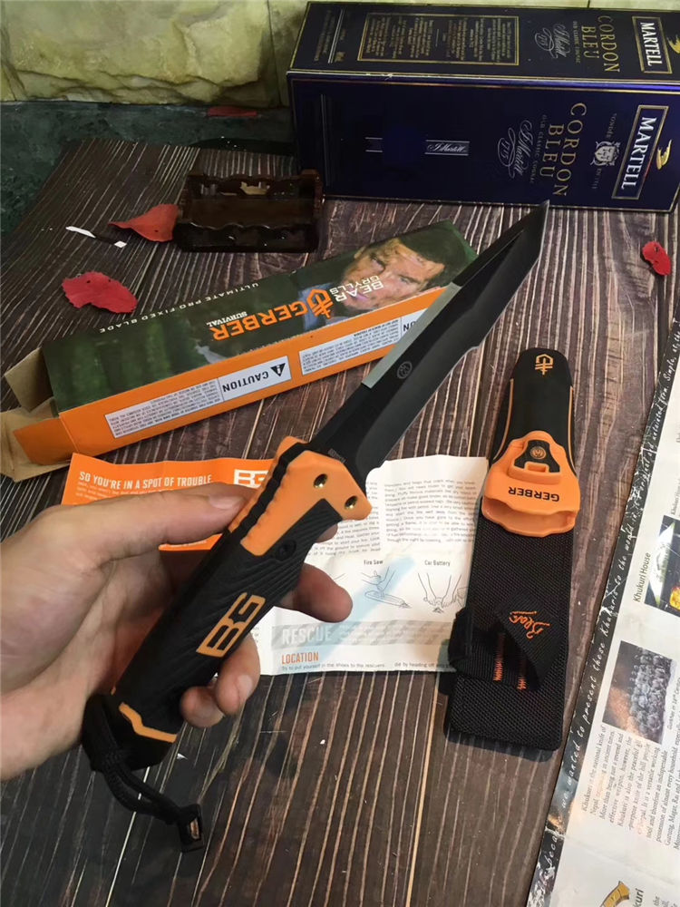 贝尔第三代终极生存刀 类型:中型 全长:25.2cm 刃长:12.2cm 刃厚:5mm 刃材:7CR 柄材:尼龙+橡塑(手感柔软舒适、防滑) 硬度:58Hrc 表面:黑钛离子 刀套:ABS鞘+尼龙套 刀重:450g 总重:500g 刃区:机械刃/切削 配件:打火棒、哨子,原纸盒装,说明书
