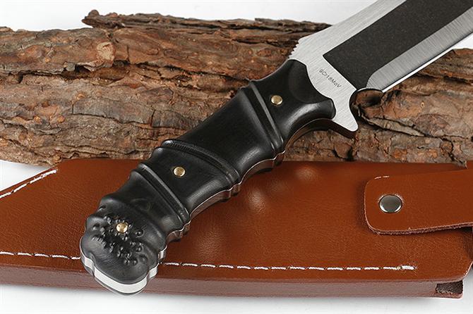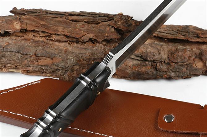 丛林之狼直刀 品牌:丛林之狼 全长:29.0cm 刃长:18cm 柄长:11cm 刃材:9CR18MOV 硬度:58 表面:精细沙光加黑钛石洗伴拉丝 刃厚:0.6cm 柄材:全CNC电脑锣一体全钢手柄,两边爽天然黑檀木. 刀重:332克 总重:440克 刀鞘:高密真皮套 其他:刃口锋利,原厂包装.全刀是CNC线切割,采用9CR19MOV钢材 品质:出口品质,贴牌代工