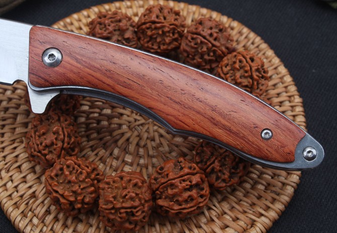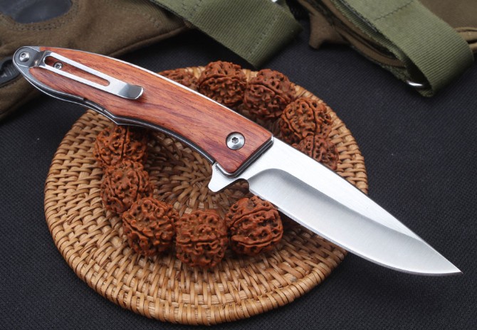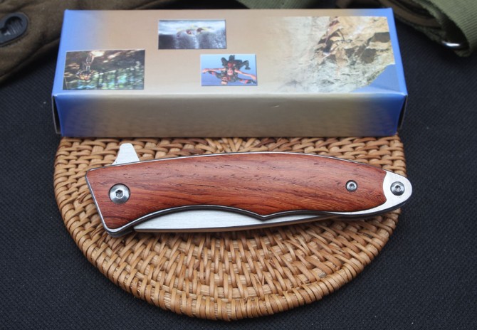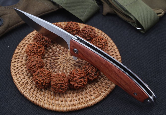 百灵鸟轴承快开折刀 全长:19cm 刃长:8.2cm 柄长:10.8cm 刃宽:2.4cm 刃厚:3.2mm 刃材:8CR18MOV 重量:125g(含包装) 硬度:57-58HRC 表面:精细沙光 柄材:天然花酸枝木和G10两款 锁型:侧锁快开,内置轴承 其他:彩盒