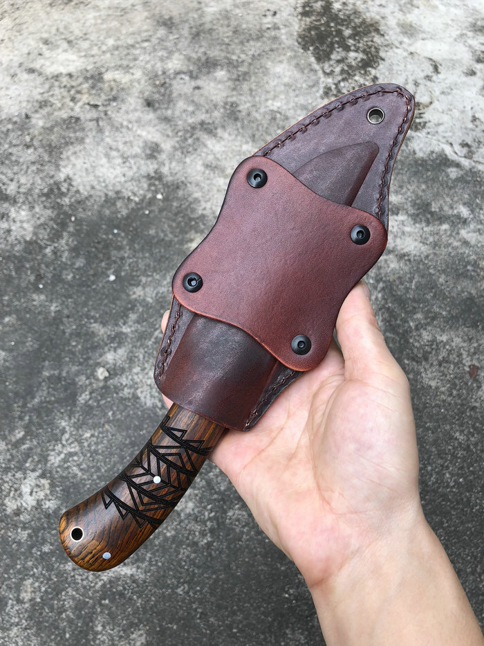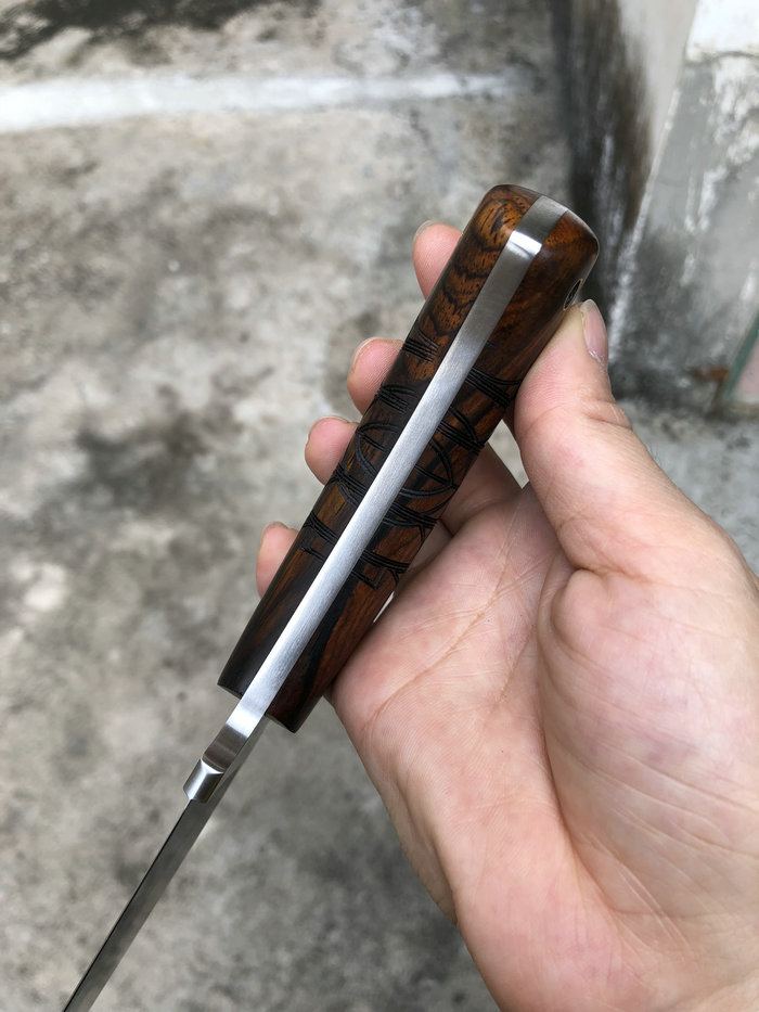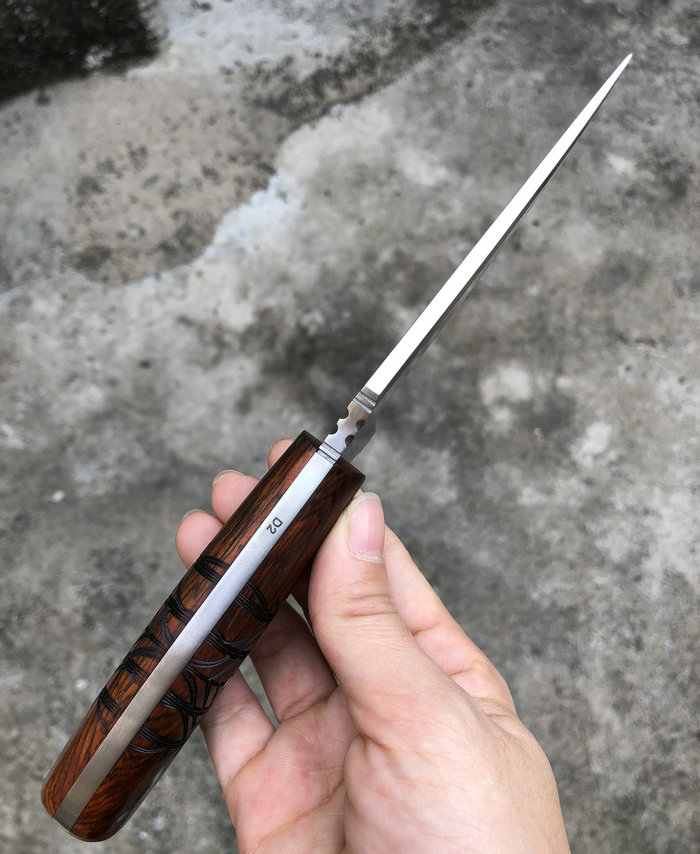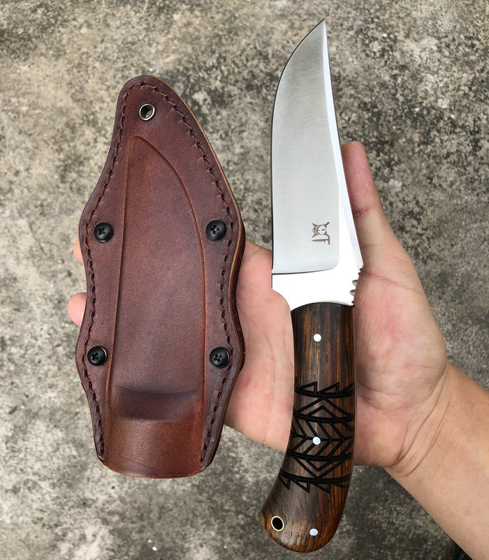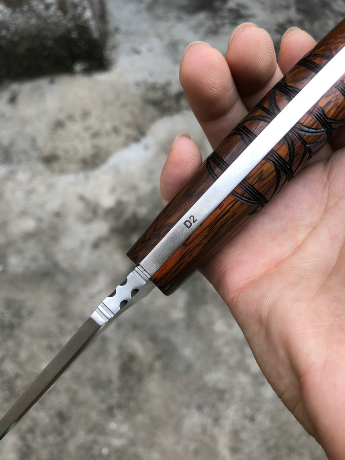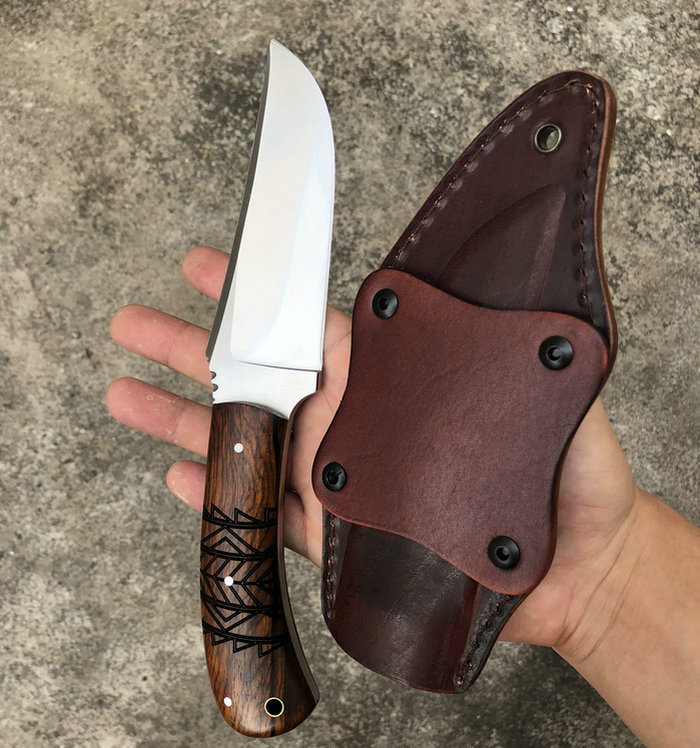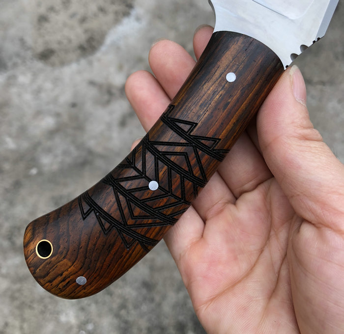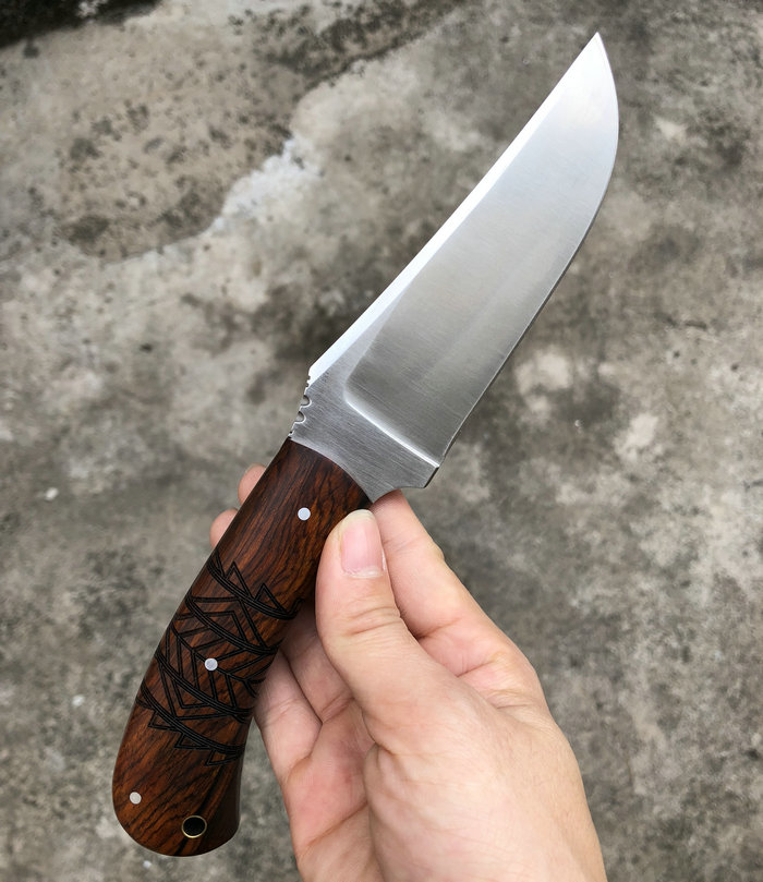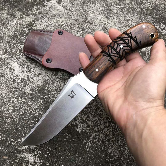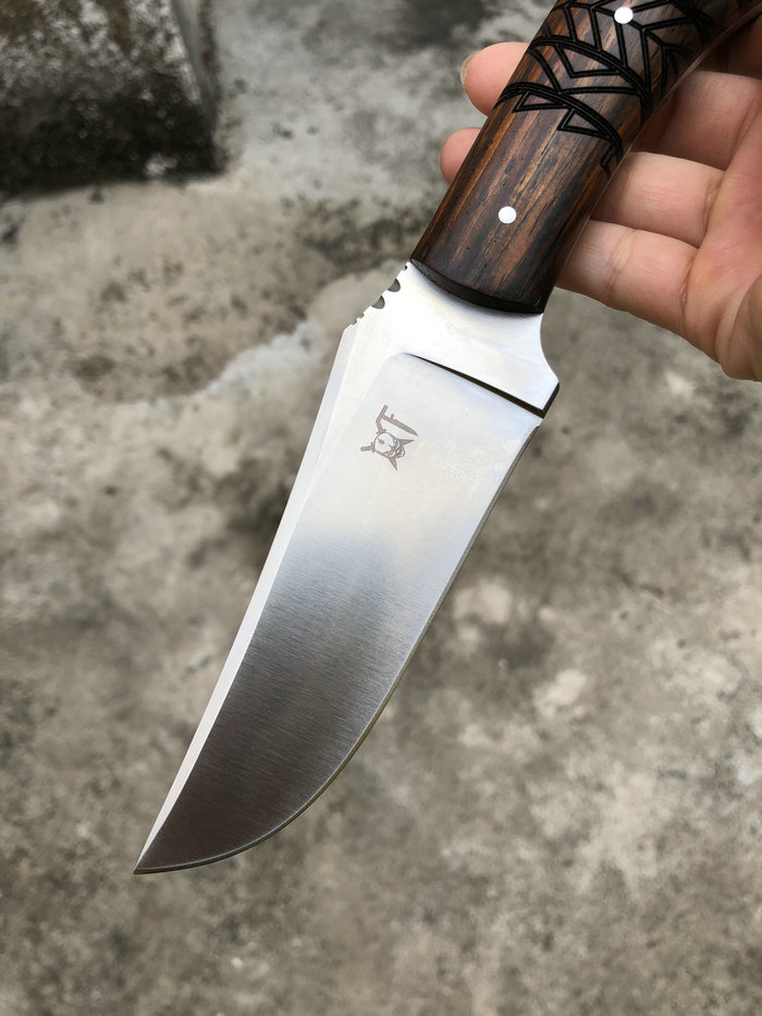 华匠坊温克勒D2钢直刀 全长:230MM 刃长:120MM 柄长:110MM 厚度:4.5MM 硬度:60 真空油率本刀有两条表面处理砂光配微粒黄檀柄,刻印第安纹(配皮套)木柄是微粒黄檀柄,这儿就不祥细介绍了,有兴趣的可以百度.本刀细节该倒角的有倒角,开背齿的比较有难度,尽可能和原品一致木柄刻印第安纹包浆后比较好看,也有防滑作用