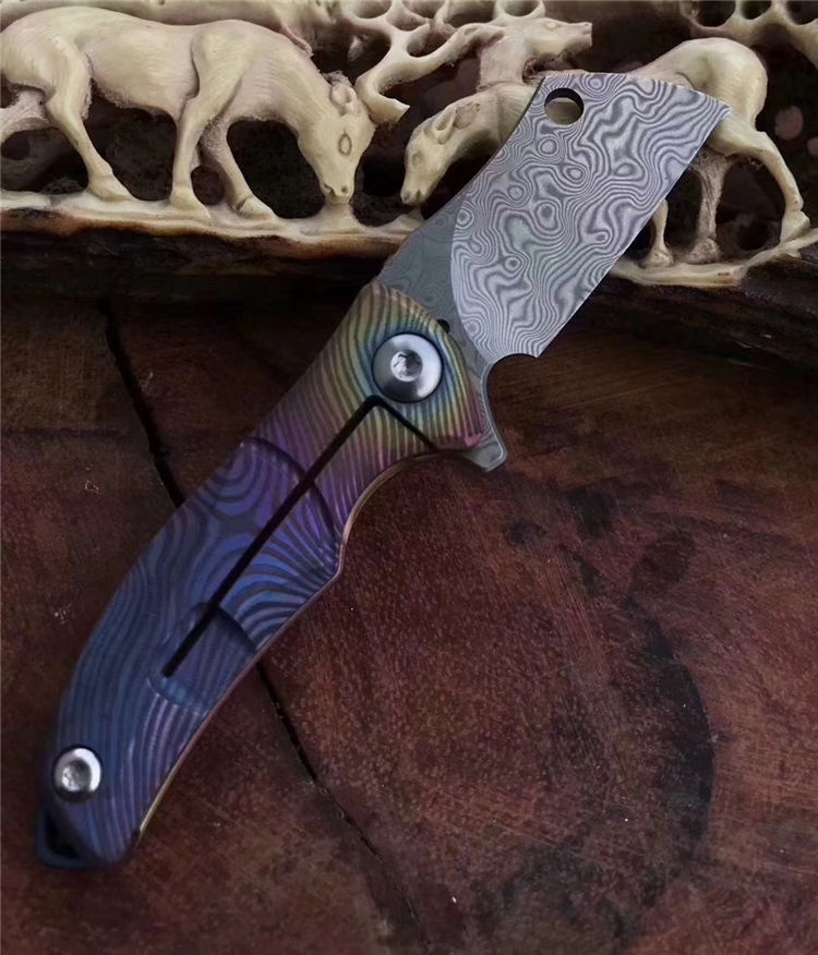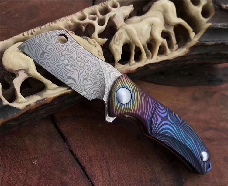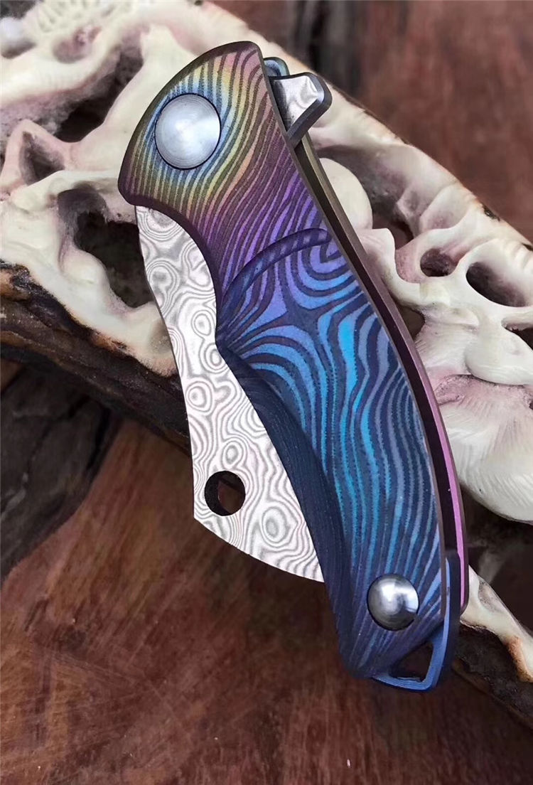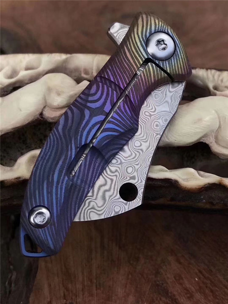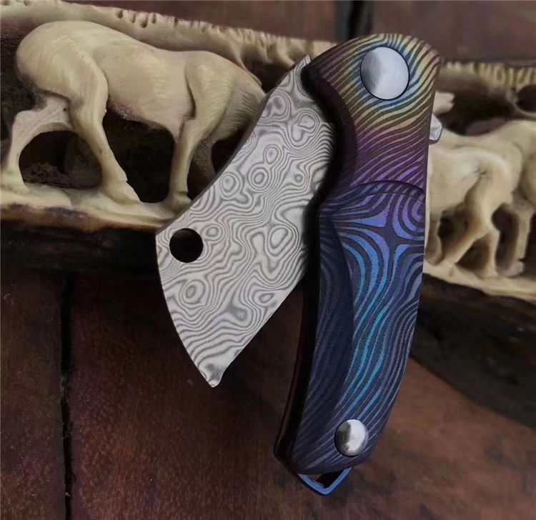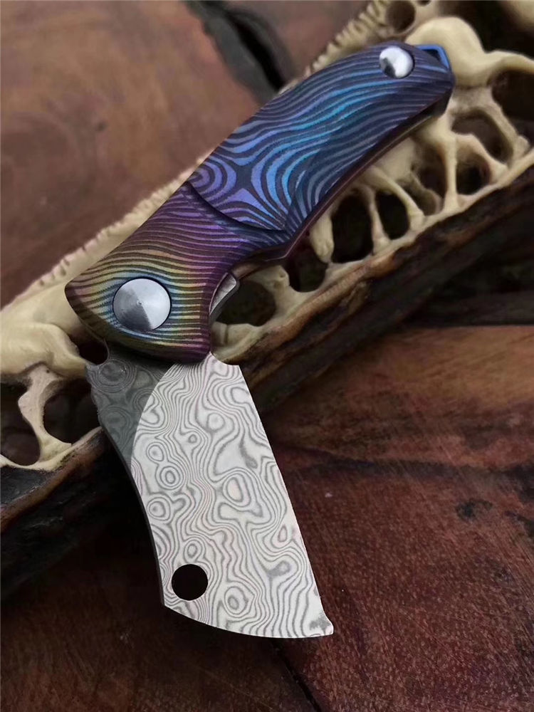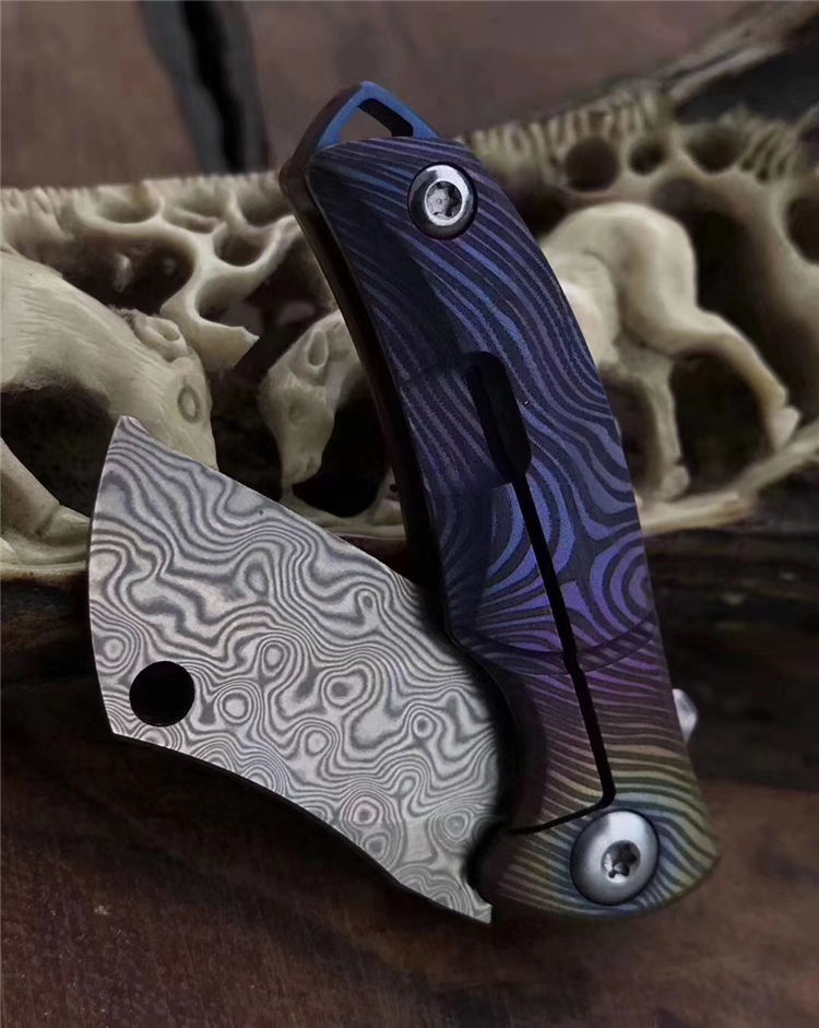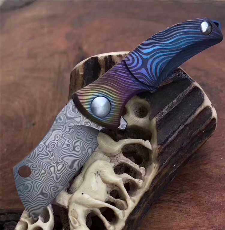 vinland屠夫花纹钢小折刀 全长:8.8cm 刃长:3.1cm 刃宽:1.6cm 刃厚:2.5cm 柄长:5.2cm 硬度:58-59HRC 净重:19.8g 柄材:钛合金