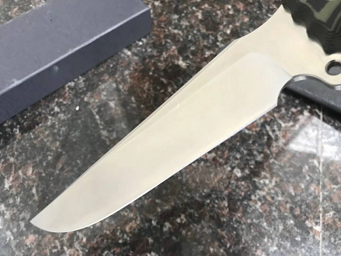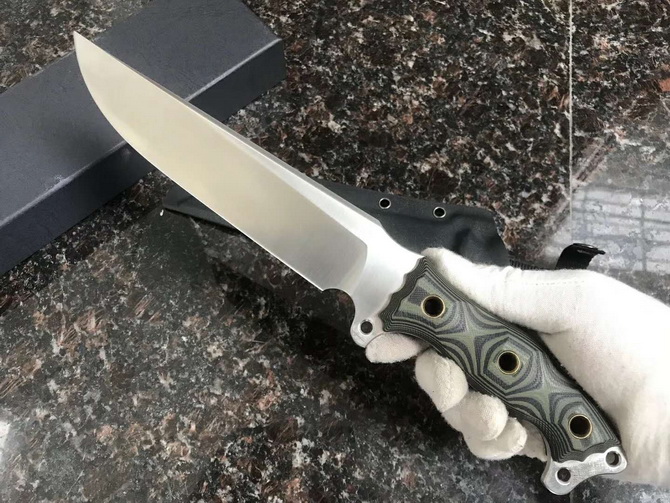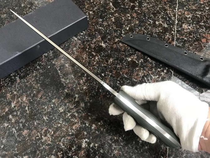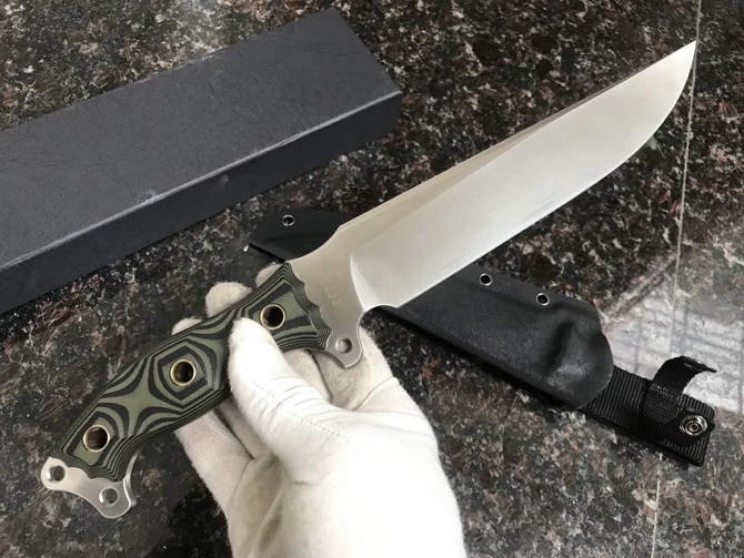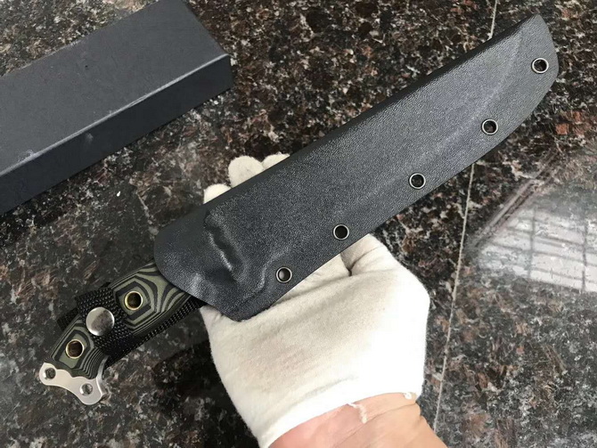 野牛暴怒直刀 全长:328mm 柄长:120mm 刃长:208mm 刃厚:5mm 刃宽:42mm(最宽处) 刃材:DC53 重量:500g(刀净重,不含鞘) 硬度:59-60HRC 柄材:黑夹层G10 刀鞘:美国进口Kydex 磨式:数控V磨 表面处理:精细石洗 热处理:真空油淬(增加晶体颗粒细腻度具有最好的韧性) 包装:黑色礼品盒