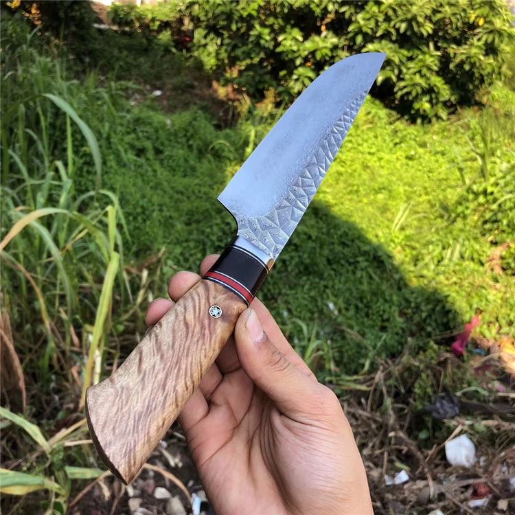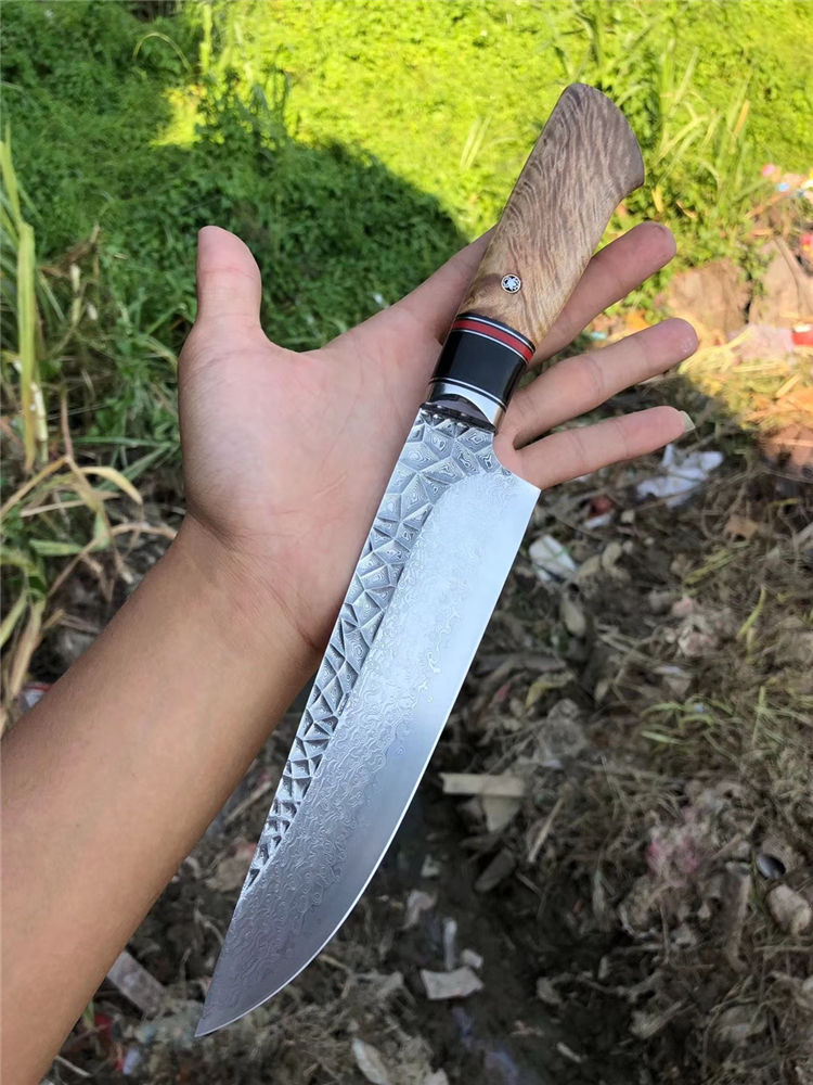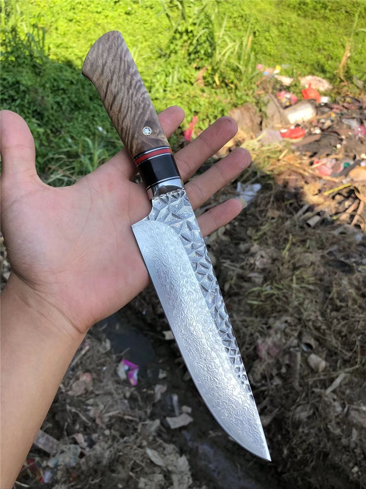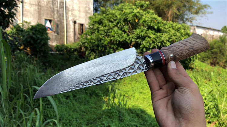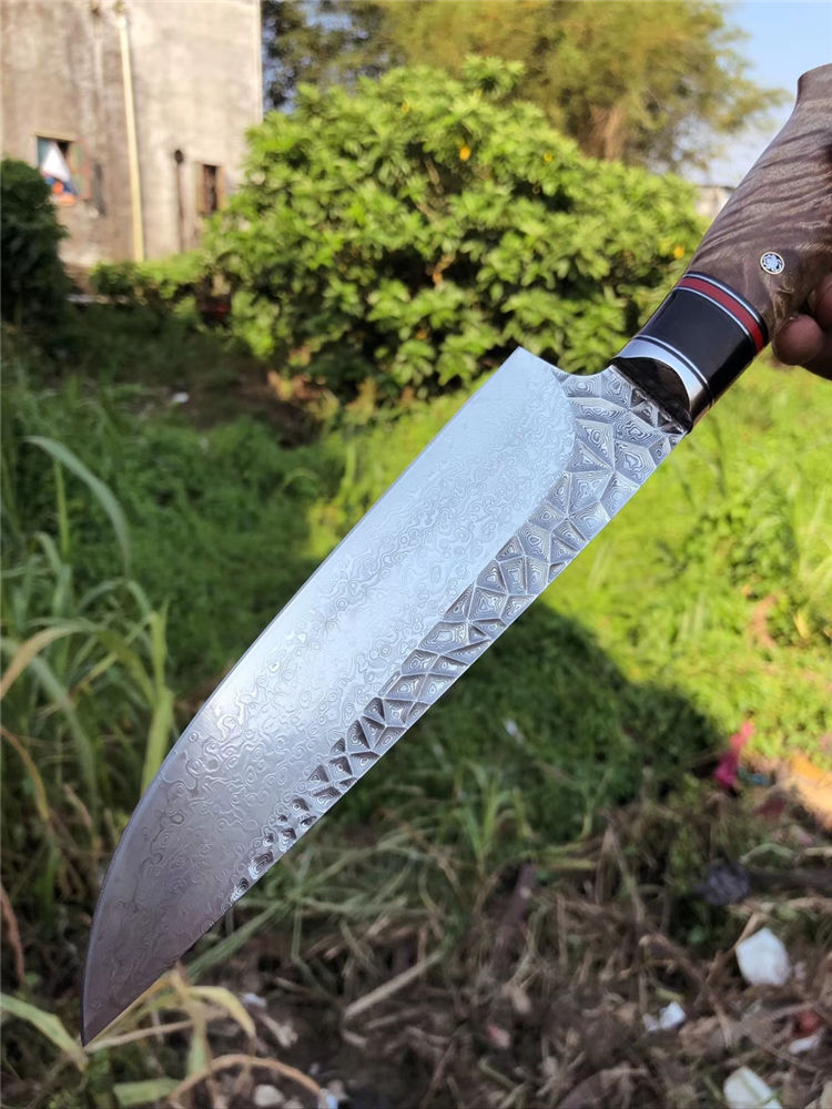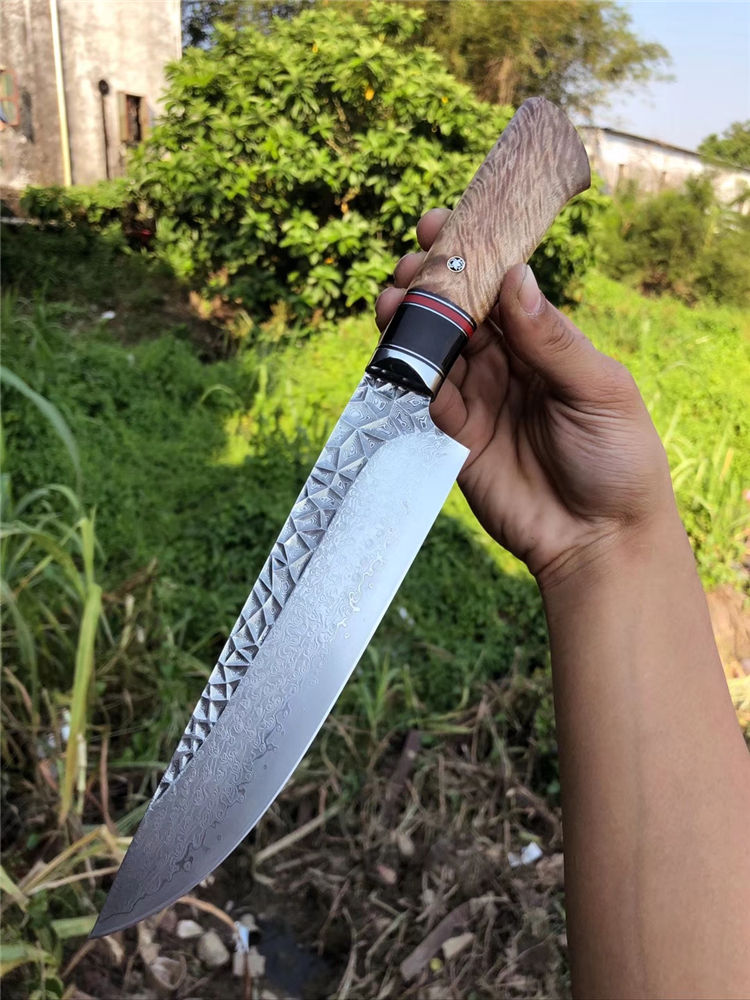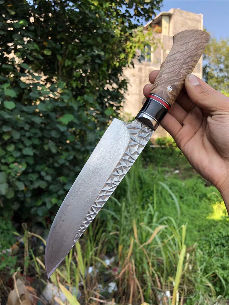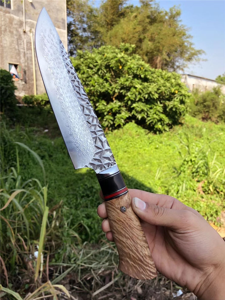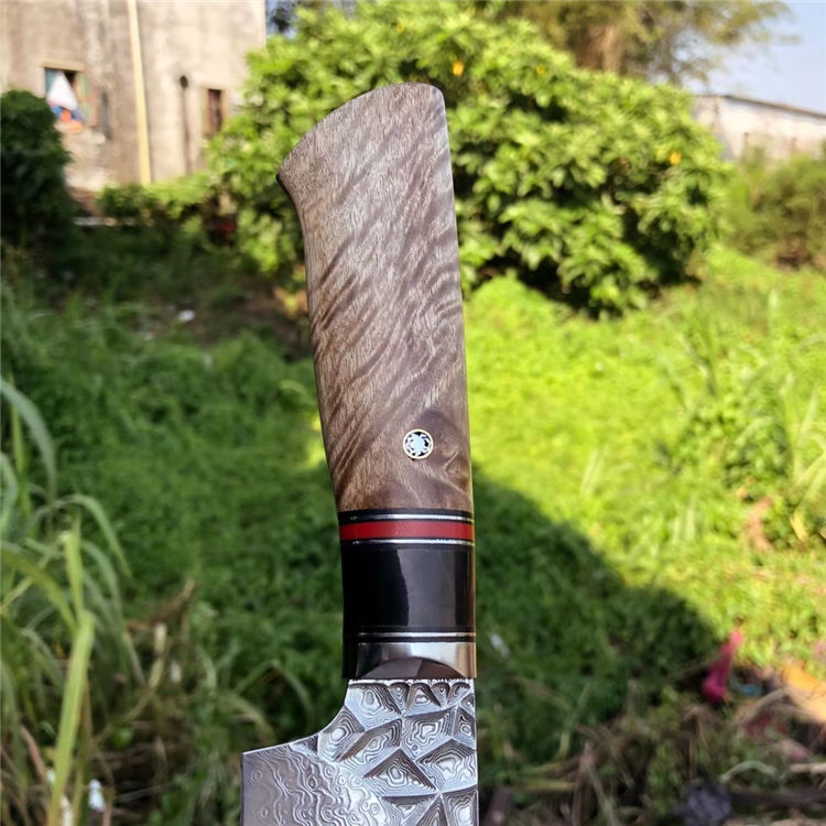砖石高档厨刀 总长:31.5cm 刃长:19cm 刃厚:2.4mm 刃宽:4.5cm 钢材:日本夹层大马士革钢(钢芯层67层VG10钢) 表面:抛光效果雕刻砖石纹工艺 热处理:真空热处理 硬度:58-60HRC 柄材:精挑进口白影木材+黑花牛角+G10片 包装:手工盒子包装 老师傅纯手工制作/每一把是独一无二,珍奇白影木材料制作手柄搭配花牛角隔片装饰非常大气,具有很好的收藏价值!送礼佳品