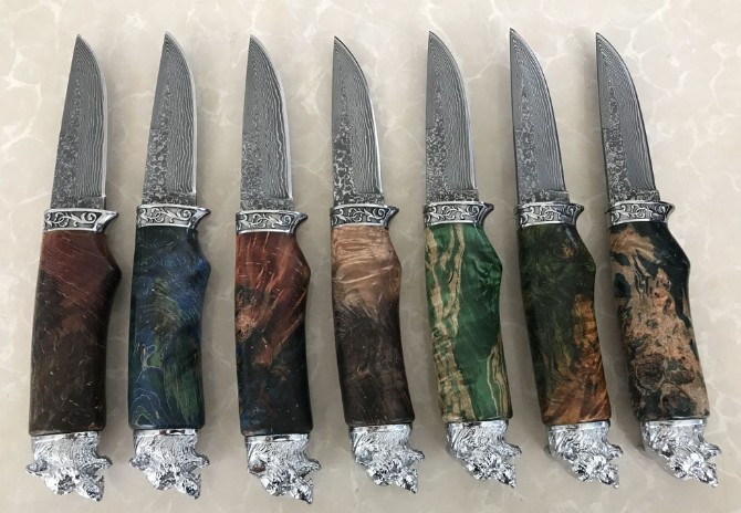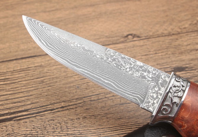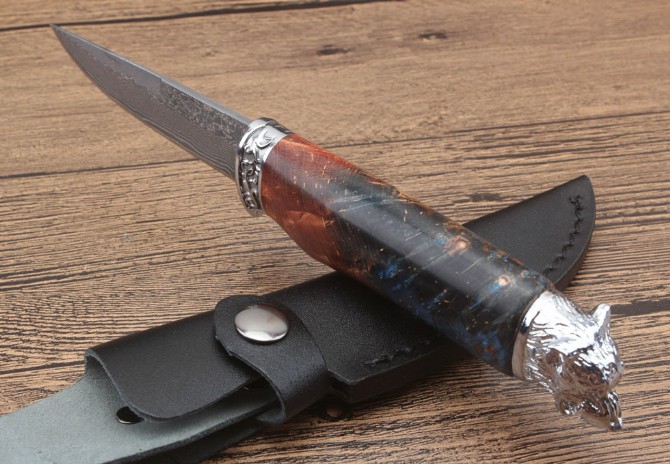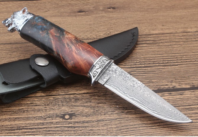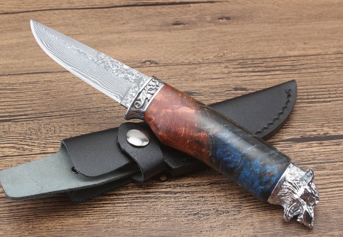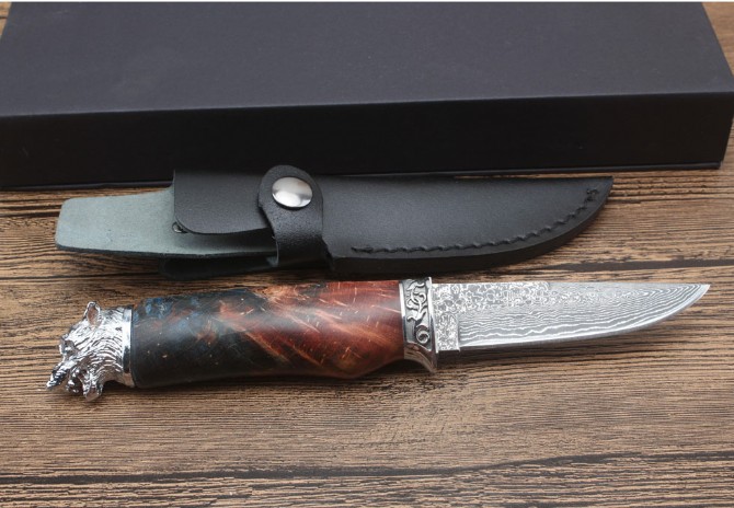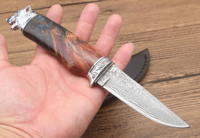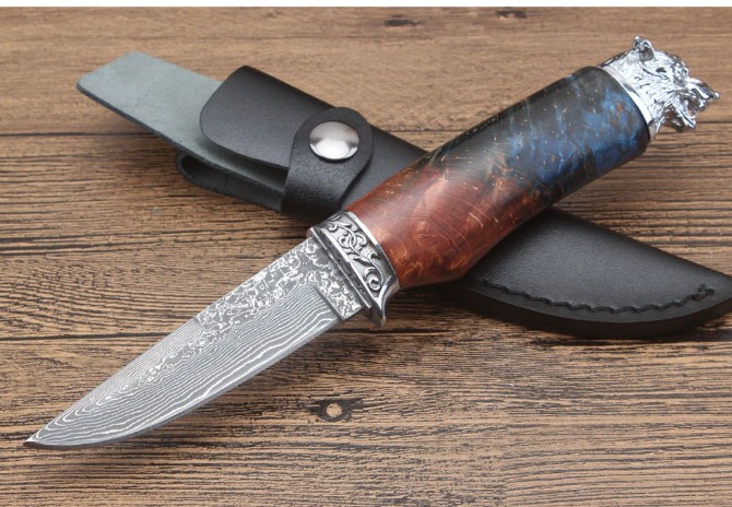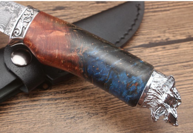 北欧狮头猎刀 全长:228mm 刃长:98mm 柄长:129mm 刃宽:2.5mm 刃厚:3.1mm 刃材:大马士革 重量:409g(含包装) 硬度:58HRC 表面:大马士革原纹 柄材:双钢头雕花狮头+固化木 锁型:定锁 其他:配牛皮套礼品盒注每把固化木颜色纹路不样的