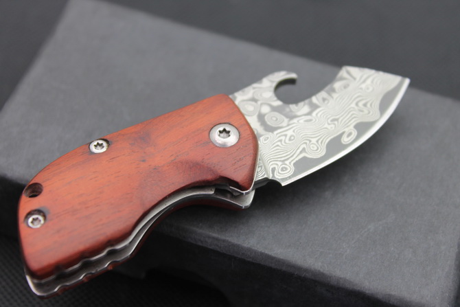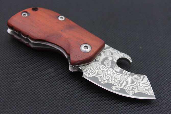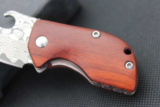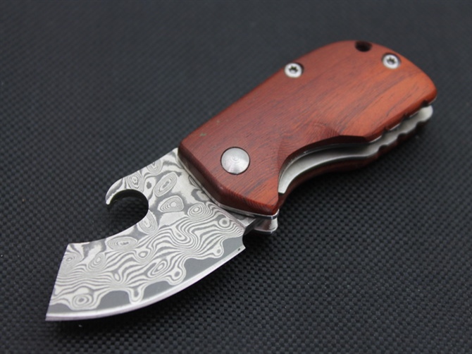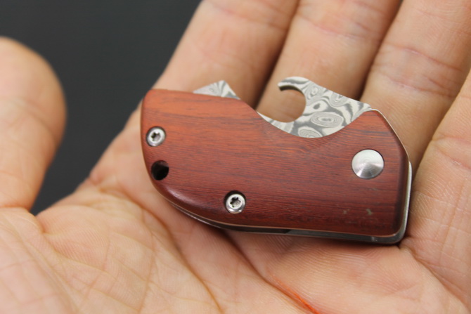 大马士革迷你小折刀 全长:8.8cm 刃长:3.5cm 刃宽:2.4cm(最宽处) 柄长:5cm 刃厚:2.7mm 刃材:大马士革 柄材:红木柄 硬度:59HRC 表面:大马士革 重量:40克(含包装) 锁闭线锁