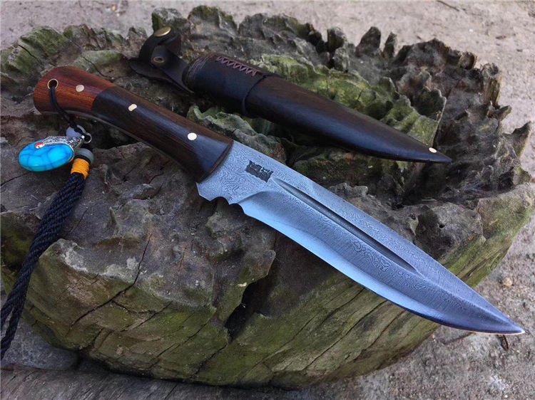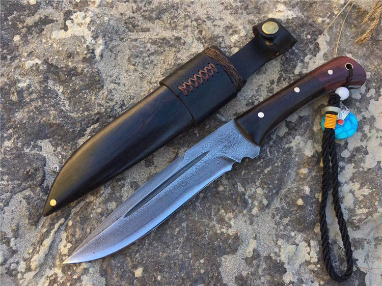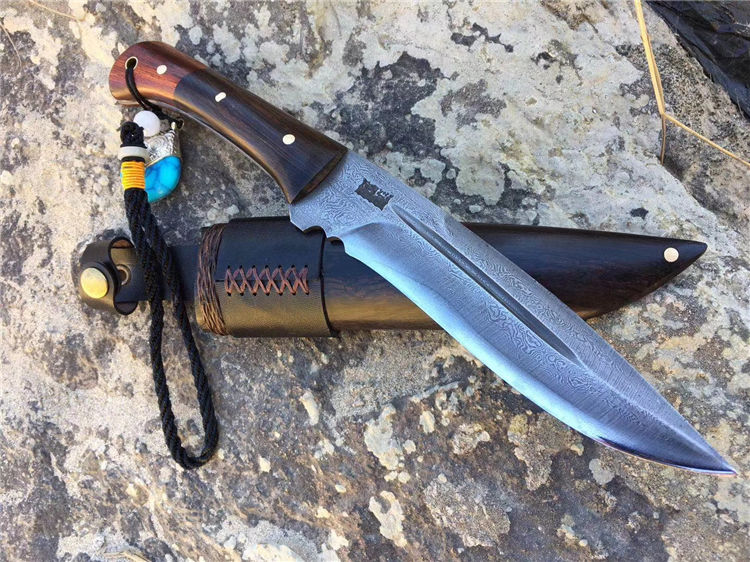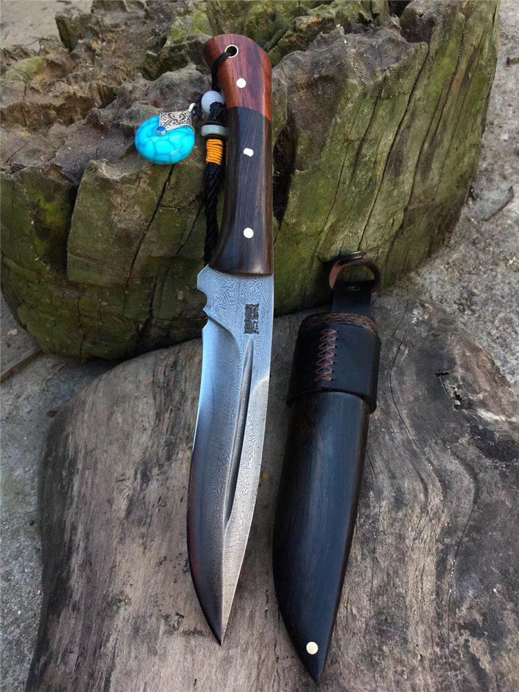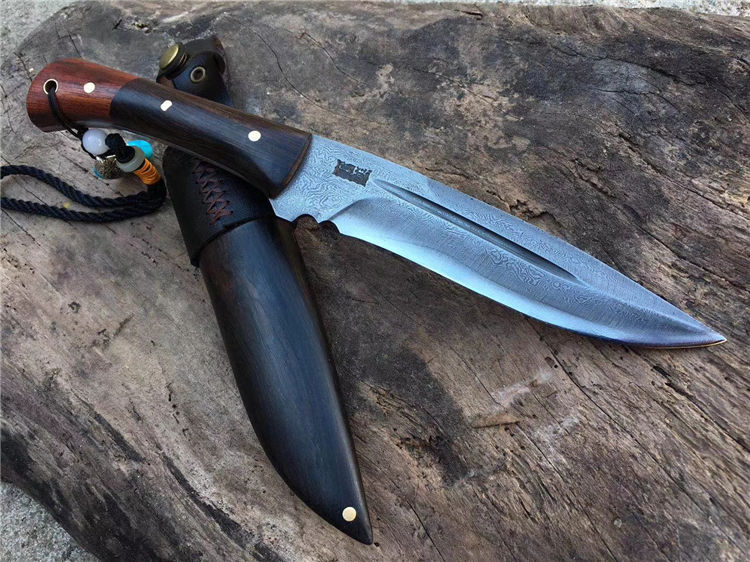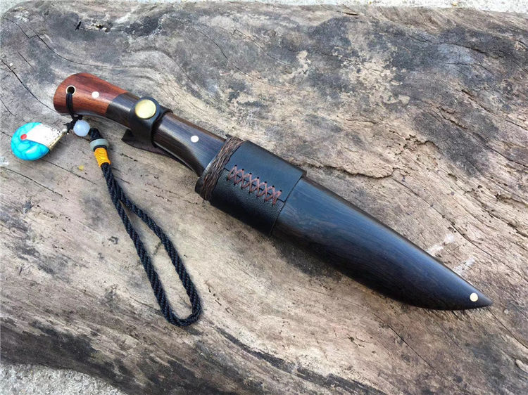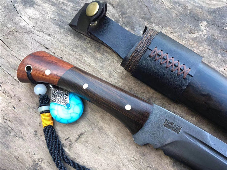 捕猎者户撒刀 全长:27cm 刃长:15cm 把长:11.5cm 刃宽:3cm 工艺:锻打 刃材:百炼花纹钢 护手:黑檀木+红木 鞘材:手工皮套+黑檀木 二次开刃等繁琐户撒手工工序多达几十种!这把刀具的独特魅力当弹尽粮绝之时 枪支再无用武之地此时,刀具便是战士最后的希望,感受着冷兵器之间那份最具野性的搏斗这,就是刀具的魅力之一