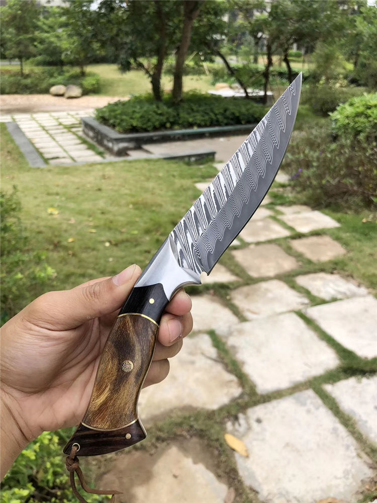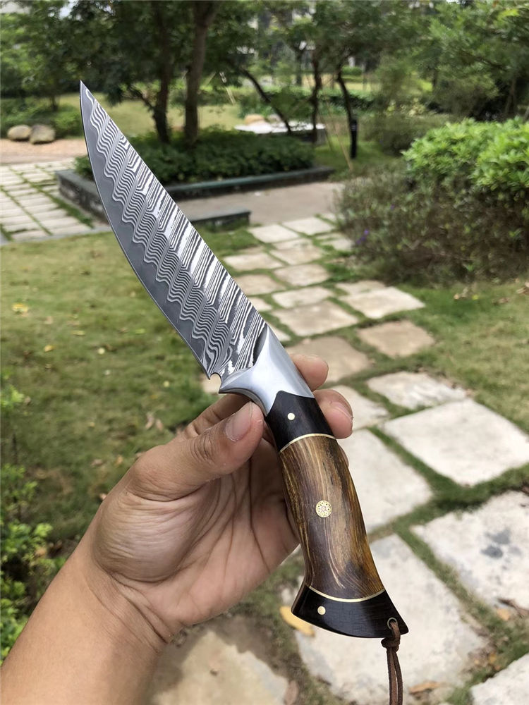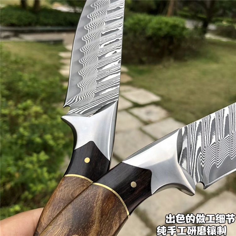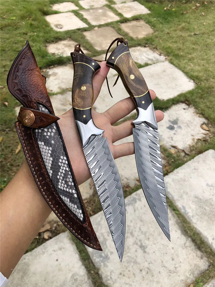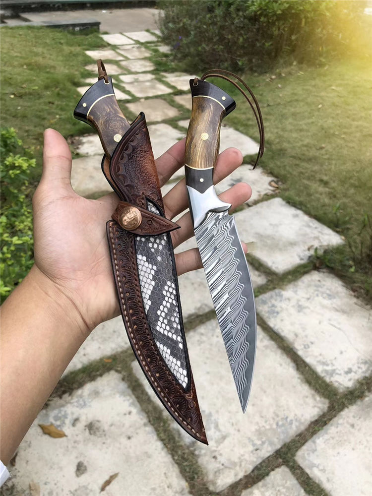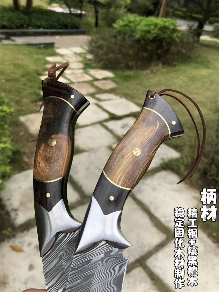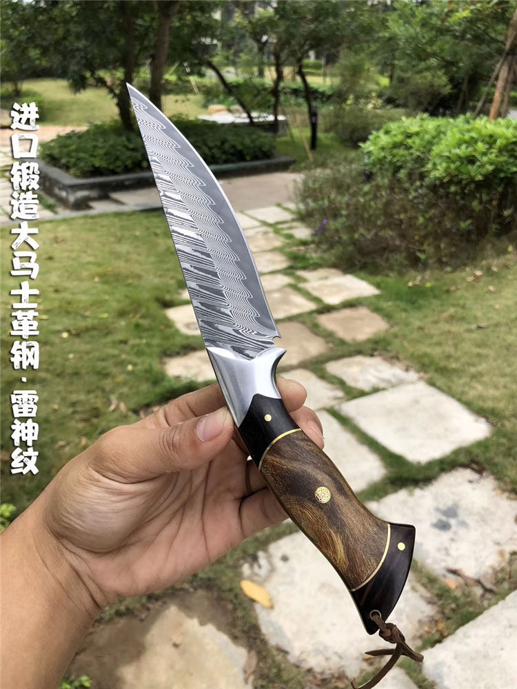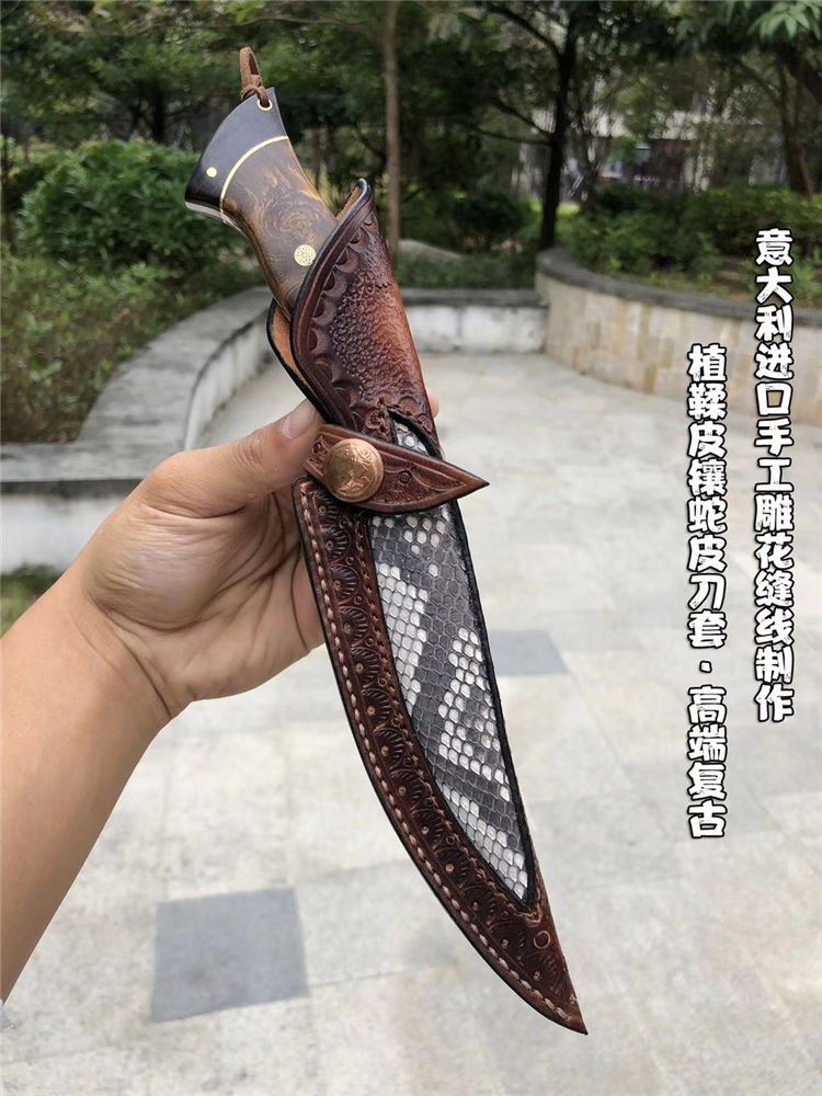 大马士革二郎神二代直刀 全长:26cm 刃长:14cm 手柄:12.5cm 厚度:3.3cm 刃材:锻造大马士革钢 硬度:60-61HRC 厚度:3.5mm 柄材:不锈钢头+黑檀木+稳定固化木 皮套:意大利手工雕花镶嵌蛇皮套 进口锻造大马士革钢(雷神纹)93层,真空热处理,纯手工开刃超级锋利(视频测试可见)一款高端手工制作精品