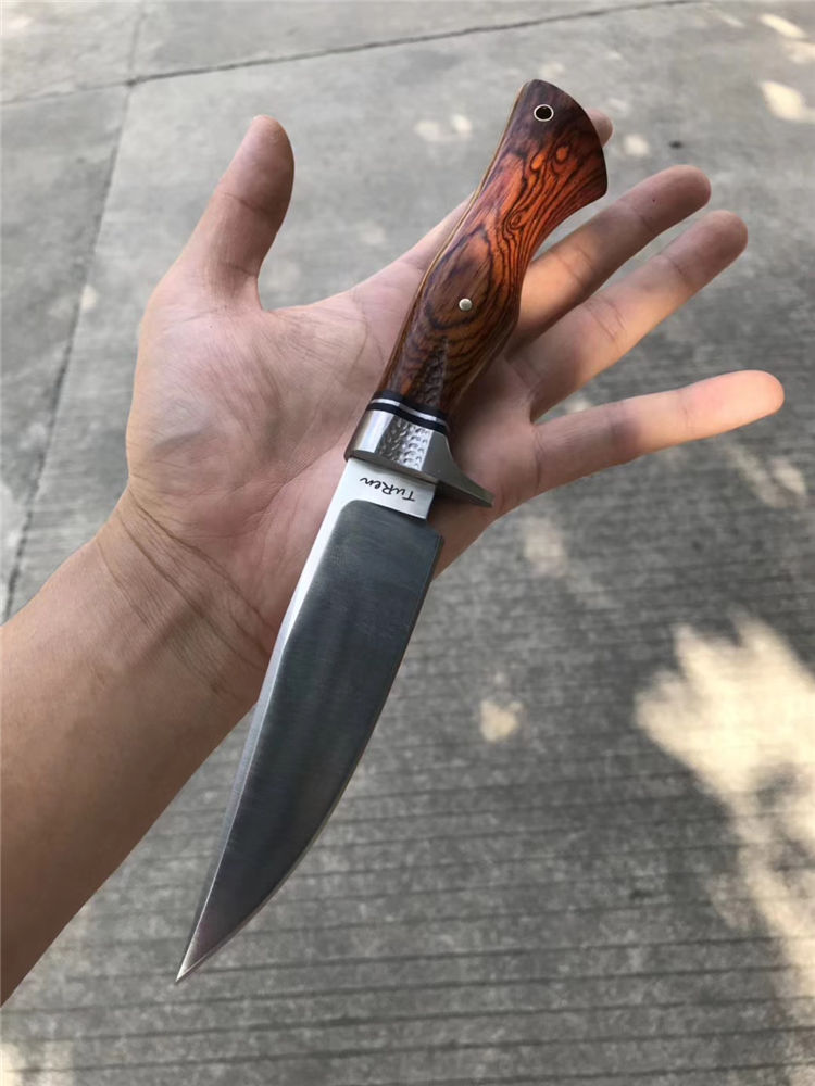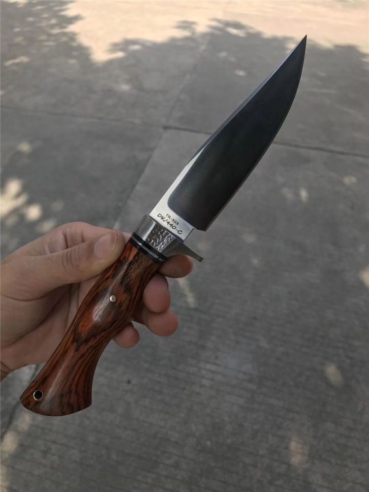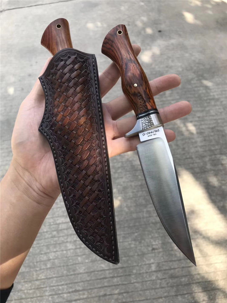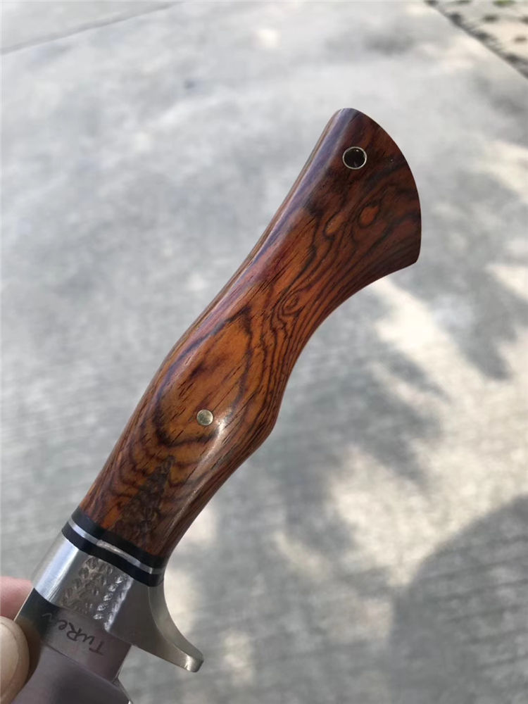 一款带给你超级实用博弈型猎刀,采用美国进口400C钢硬度达到58-59HRC真空热处理,数控CNC加工单面磨,手工打磨!搭配名贵黄檀木手柄,手感很好!出色一面,它搭配一个意大利进口手工雕花缝线植鞣皮!这个皮套效果做工非常好!性价比超级实惠!一把给你真正实用型户外求生猎刀