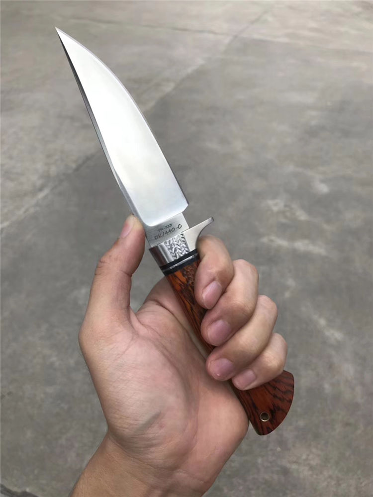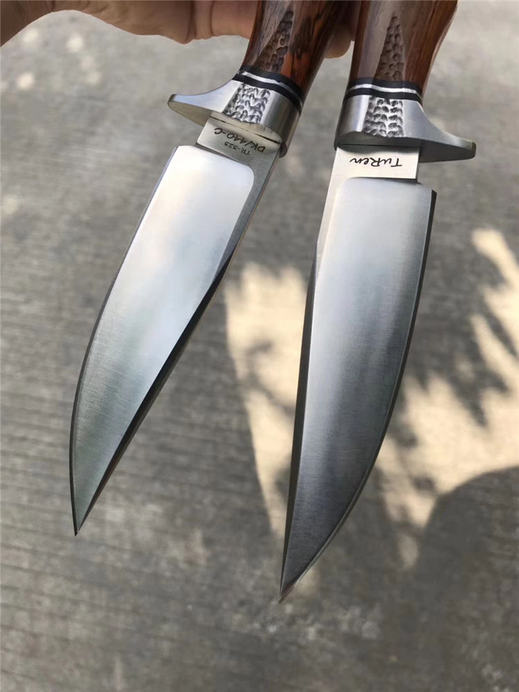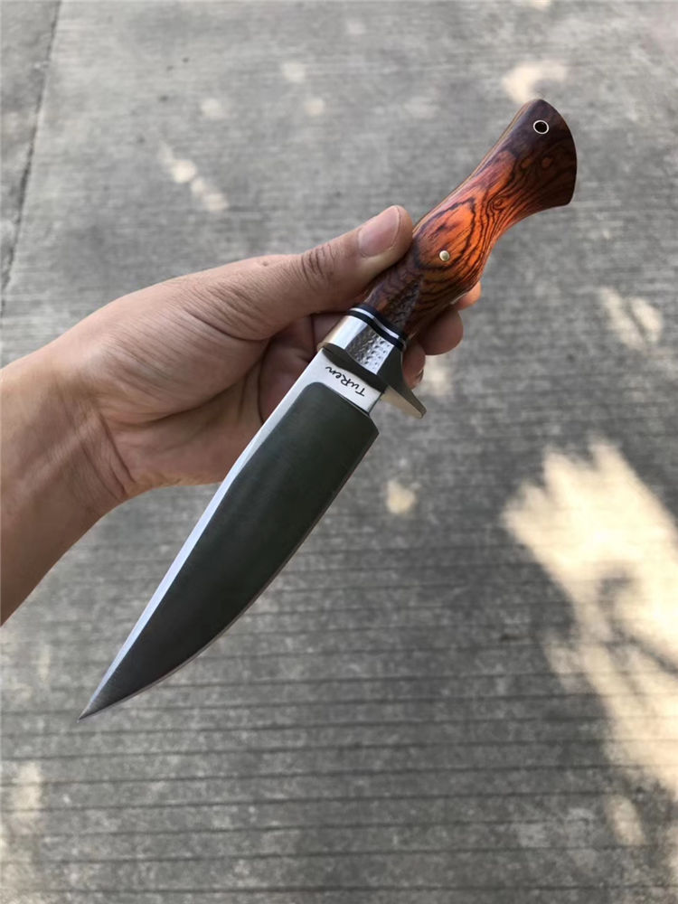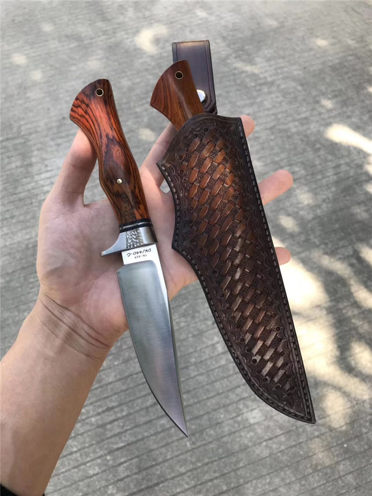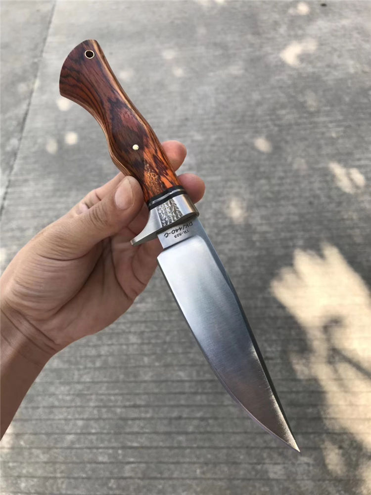 一款带给你超级实用博弈型猎刀,采用美国进口400C钢硬度达到58-59HRC真空热处理,数控CNC加工单面磨,手工打磨!搭配名贵黄檀木手柄,手感很好!出色一面,它搭配一个意大利进口手工雕花缝线植鞣皮!这个皮套效果做工非常好!性价比超级实惠!一把给你真正实用型户外求生猎刀